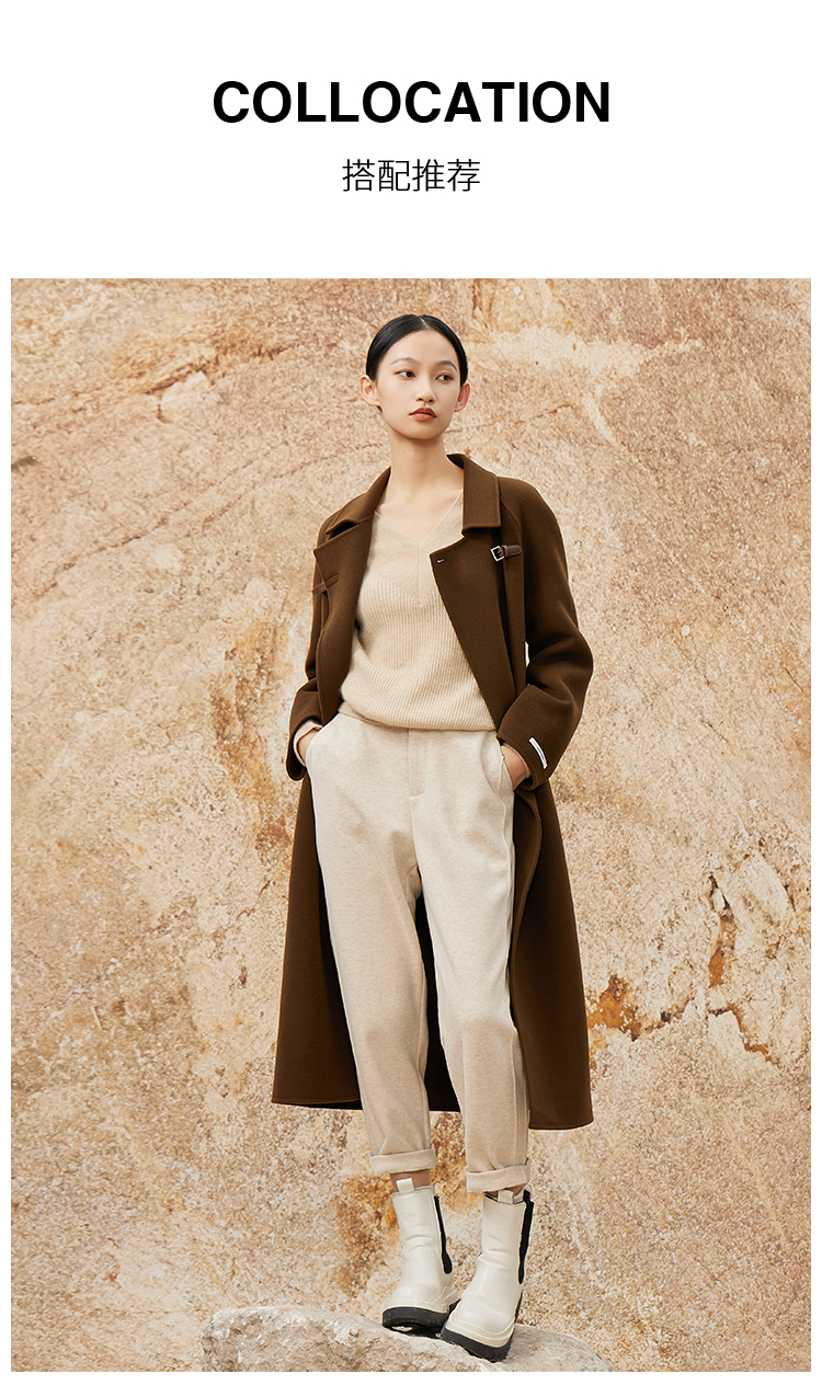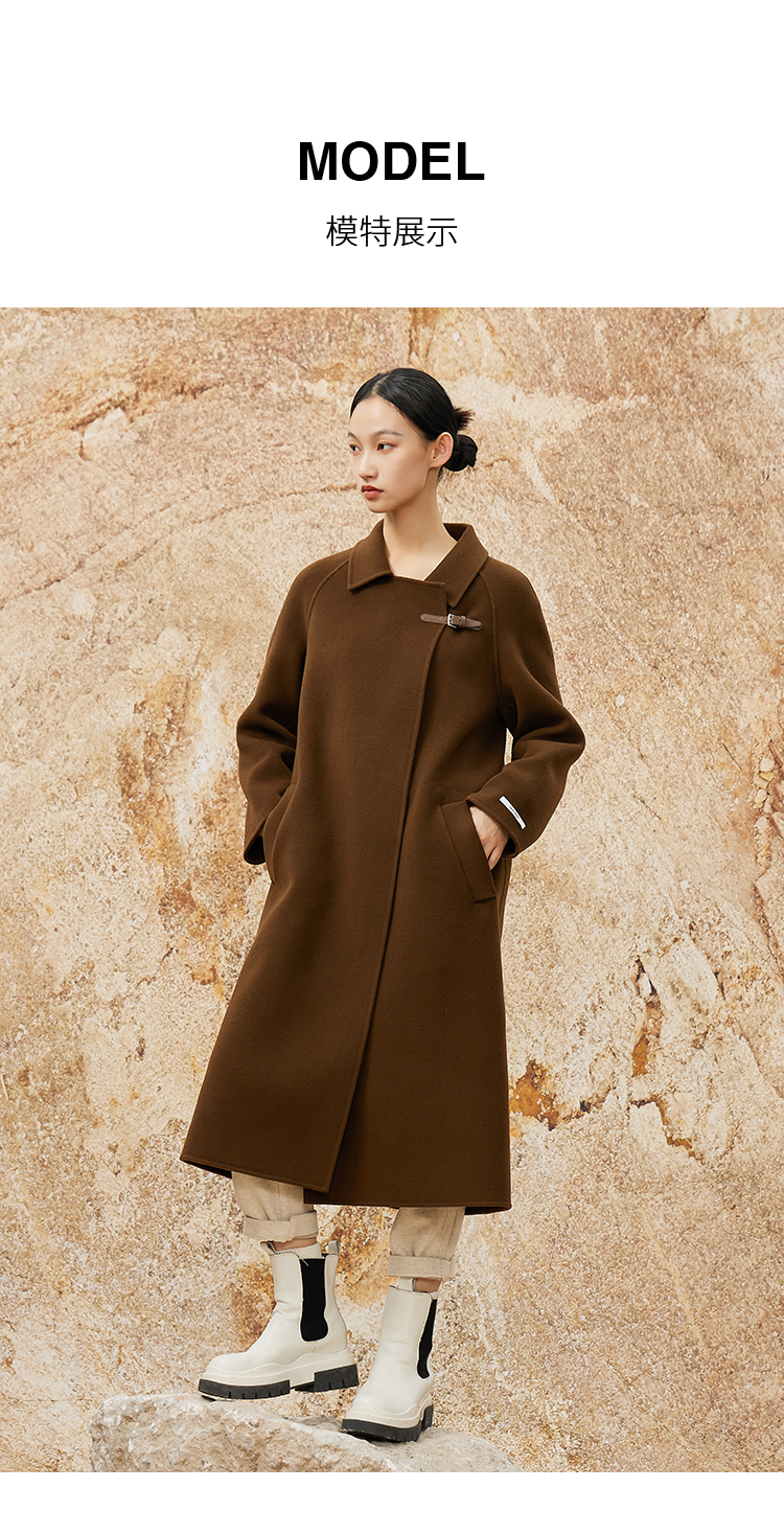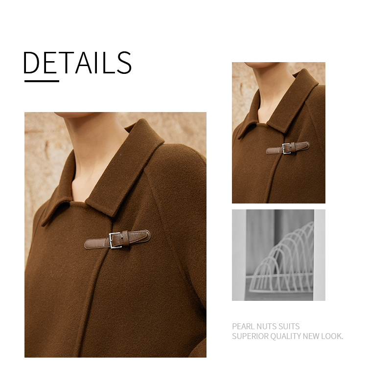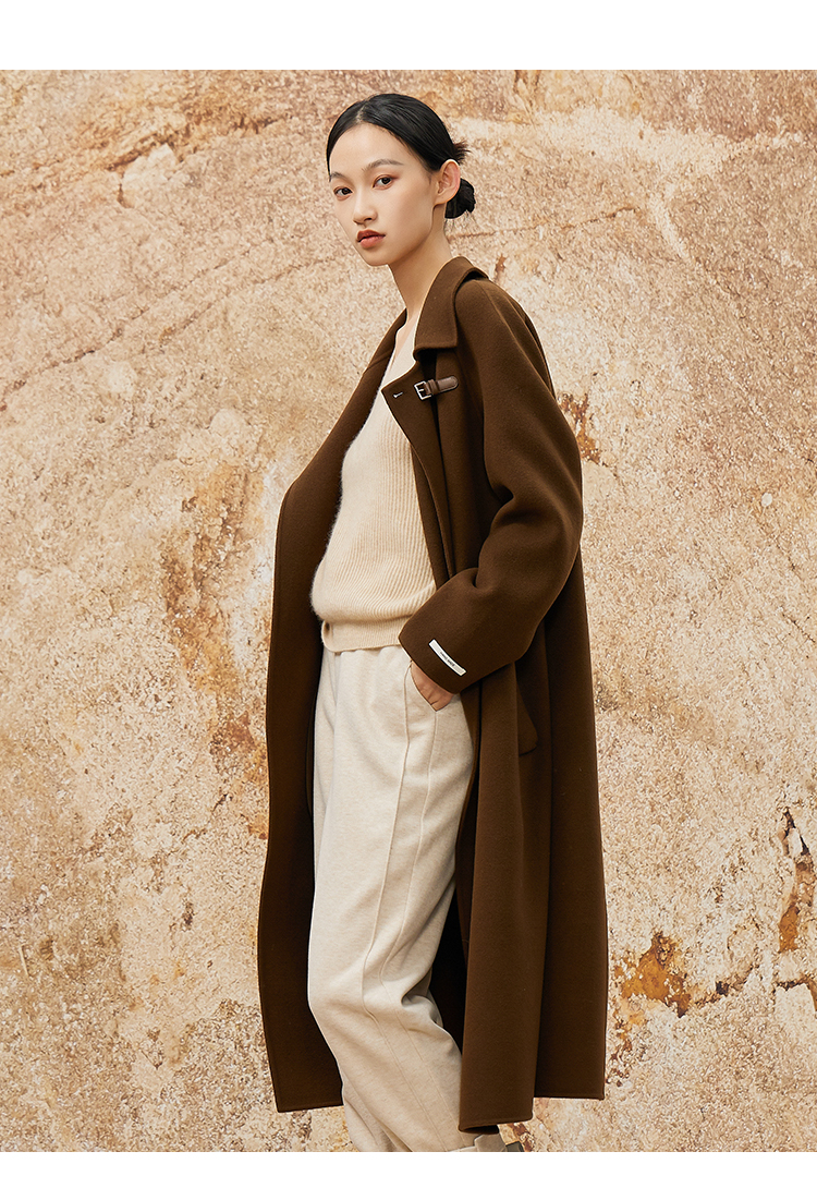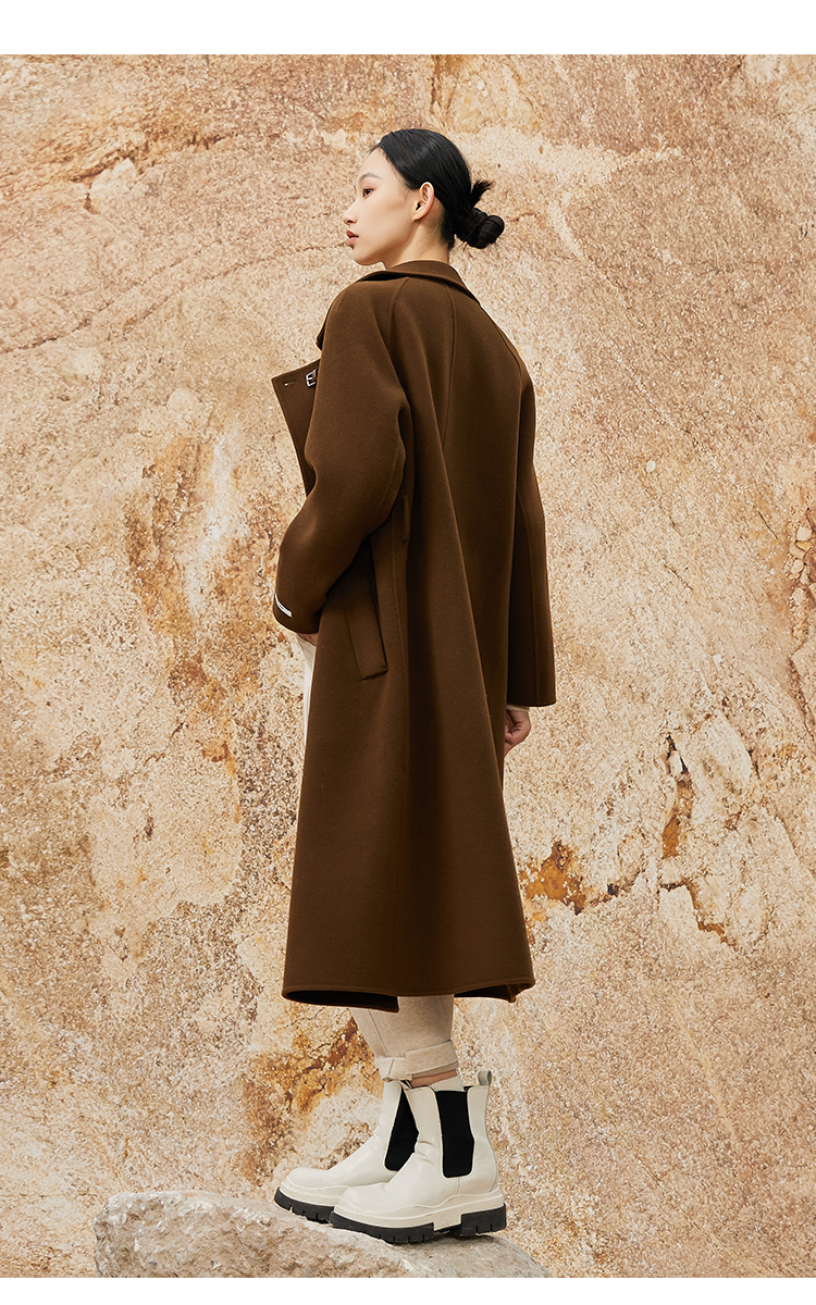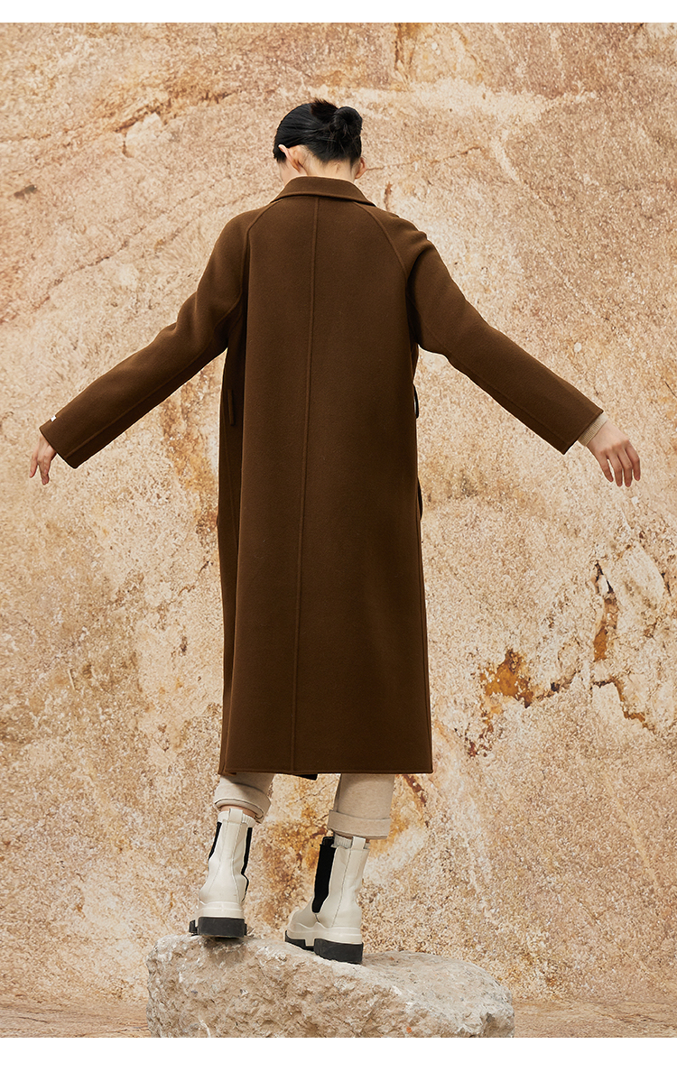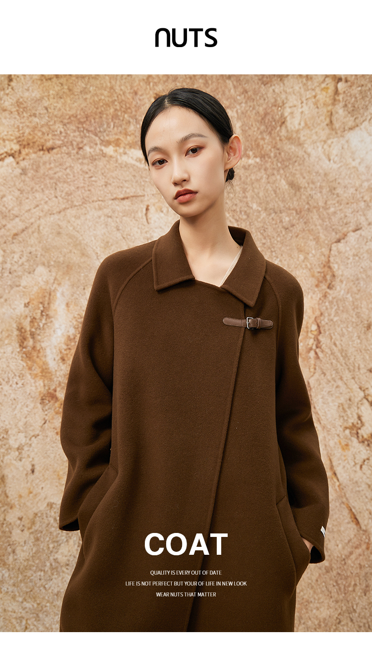 NUTS冬款棕色高级设计感简约翻领复古手工呢料长外套女343152049