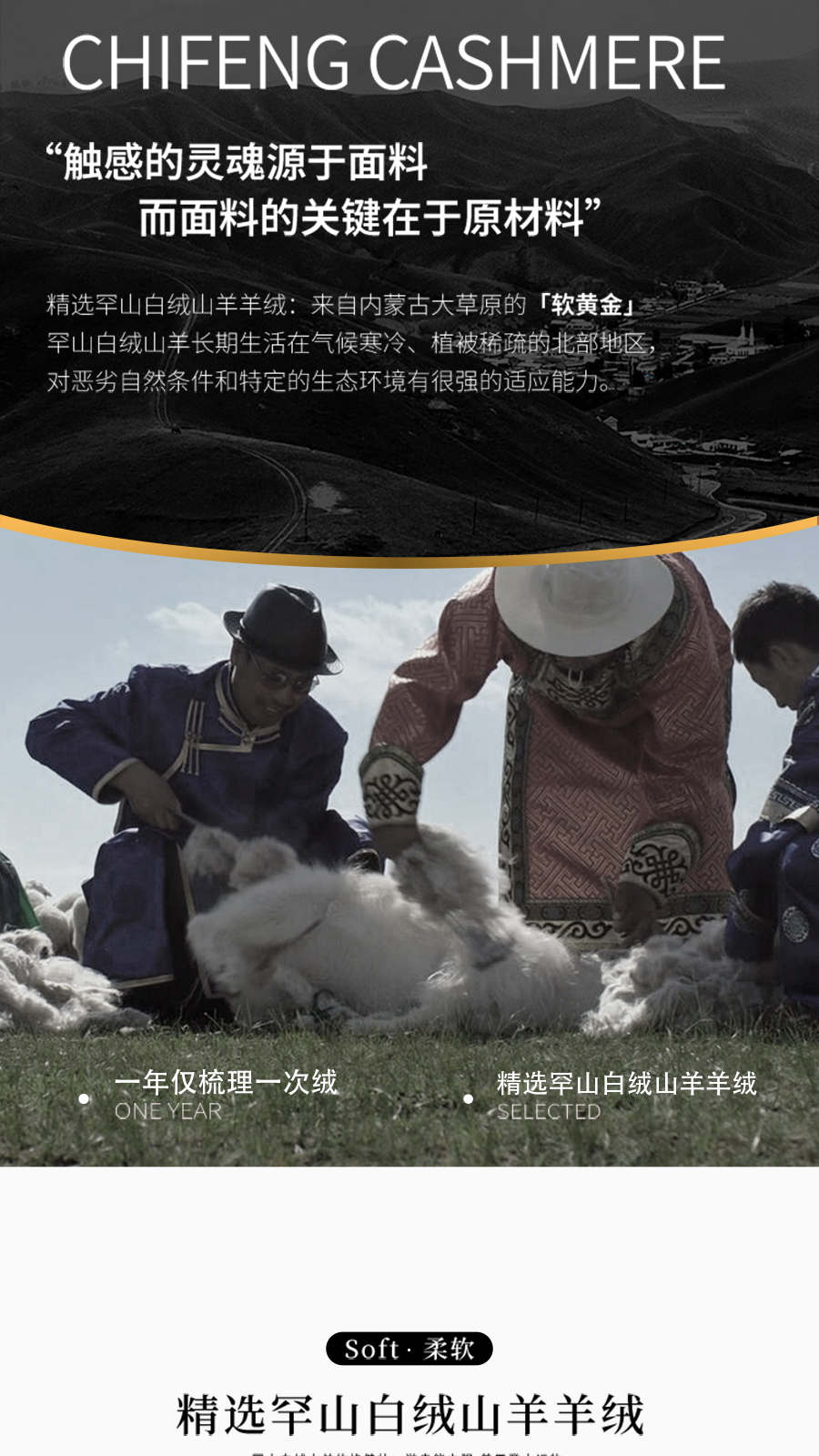 东黎羊绒是赤峰东荣集团自主品牌,自有牧场/羊绒制品全产业链优势,实现了羊绒从“牧场”到“商场”的华丽转变。