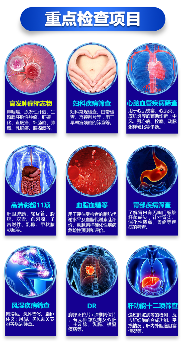 【优享全面套餐】中老青年人基础套餐,冠心病类风湿筛查、高发肿瘤检测、全身12部位彩超、肝肾功能
