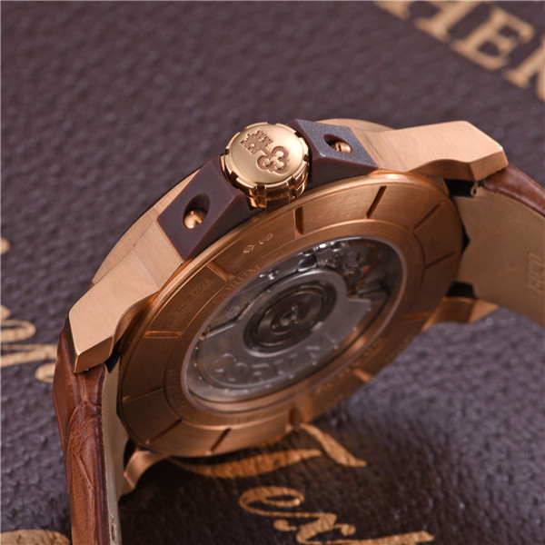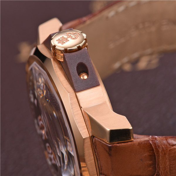 镜面材质 | 蓝宝石水晶玻璃 | 表盘 | 18K玫瑰金表壳 棕色12边表盘 时分秒时间指示 大三针 日期显示 透底 |