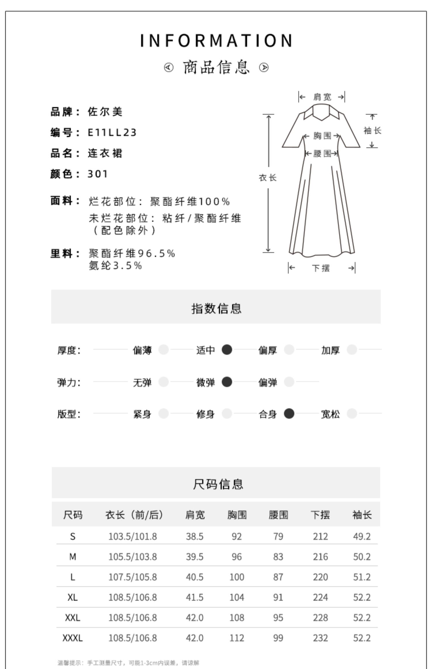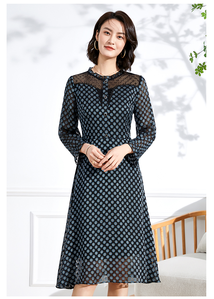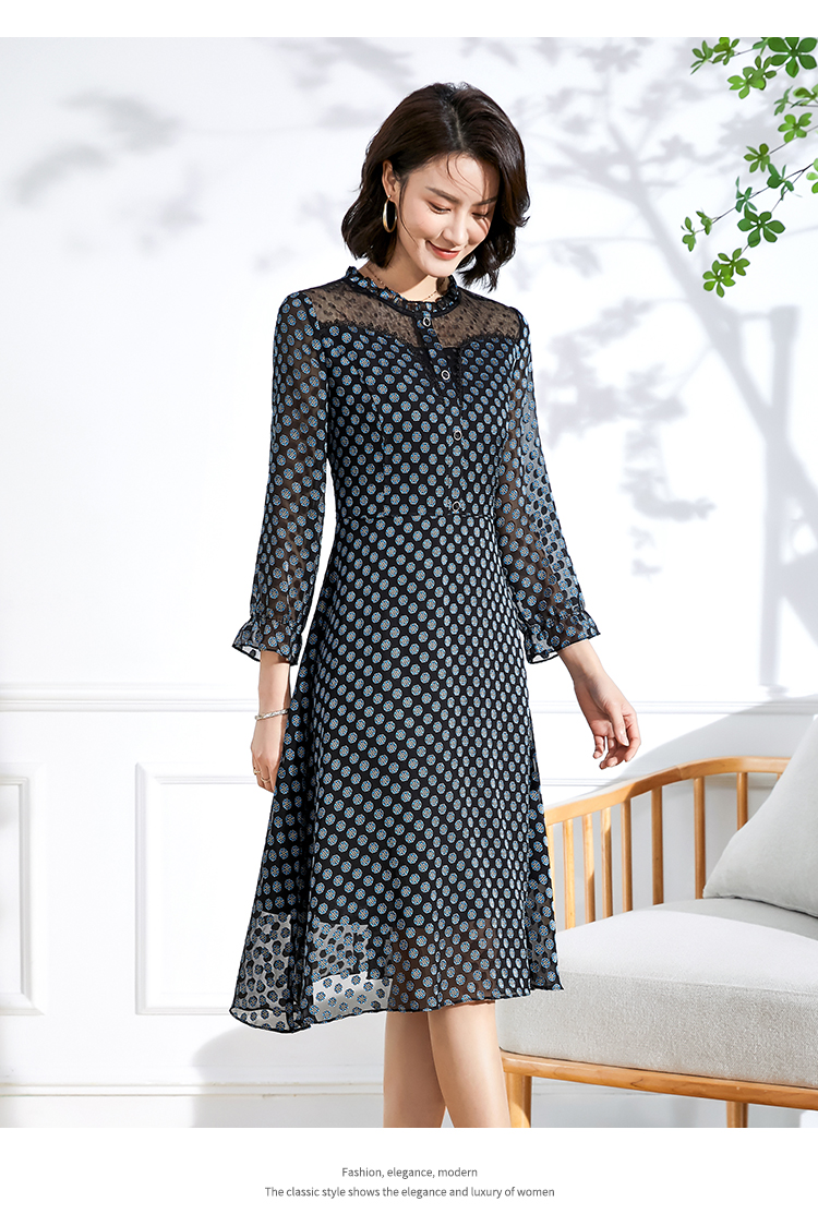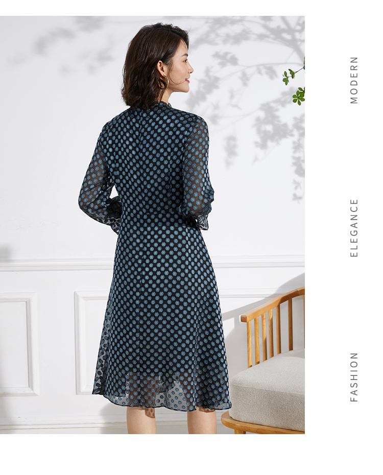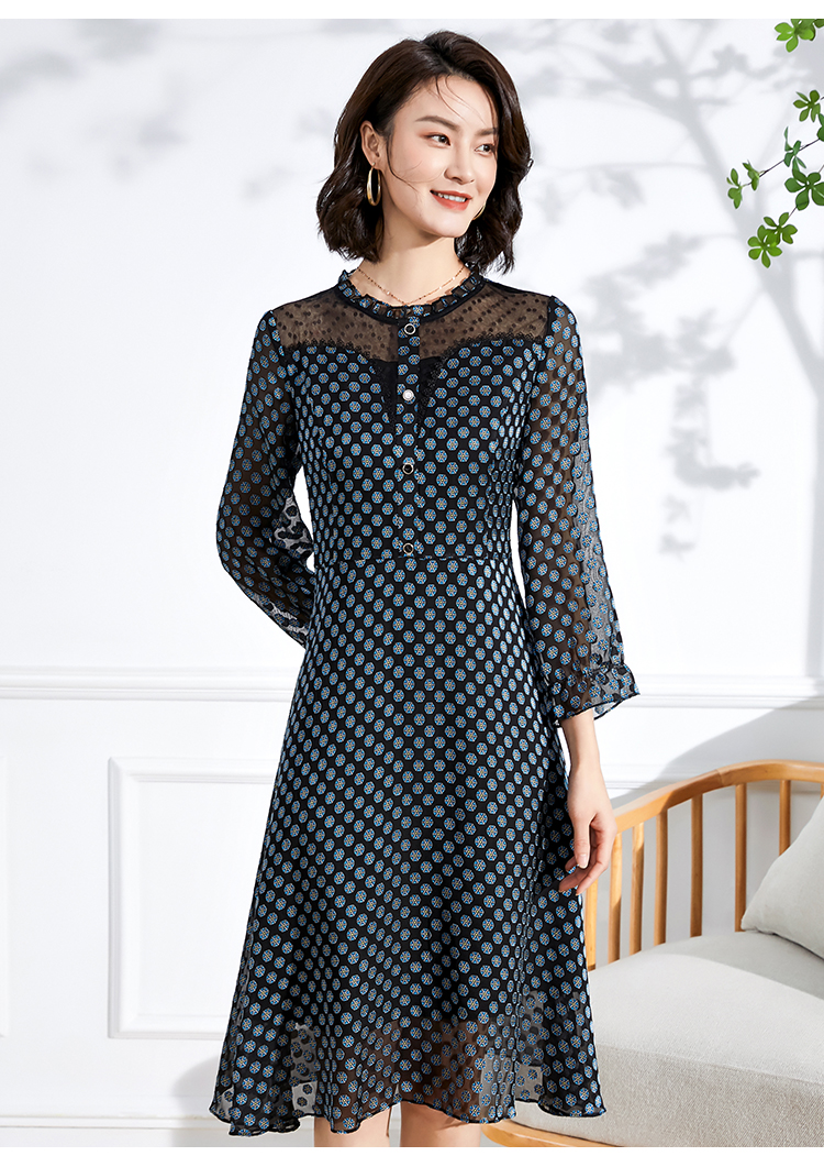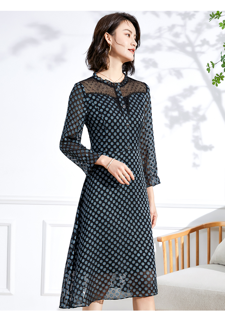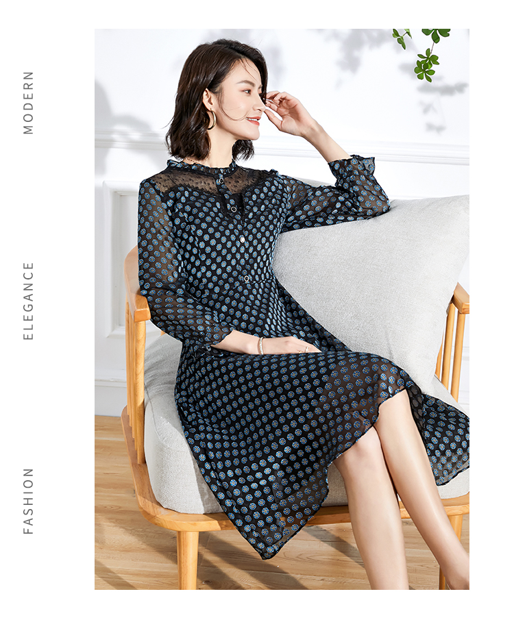 佐尔美春夏新款 蕾丝镂空领9分袖收腰小碎花中长连衣裙女E11LL23