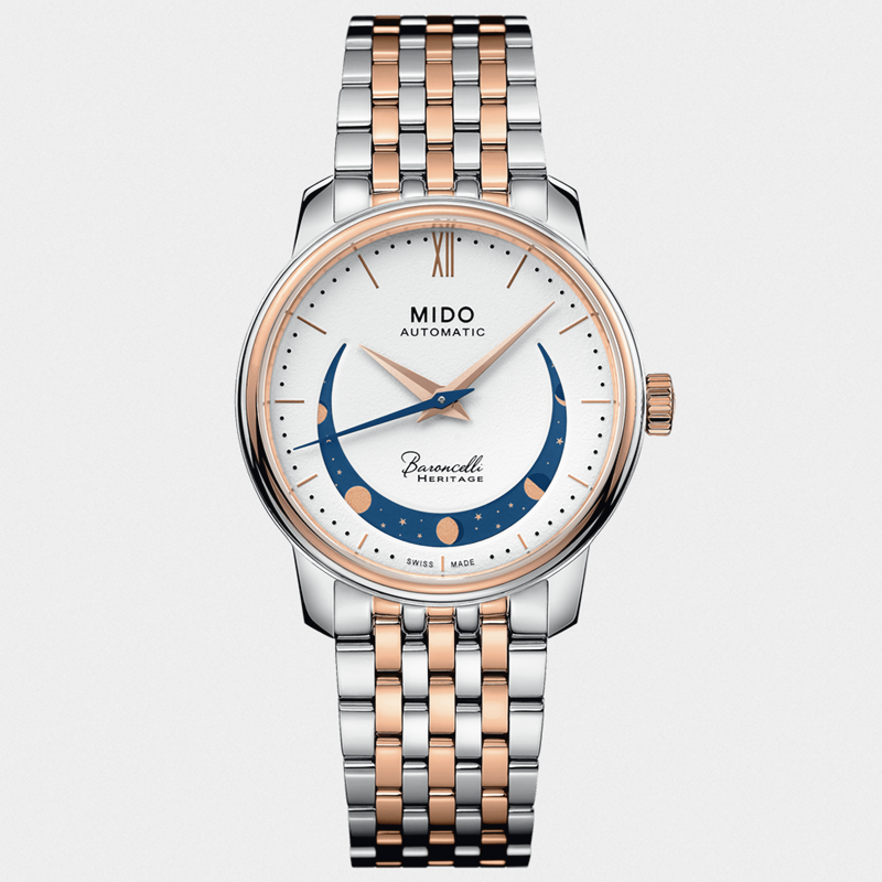 镜面 材质 | 蓝宝石水晶玻璃 | 表盘 | PVD镀玫瑰金不锈钢表壳 白色喷砂表盘,微笑形状月相视窗位于6点钟位置。双面时针和分针(一面为喷砂面,另一面为钻石切面),蓝钢秒针。 日期显示 月相 透底 |