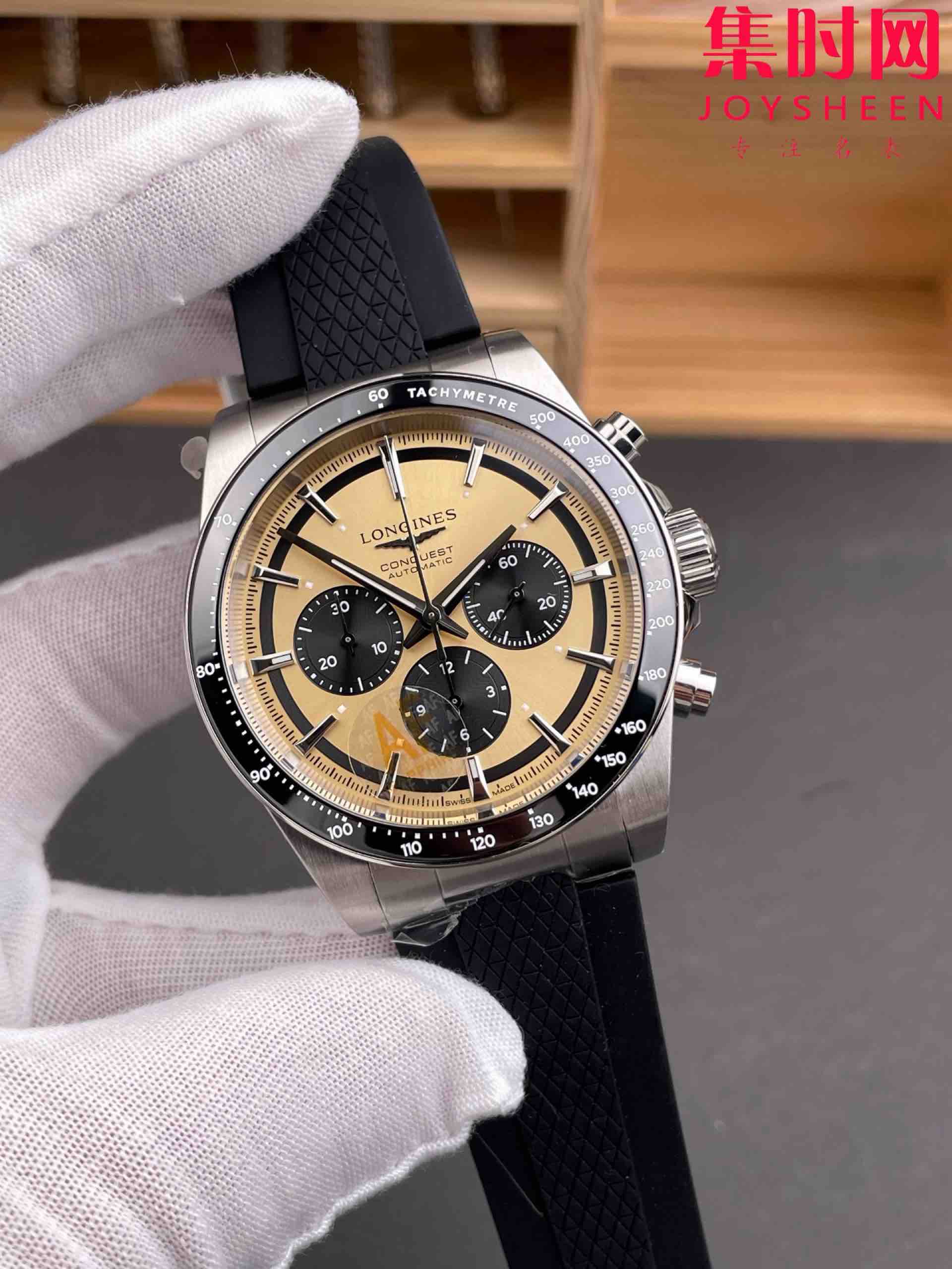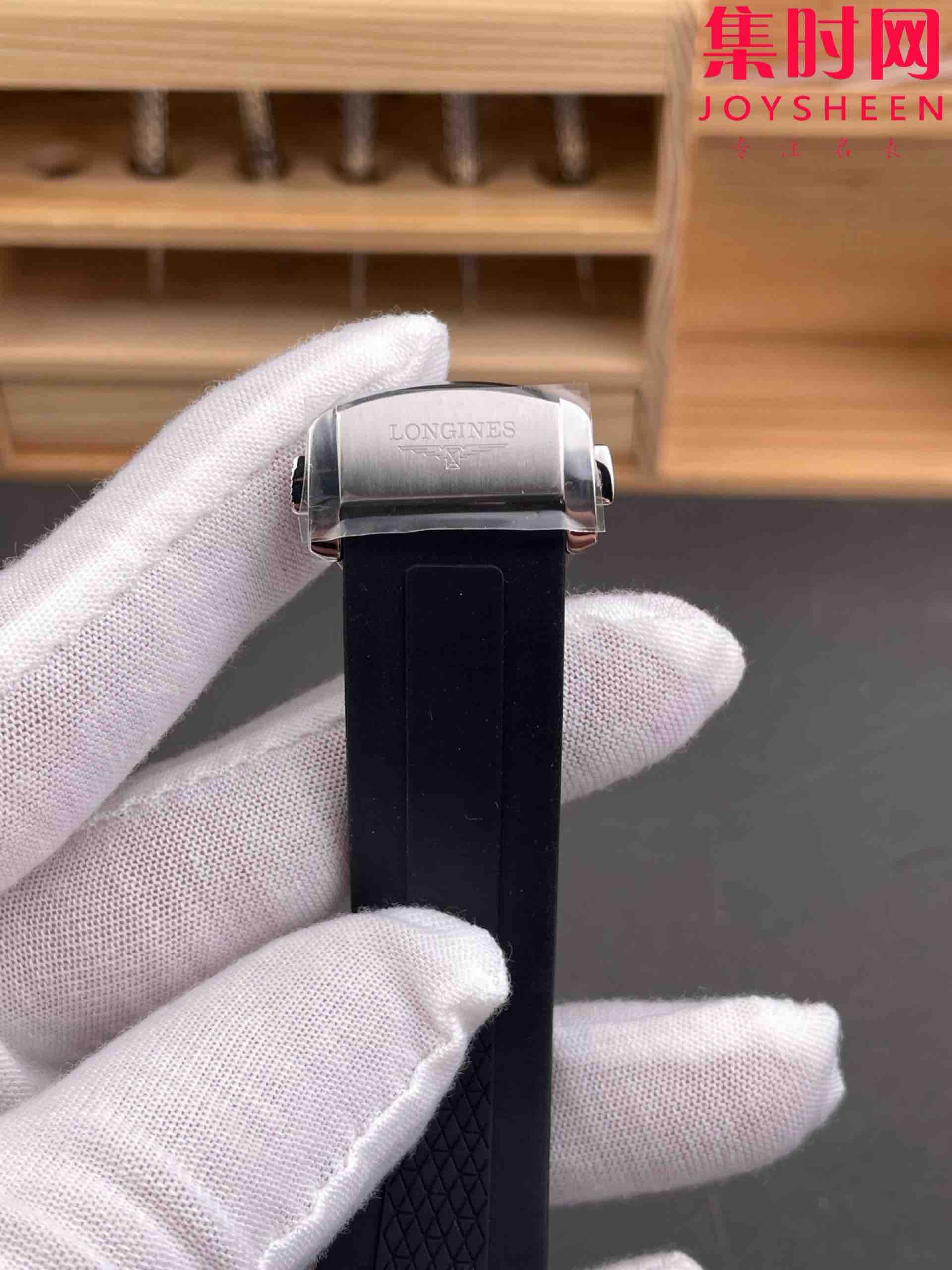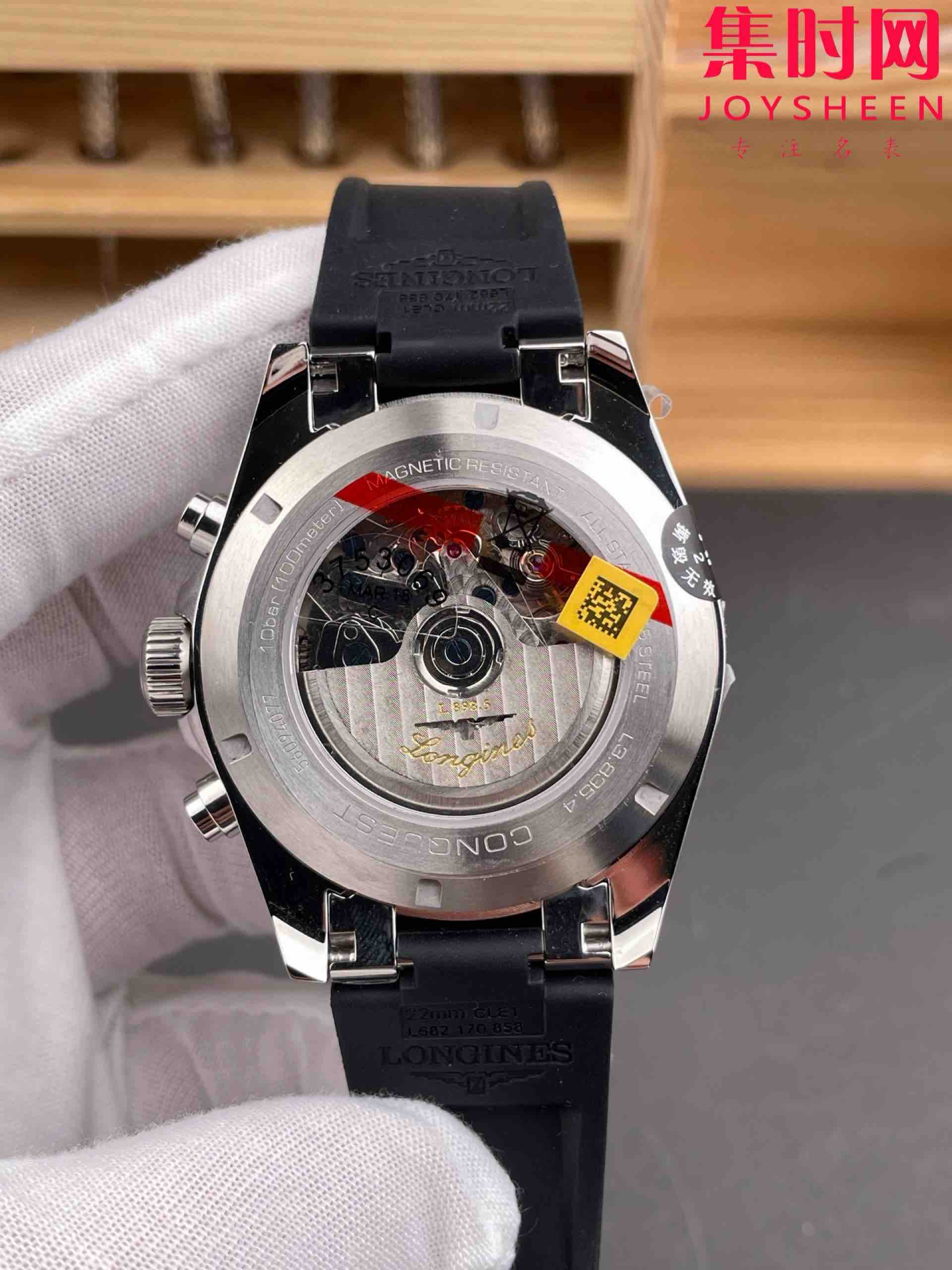 AF浪琴康卡斯计时系列 康卡斯悦动计时 男士腕表 胶带款 表径42mm,使用陶瓷表圈,表圈上有有测速圈,并有红字点缀。
