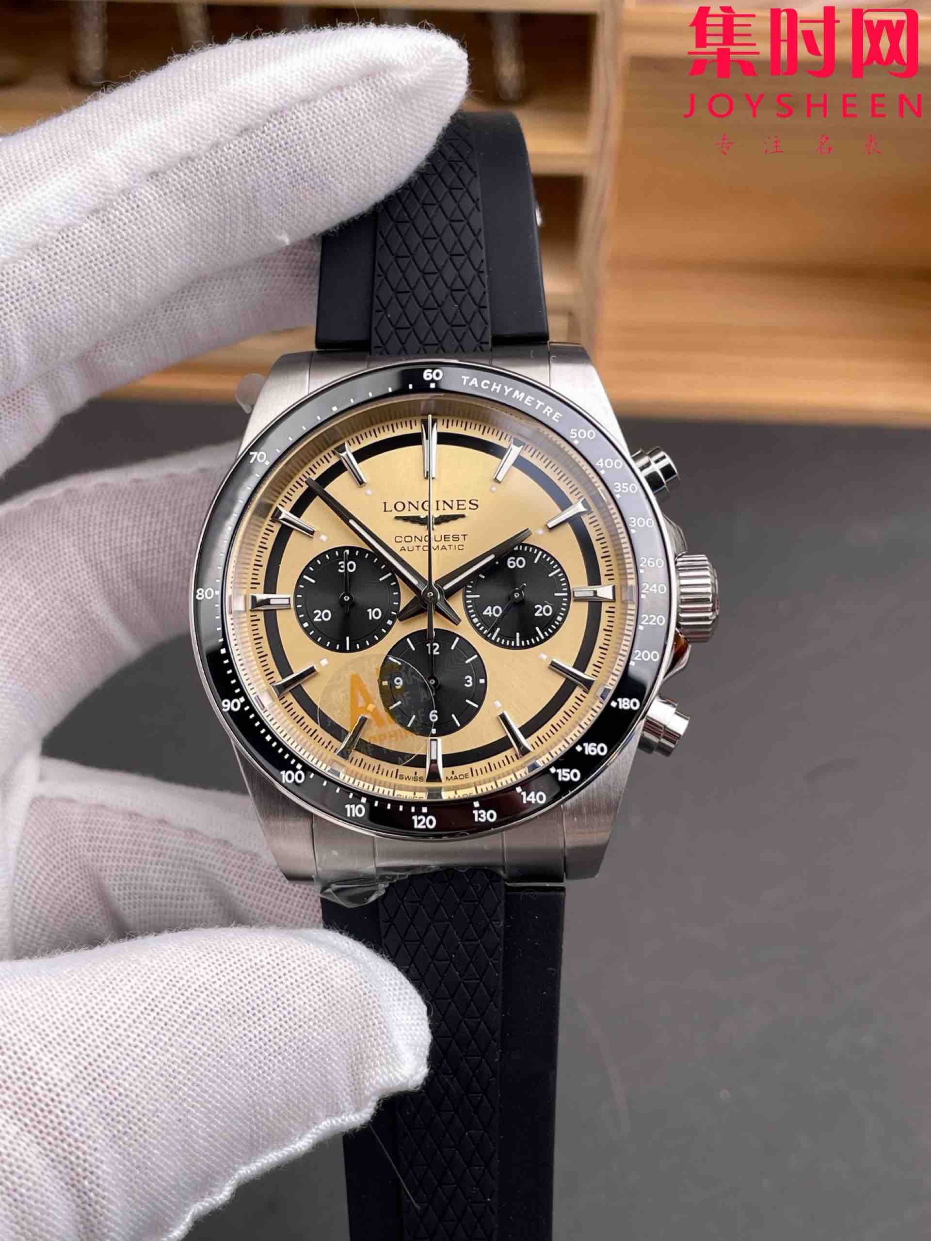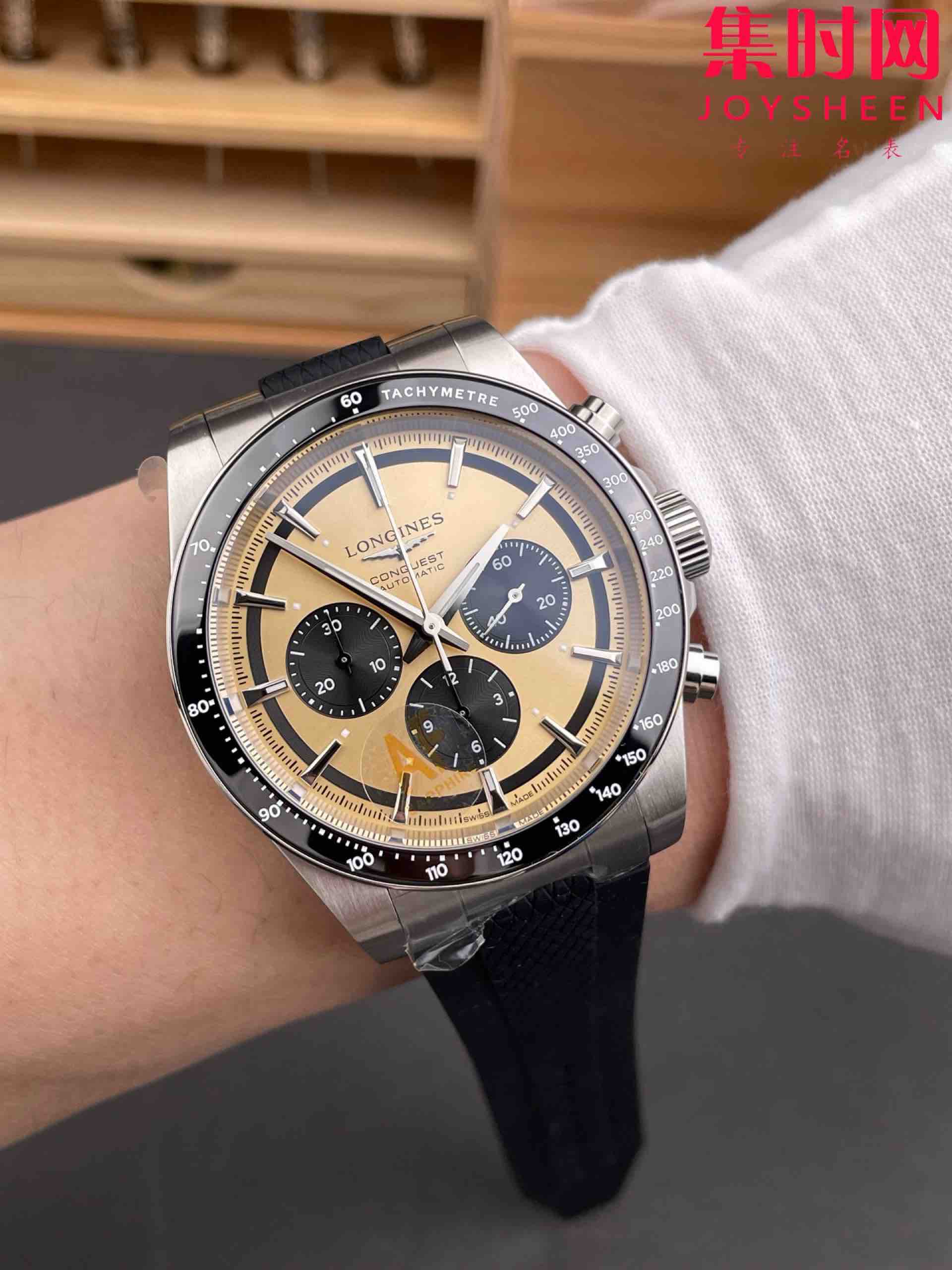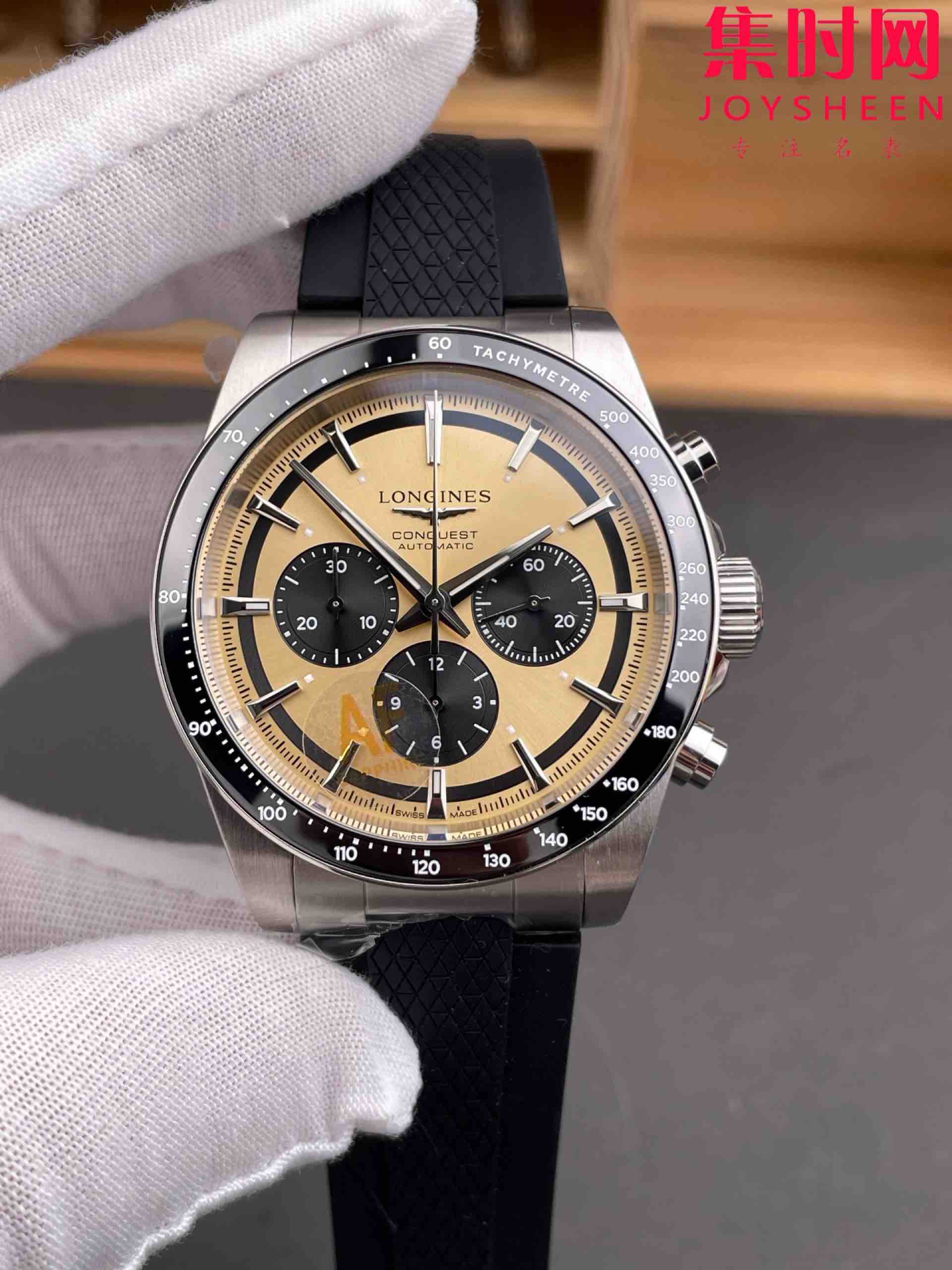 AF浪琴康卡斯计时系列 康卡斯悦动计时 男士腕表 胶带款 表径42mm,使用陶瓷表圈,表圈上有有测速圈,并有红字点缀。
