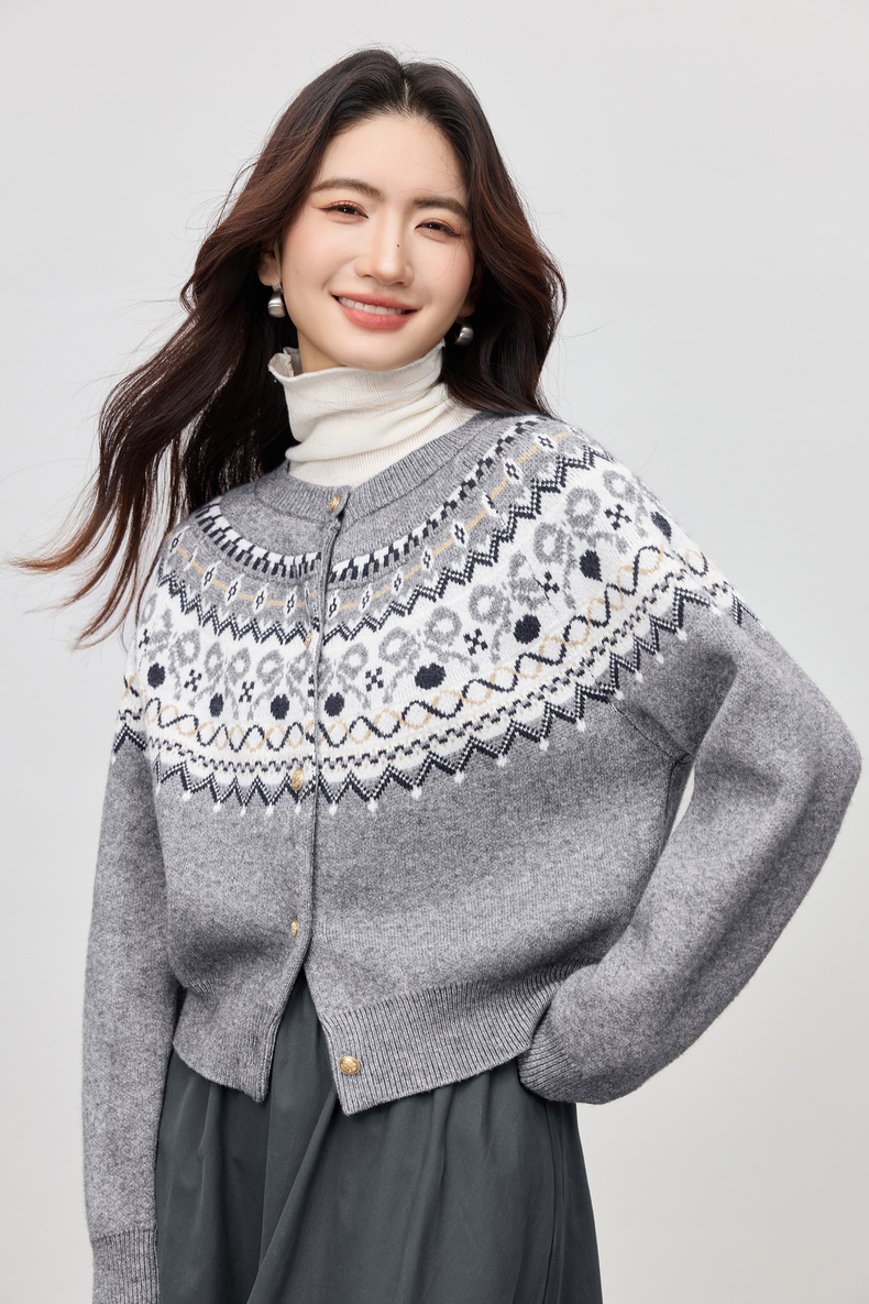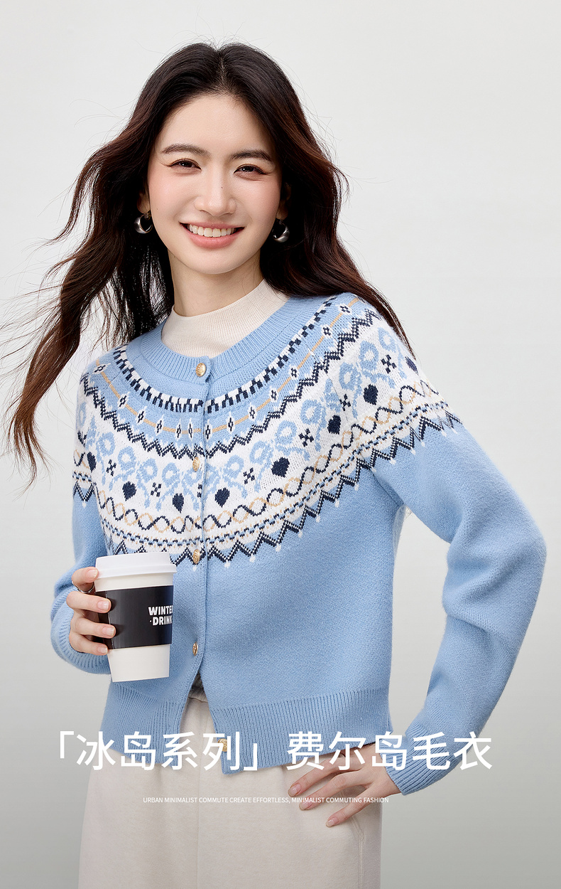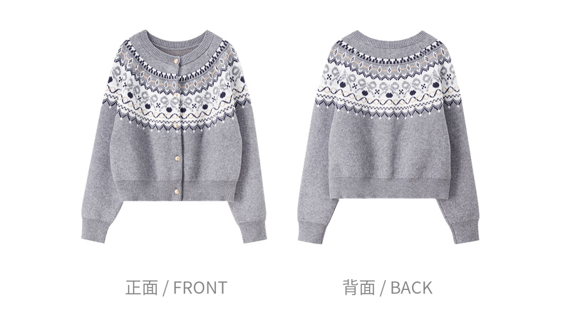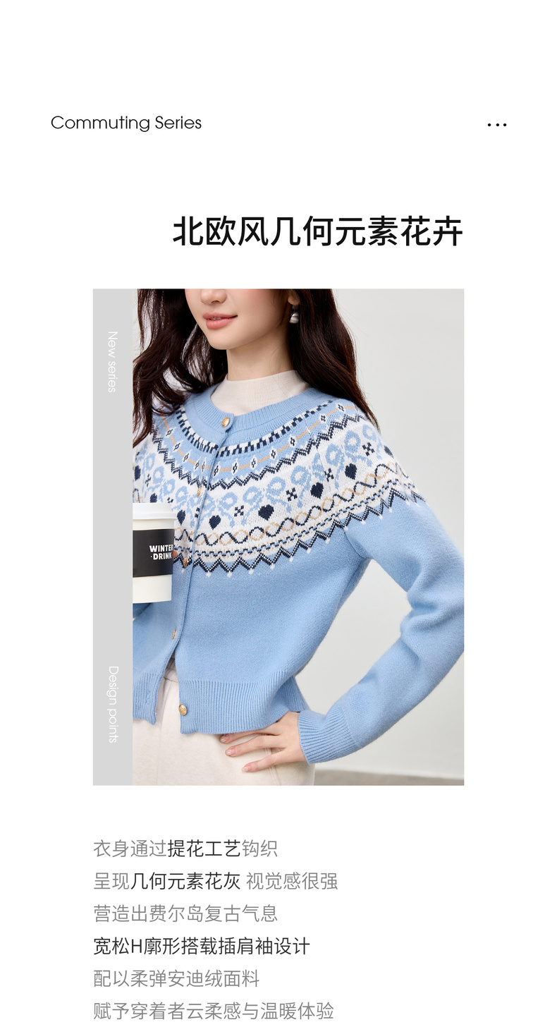 【内购】【费尔岛提花图案】圆领徽章金属扣宽松显瘦弹力安迪绒开衫毛衣-W53EB3372