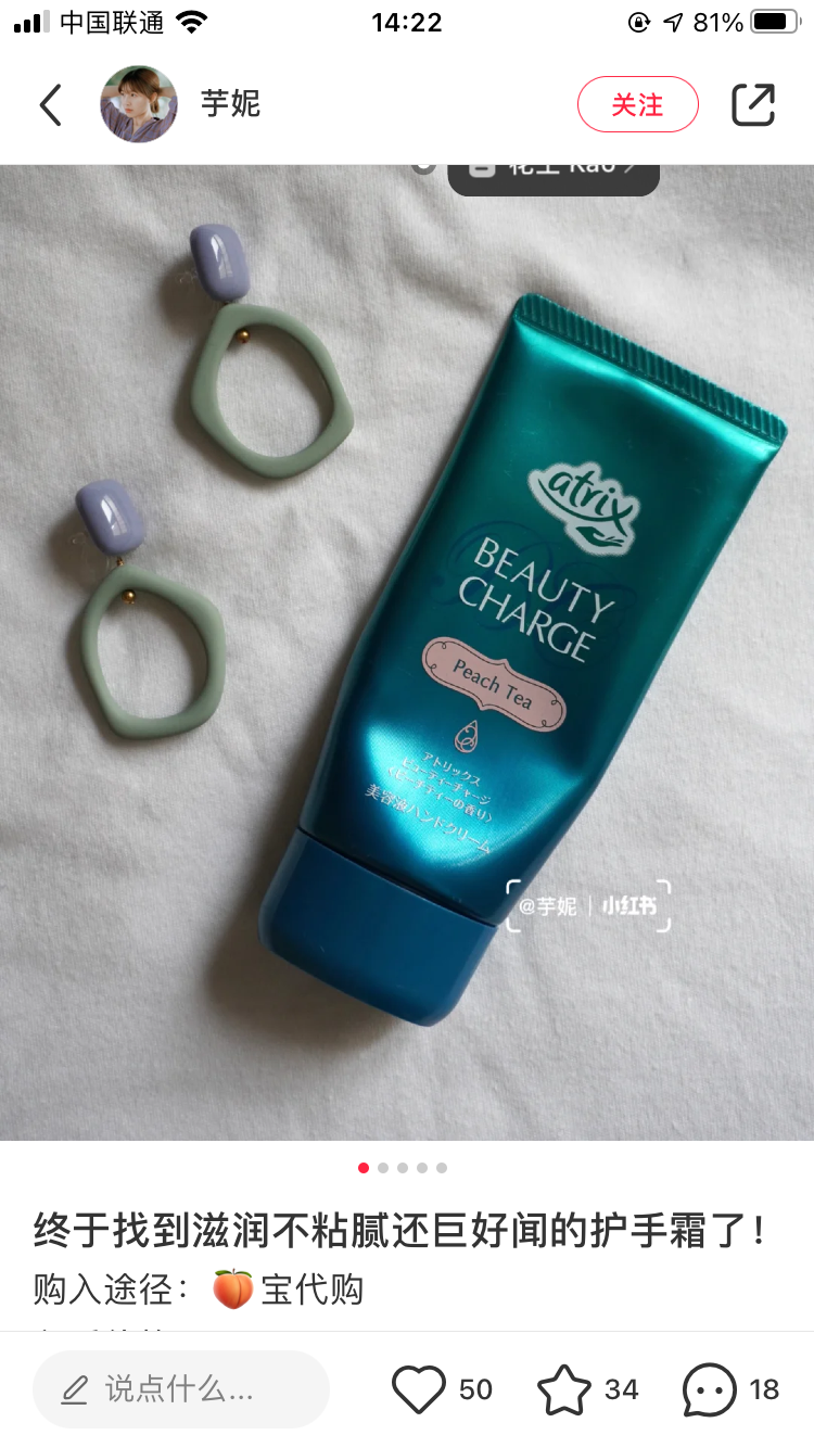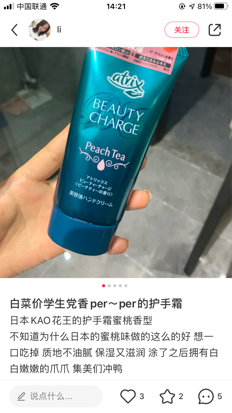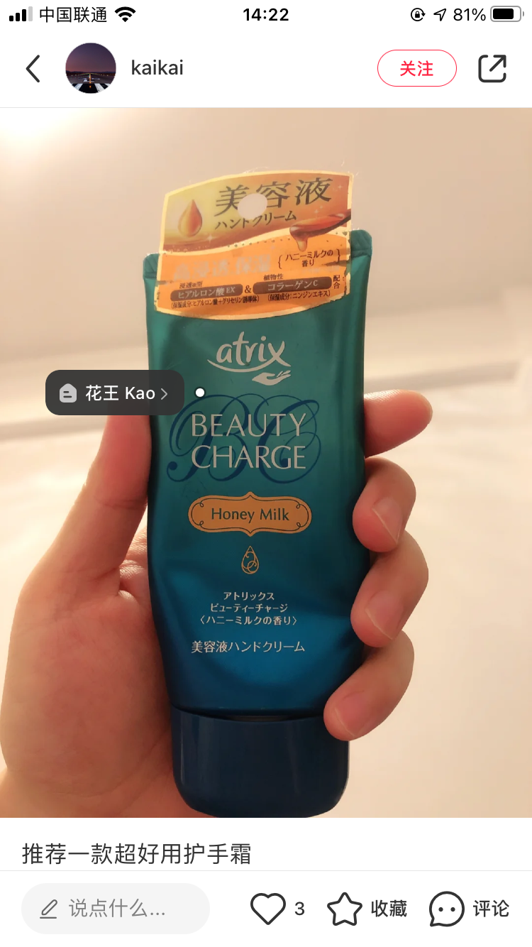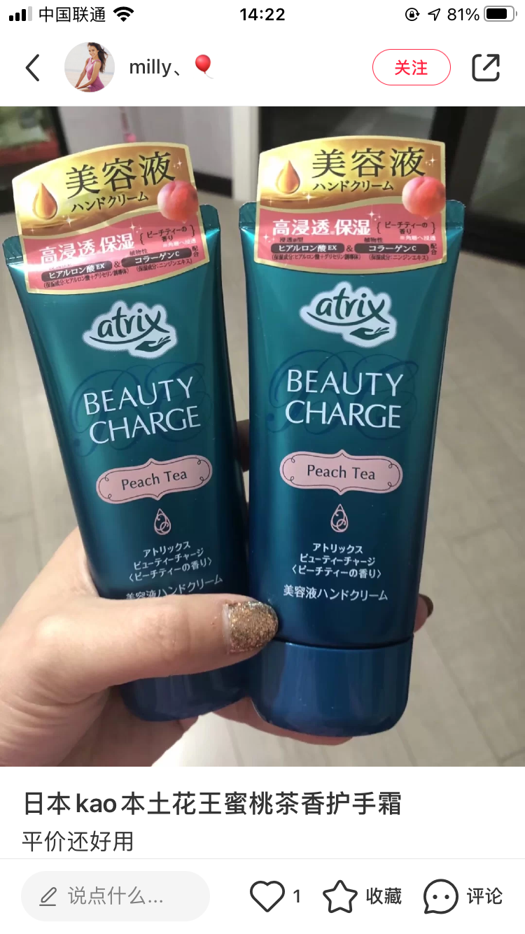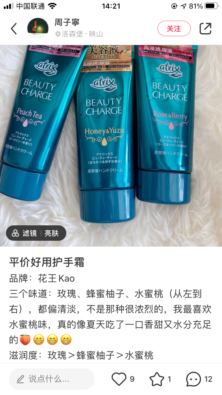 秋天到啦,护手霜又变成了每日随身携带的必备!这款花王护手霜,便宜又大碗,平价好用超经典!味道是清新的水蜜桃味儿,特别好闻!滋润双手效果也很棒~~很推荐哟!