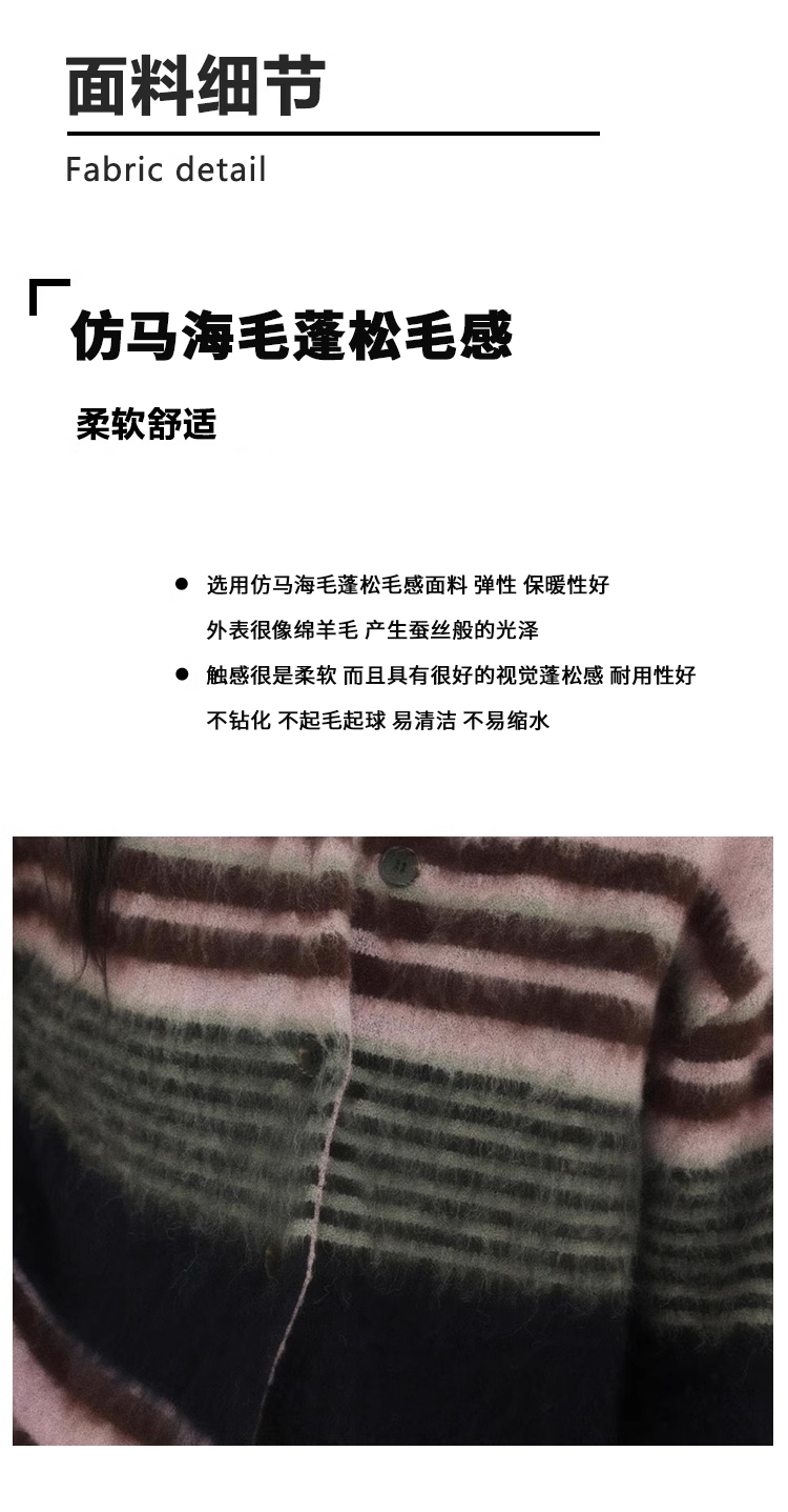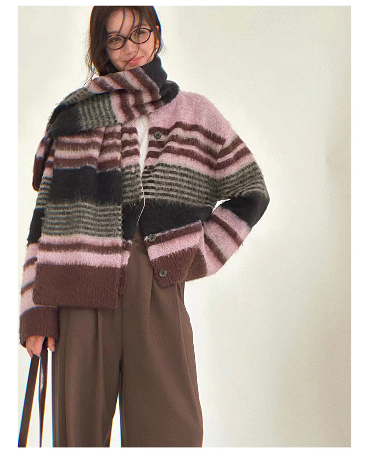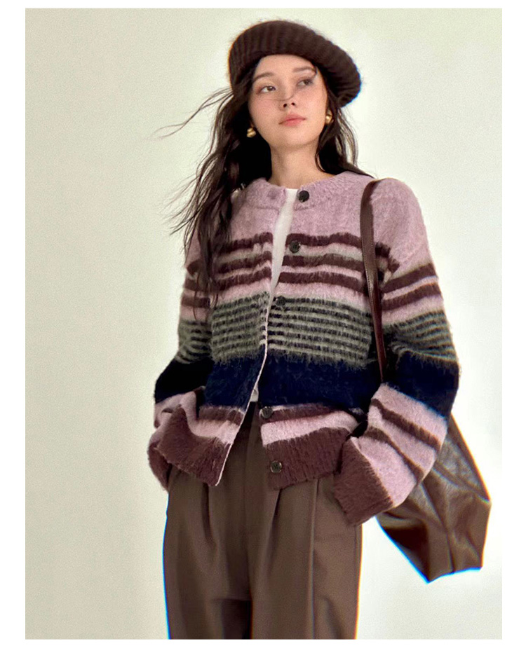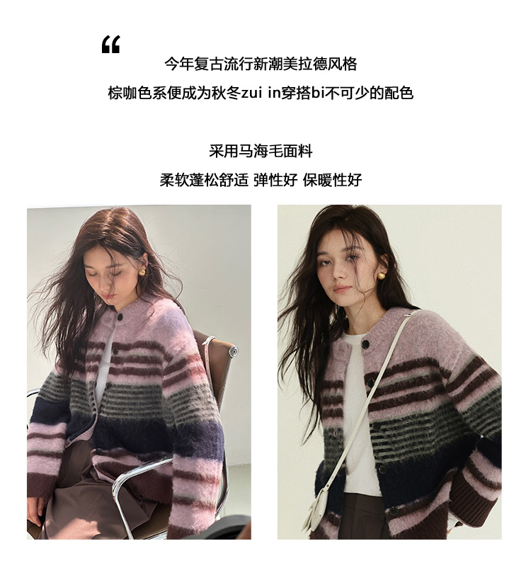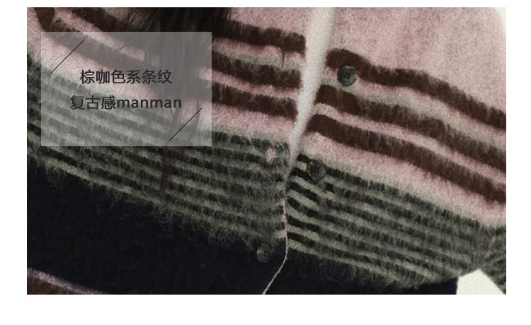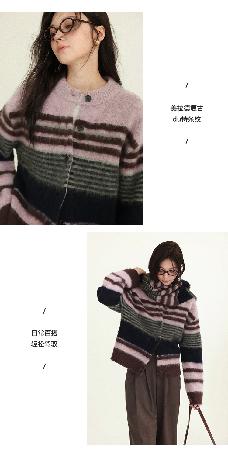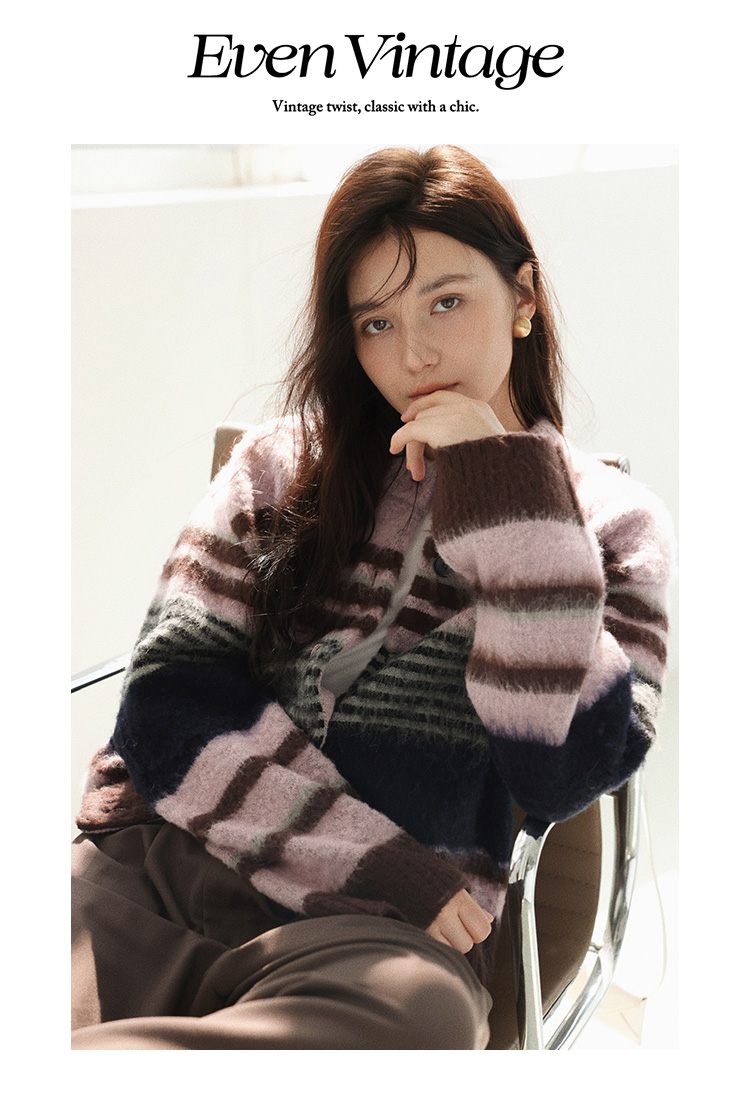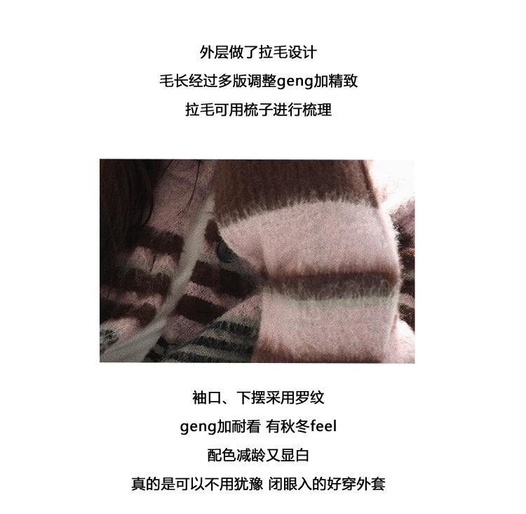 Even Vintage| 高ji感配色 条纹针织仿马海毛抓毛毛衣开衫外套冬