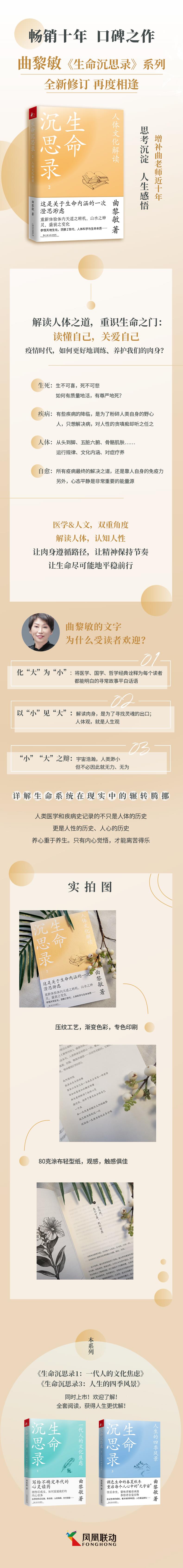 畅销书作者曲黎敏《生命沉思录》系列,旧版热卖30万册!全新修订、全新排版、全新装帧,从内容到观感,让阅读更具质感 ● 从医学和人文的双重角度,深度解读人体,进而认知人性,训练和把握精神之节奏,从而使生命尽可能地平稳前行 ● 先懂得肉身,才可能找寻到灵魂的出口,才可能谈得上“解脱”