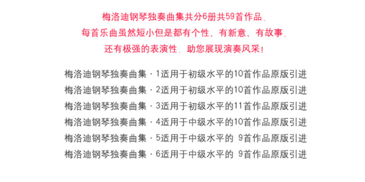 梅洛迪钢琴独奏曲集共分6册共59首作品,每首乐曲虽然短小但是都有个性、有新意、有故事,还有极强的表演性,助您展现演奏风采!