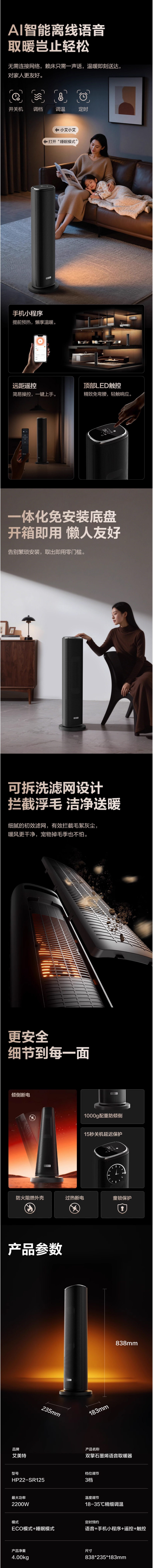 艾美特(510702)暖风机HP22-SR125家用壁炉取暖器办公室小型电暖气节能省电