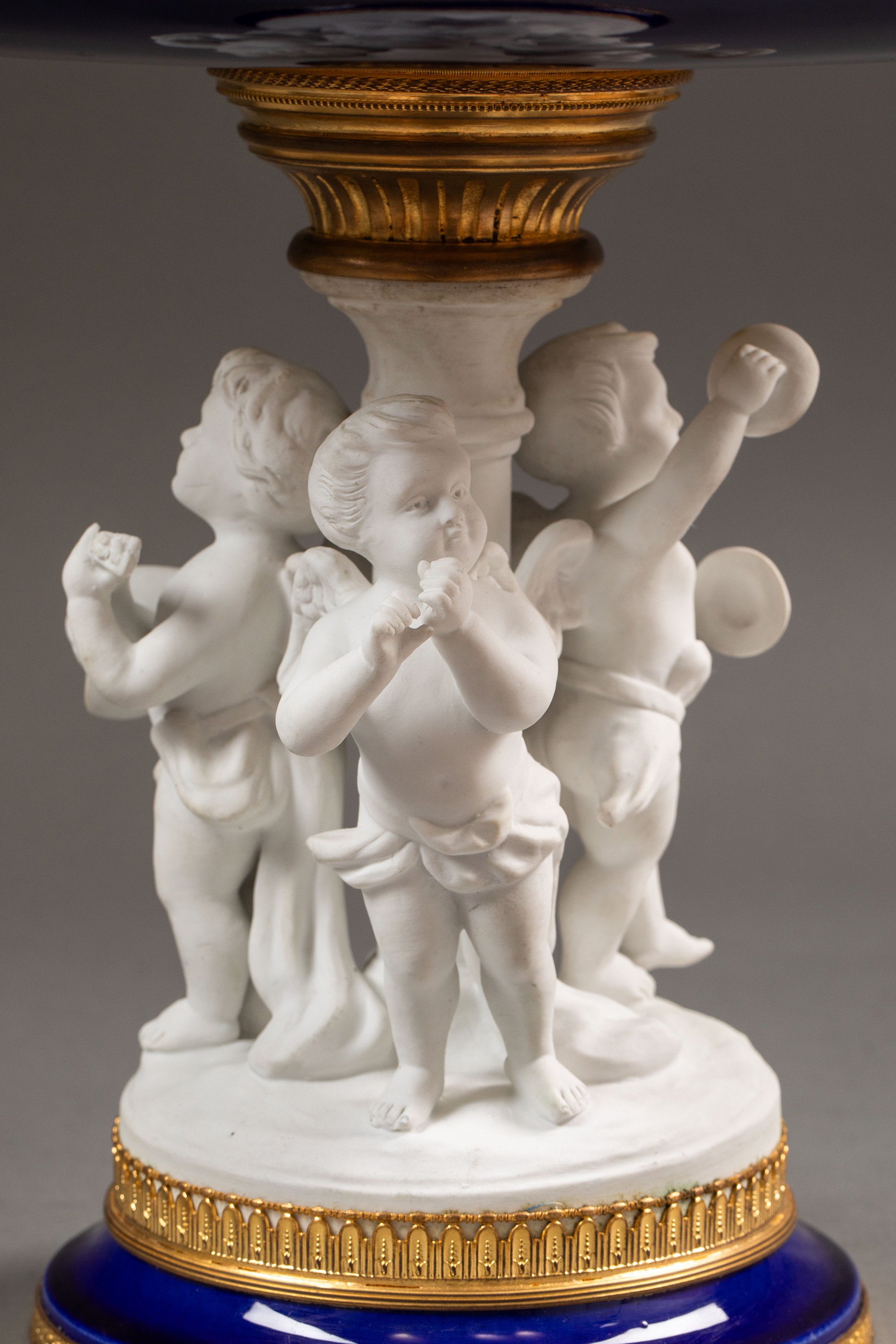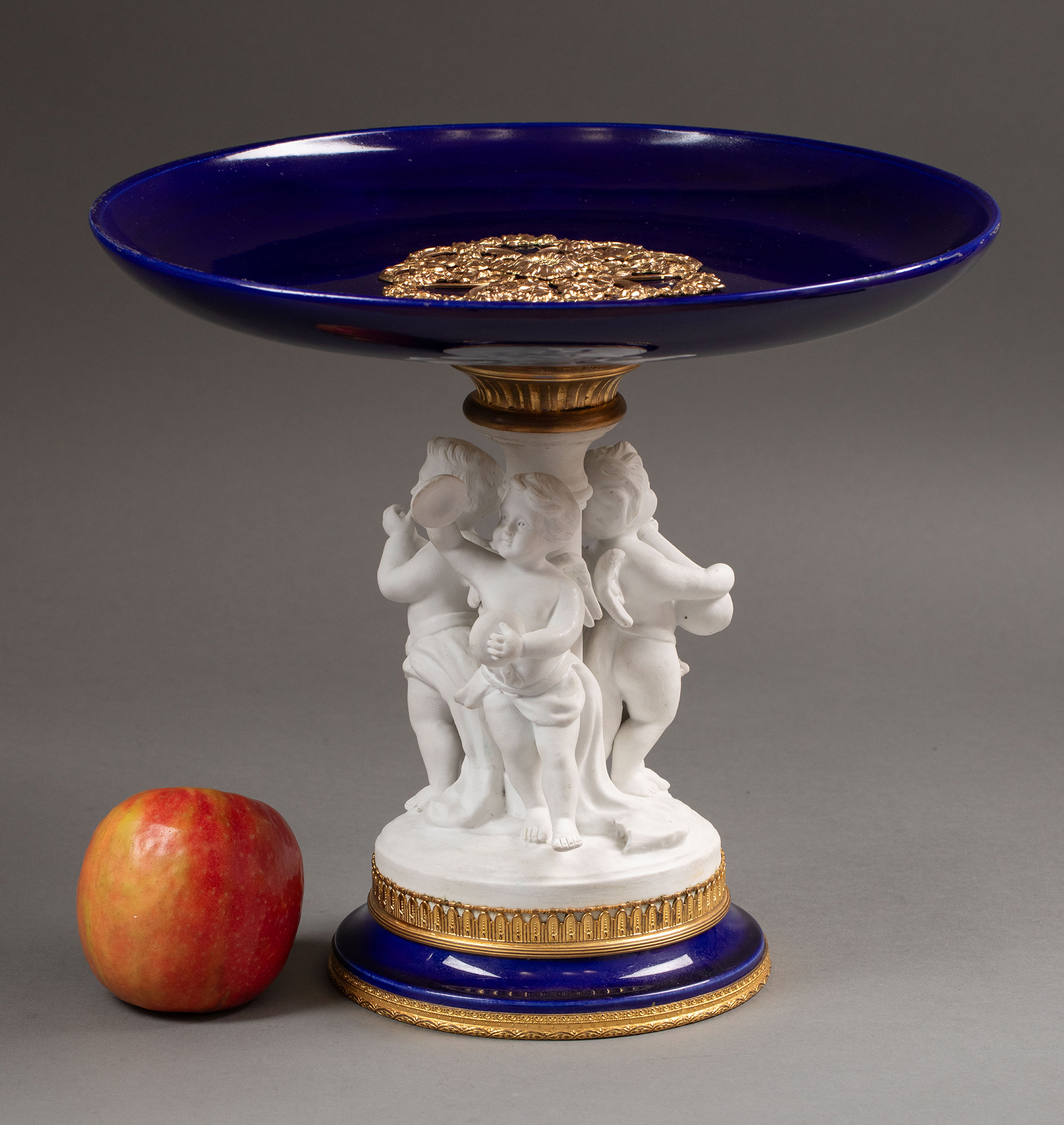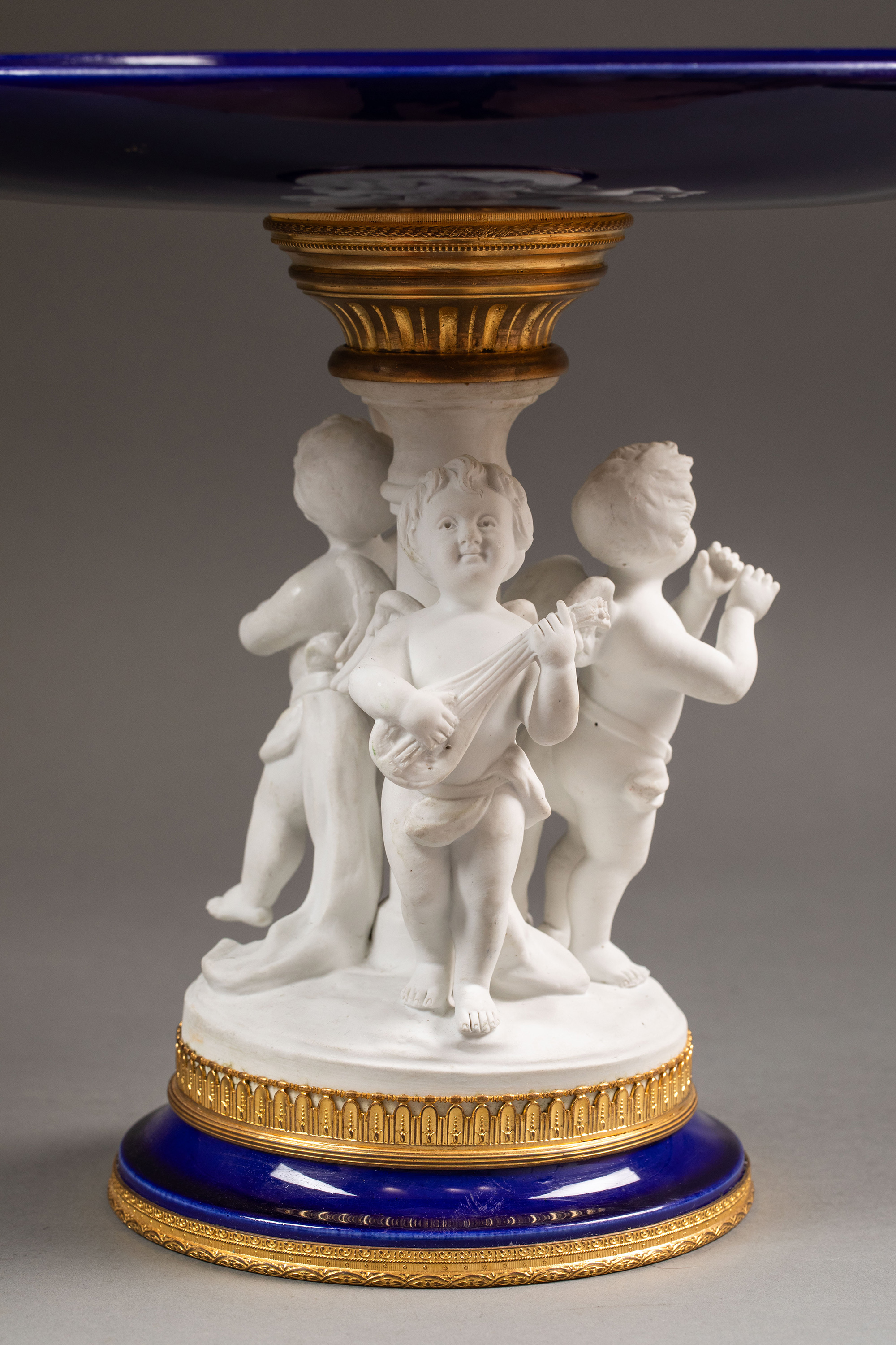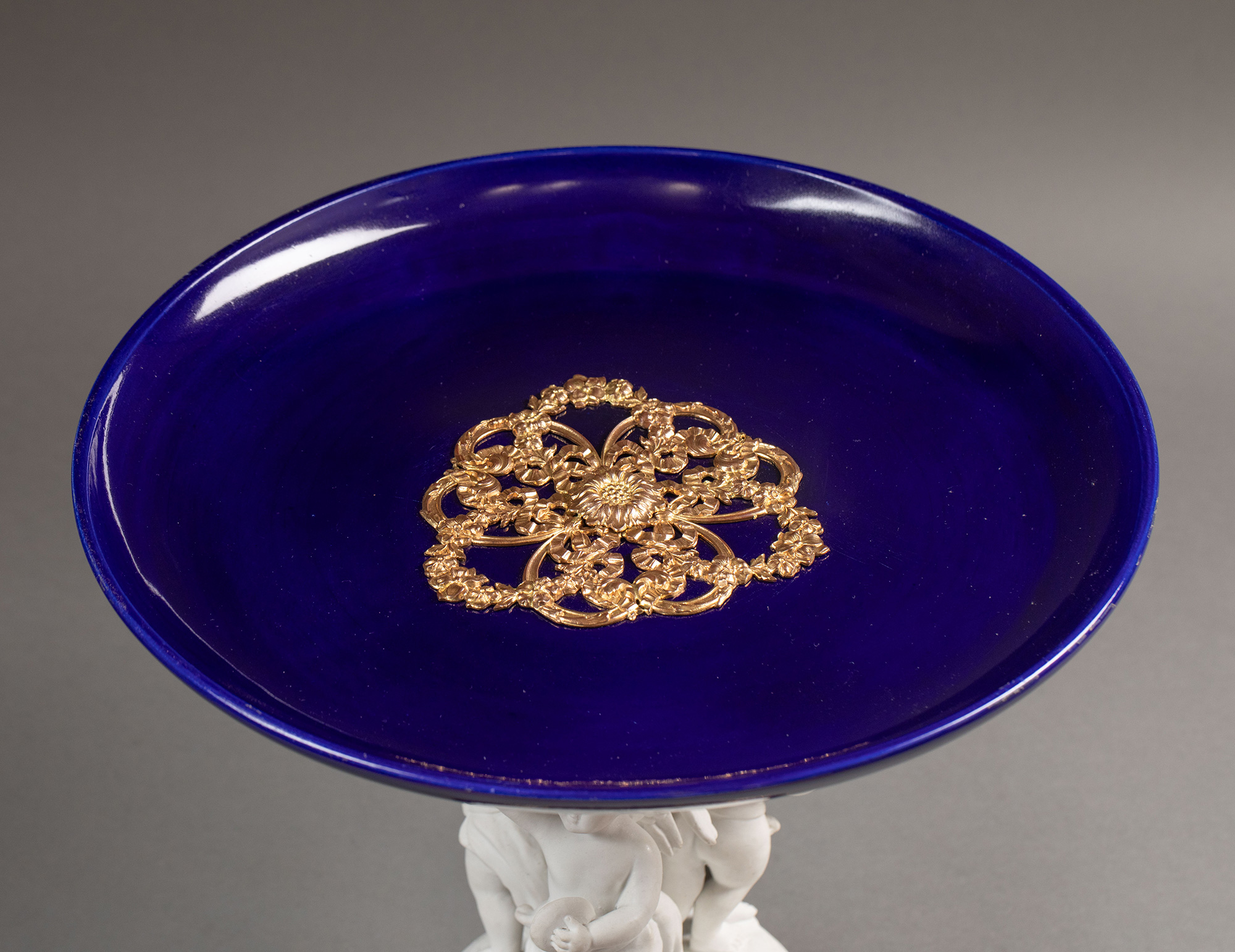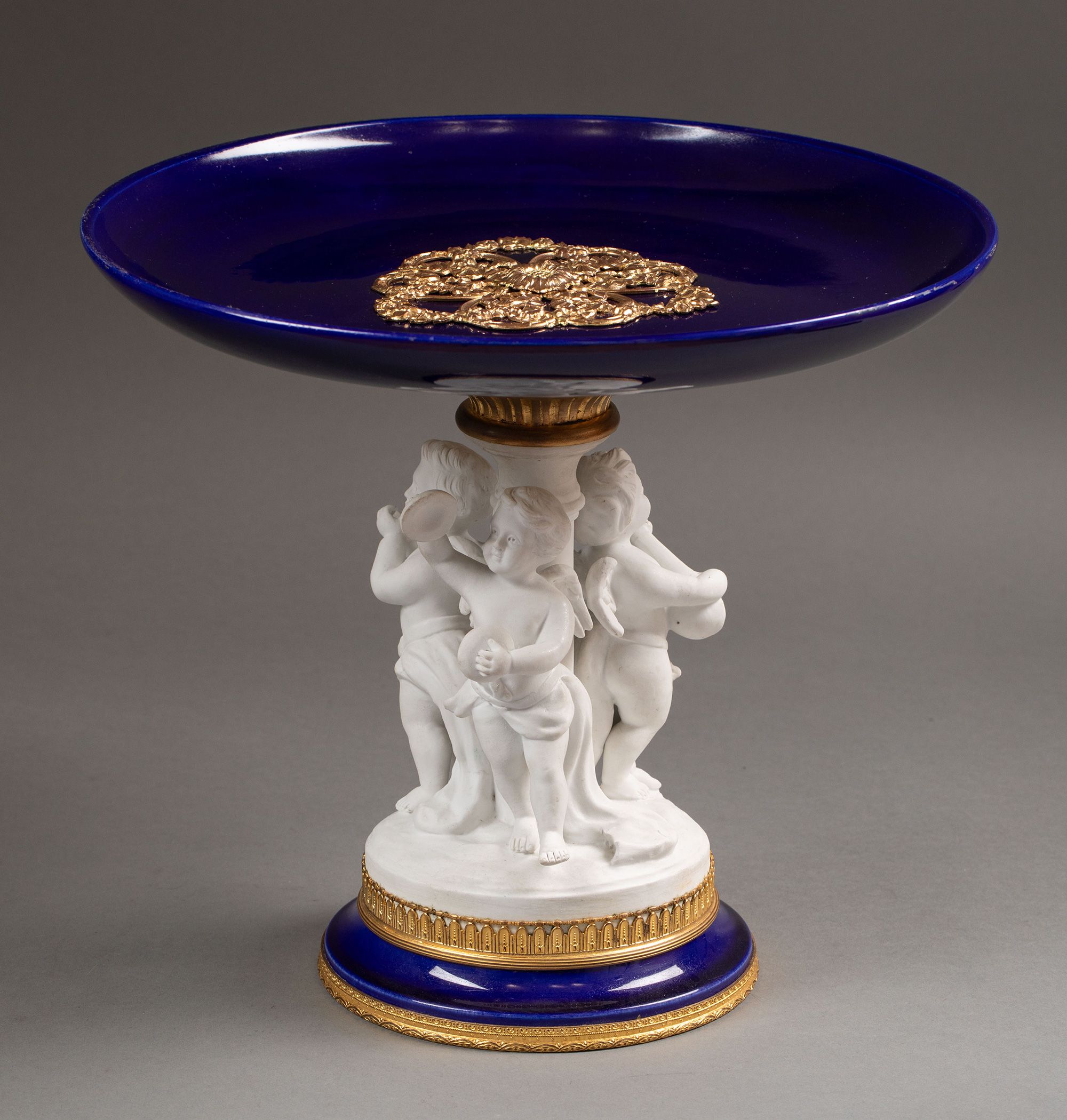 19世纪末法国出品小天使造型素胎瓷雕装饰花卉主题铜鎏金精雕嵌深蓝釉瓷盘高脚果樽