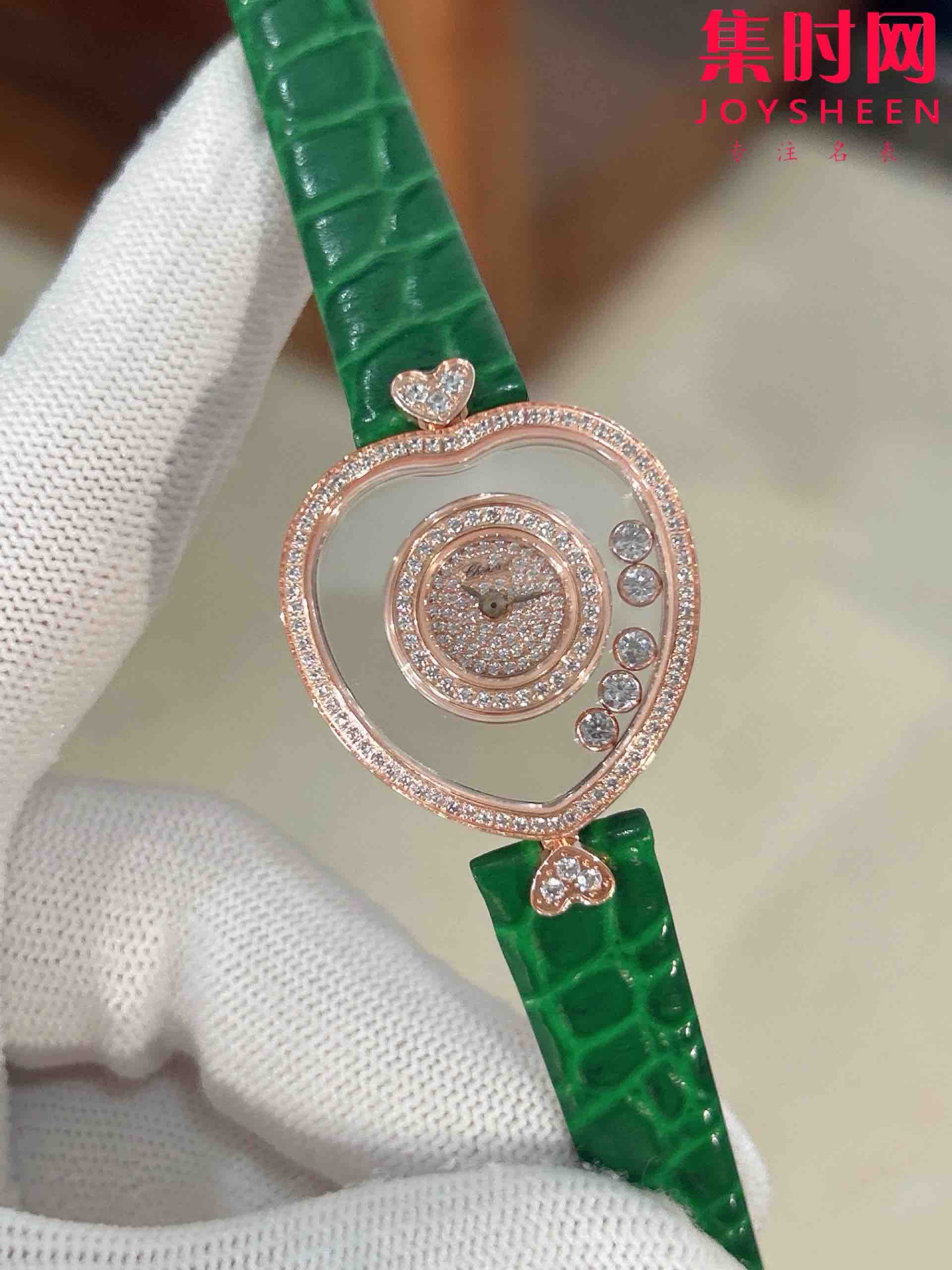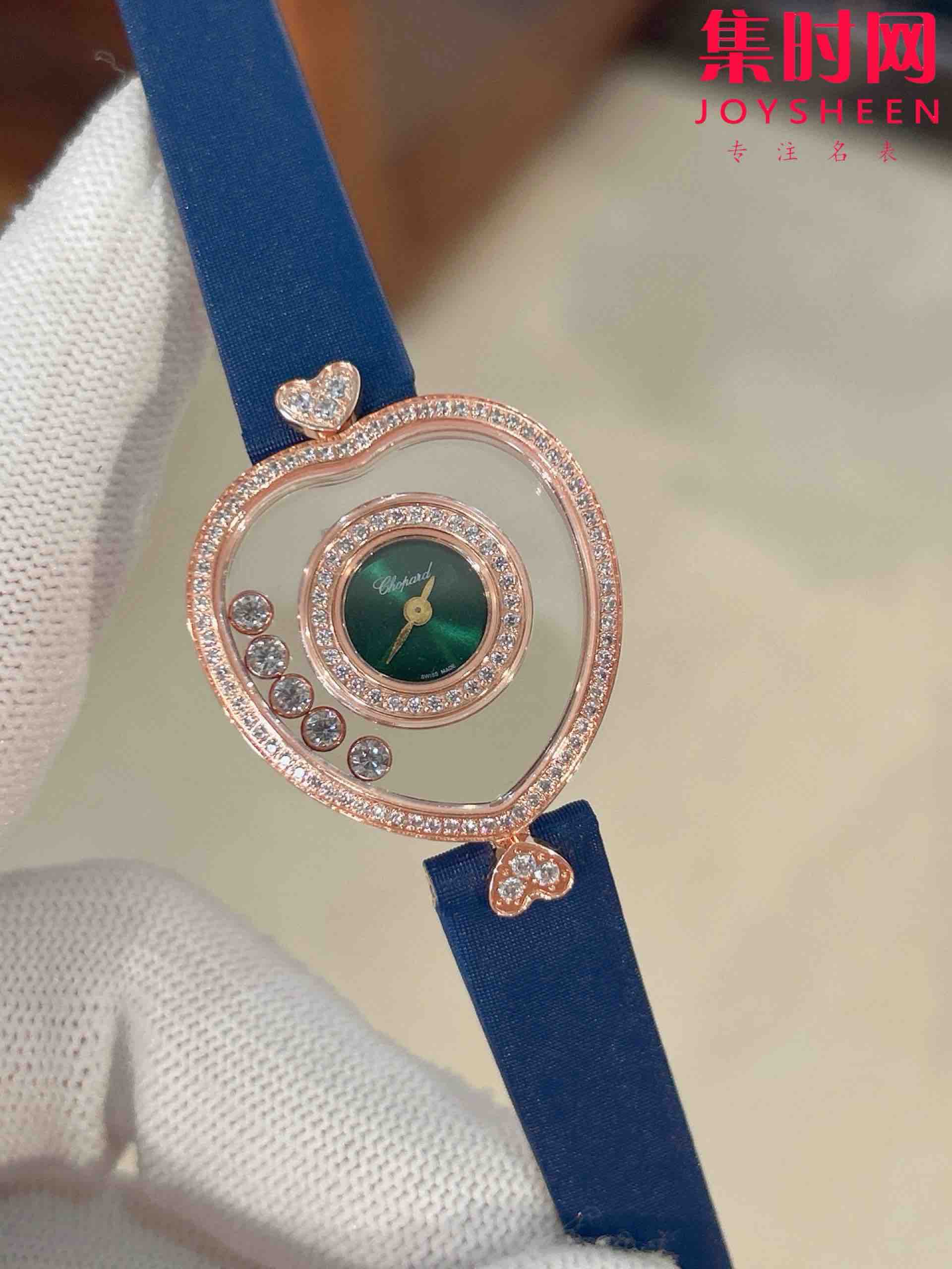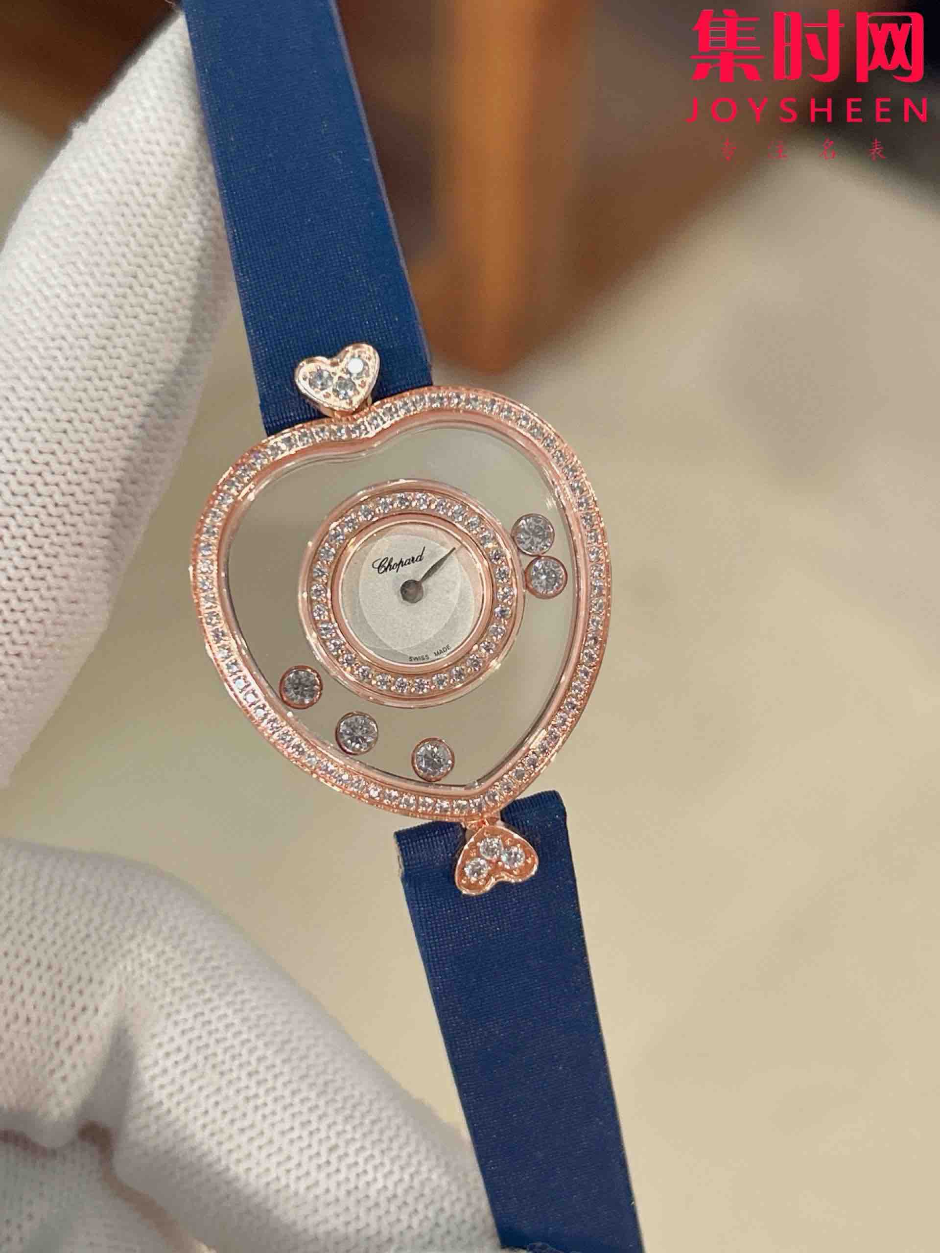 萧邦经典Happy diamonds系列 新款女款爱心心形快乐钻系列 女士腕表 表径26mm 心形钻圈表盘 瑞士石英机芯 镜面内五颗快乐钻自由转动 活动钻石围绕表盘回旋起舞 制作精巧的表壳玩味透明概念 chopard家标志性的Happy钻石在两片蓝宝石水晶玻璃 形成的空间内自由滑动 充分展现自由和欢快的感觉 表壳ding端与底端各缀有一粒单颗心形钻石 树叶形指针 较小的同心圆为珍珠母贝质地 呈圆满的球型 两个同心圆环上皆全手工镶有钻石 五颗灵动钻石如悬空漂浮一般 细节见真知