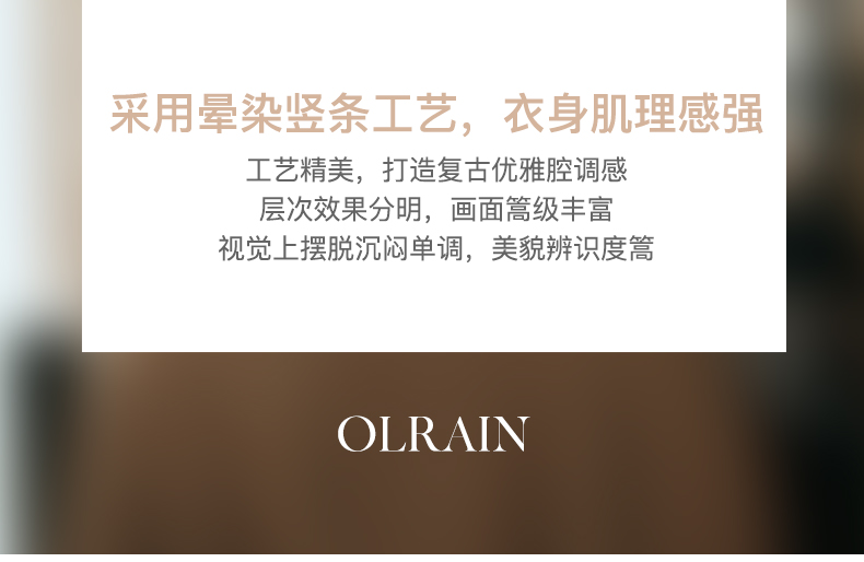 - “精致”是欧芮儿olrain品牌文化的核心,欧芮儿认为,精致的女人,不但要外在动人,更要内在迷人,内外兼修,有魅力、有气质、有内涵,自信而不自傲,优雅而不矫揉,自有万种风情而不轻浮,更不故作矜持。