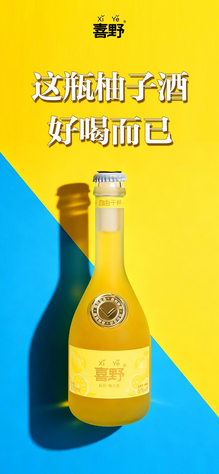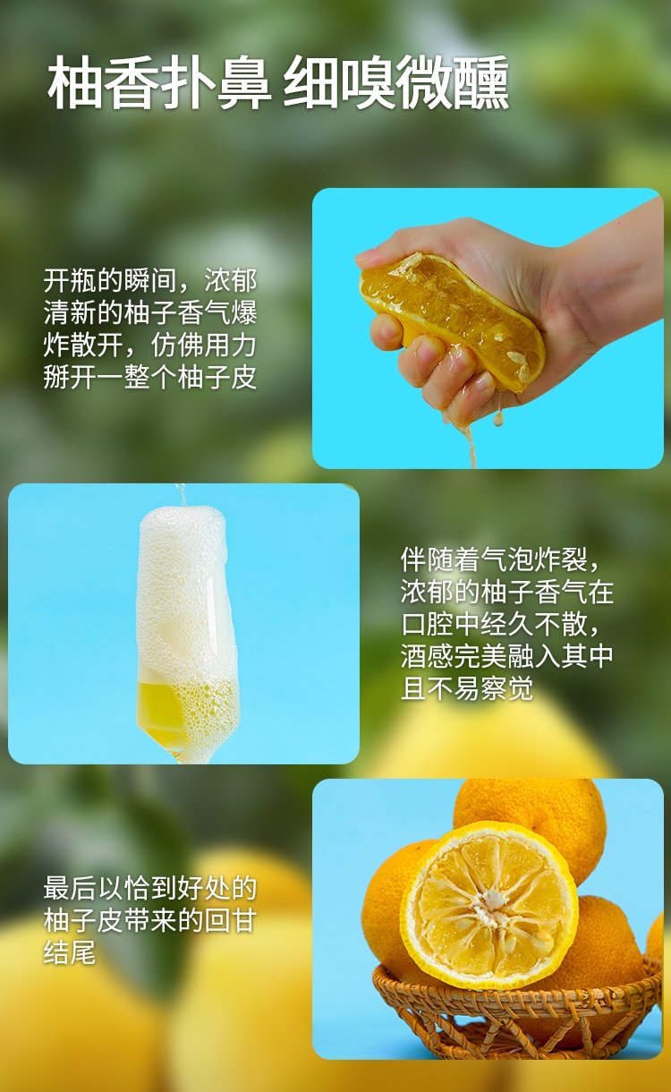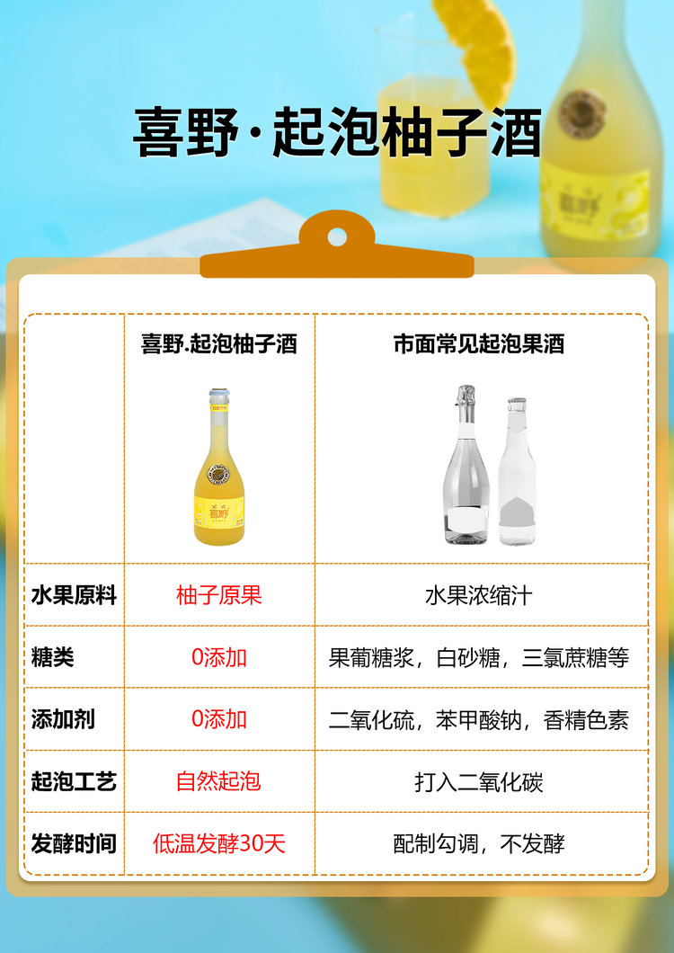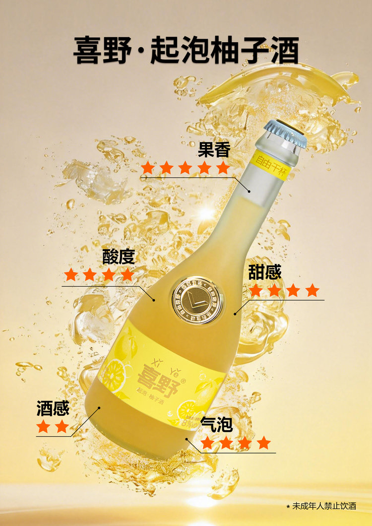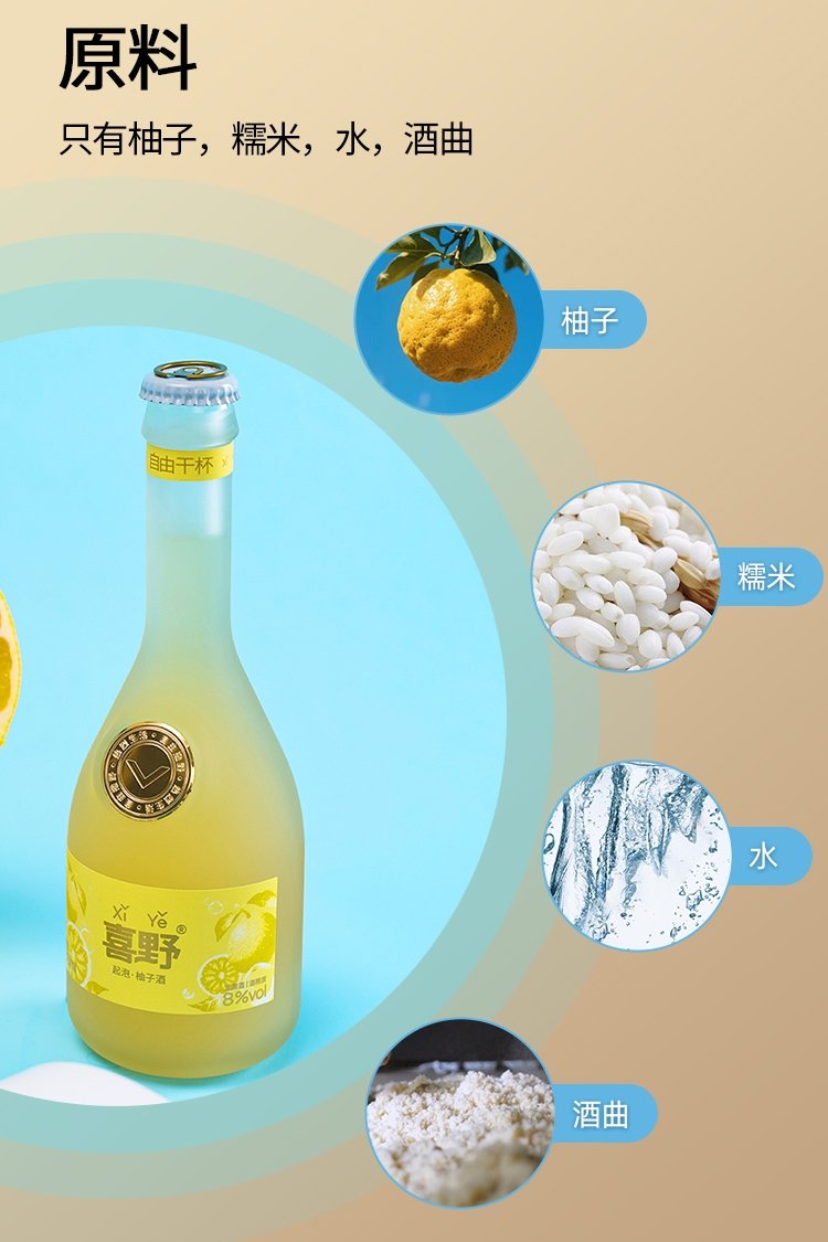 【喜野起泡柚子酒】8度微醺水果酒330ml 无添加、 赠酒杯