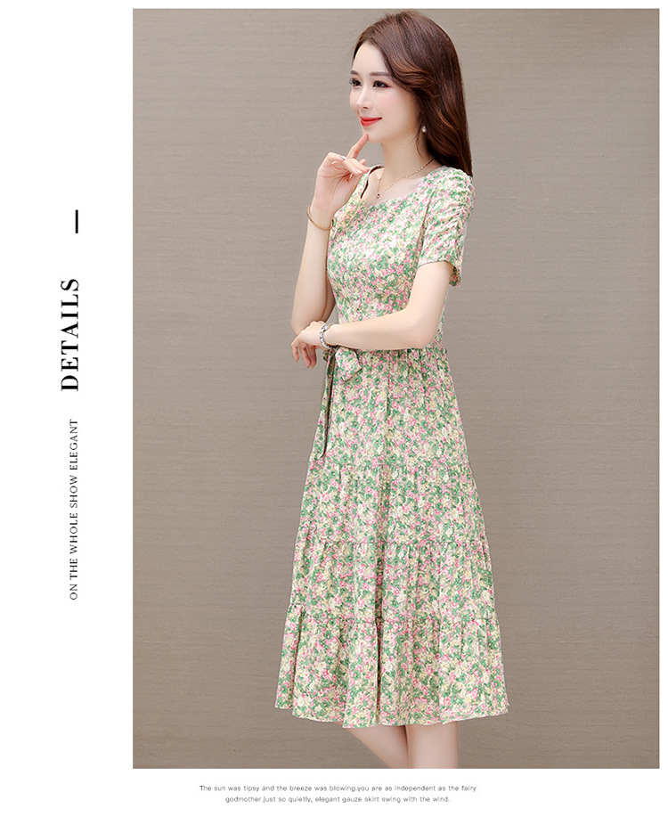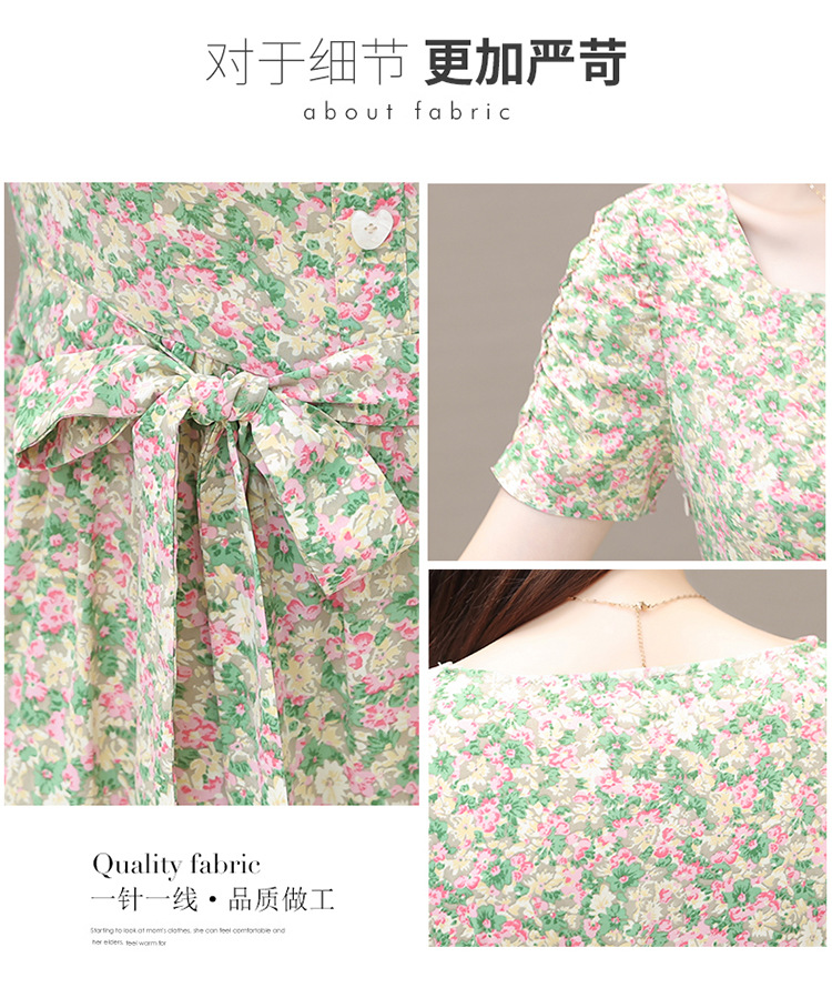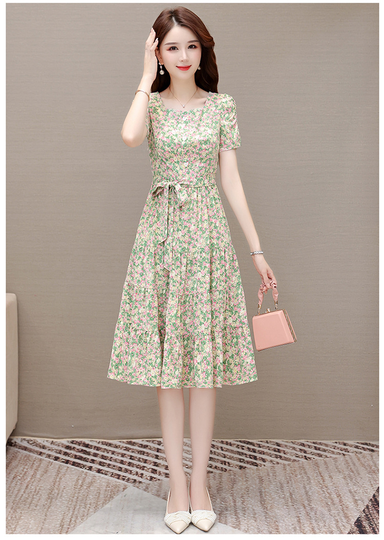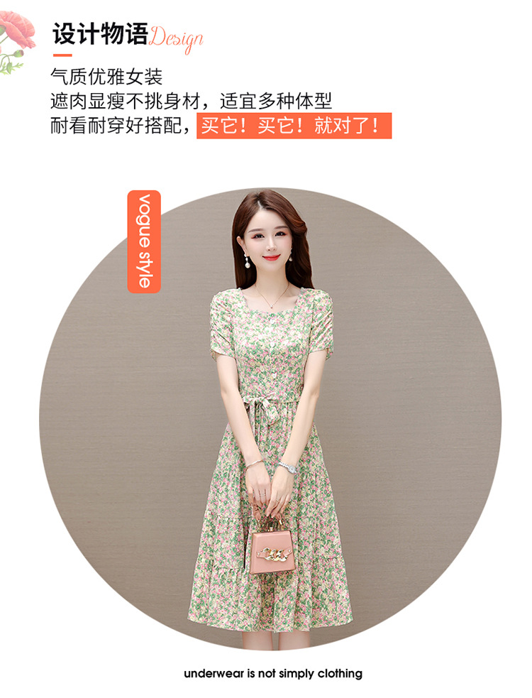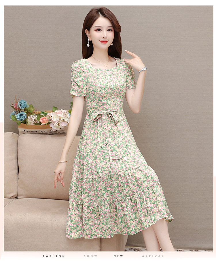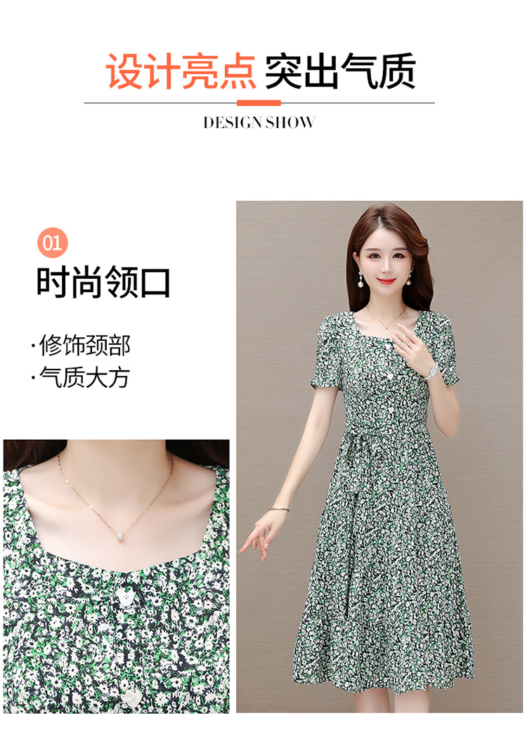 气质夏款,中长款碎花简约系带收腰时尚雪纺裙方领短袖连衣裙QYM-DFN-A2857-L