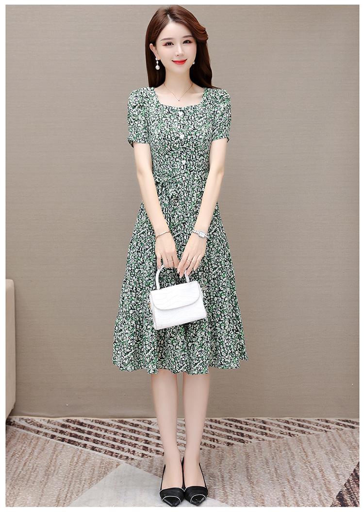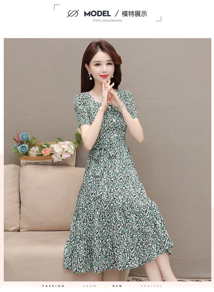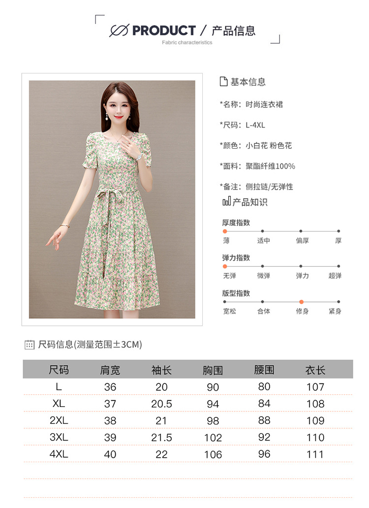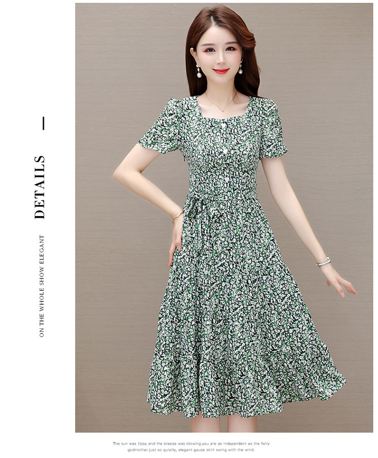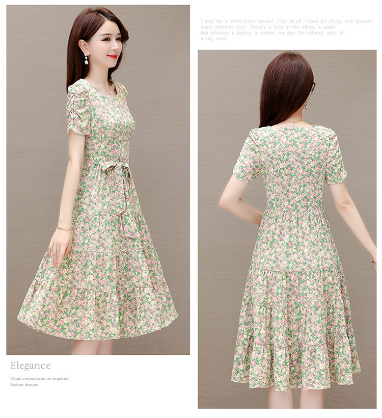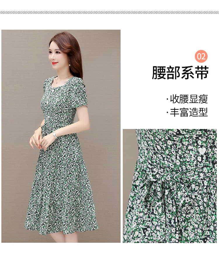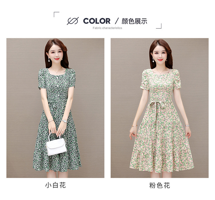 气质夏款,中长款碎花简约系带收腰时尚雪纺裙方领短袖连衣裙QYM-DFN-A2857-L
