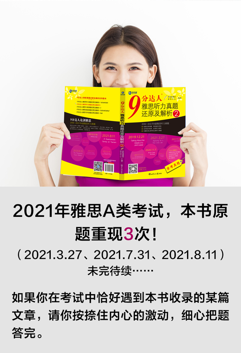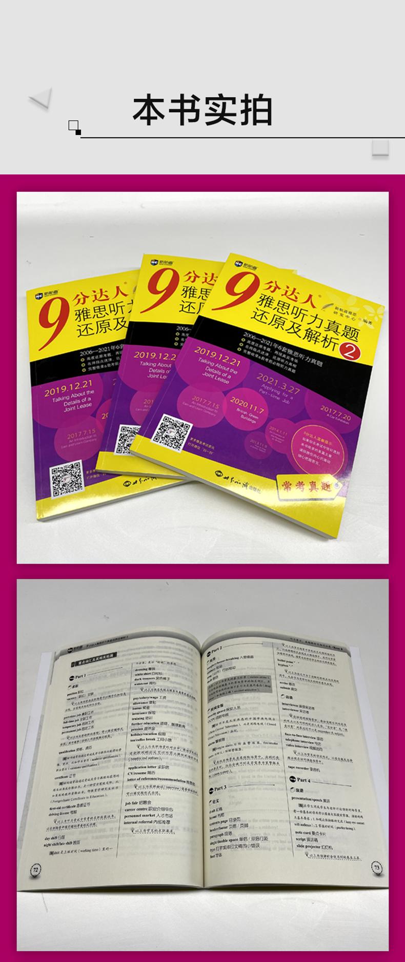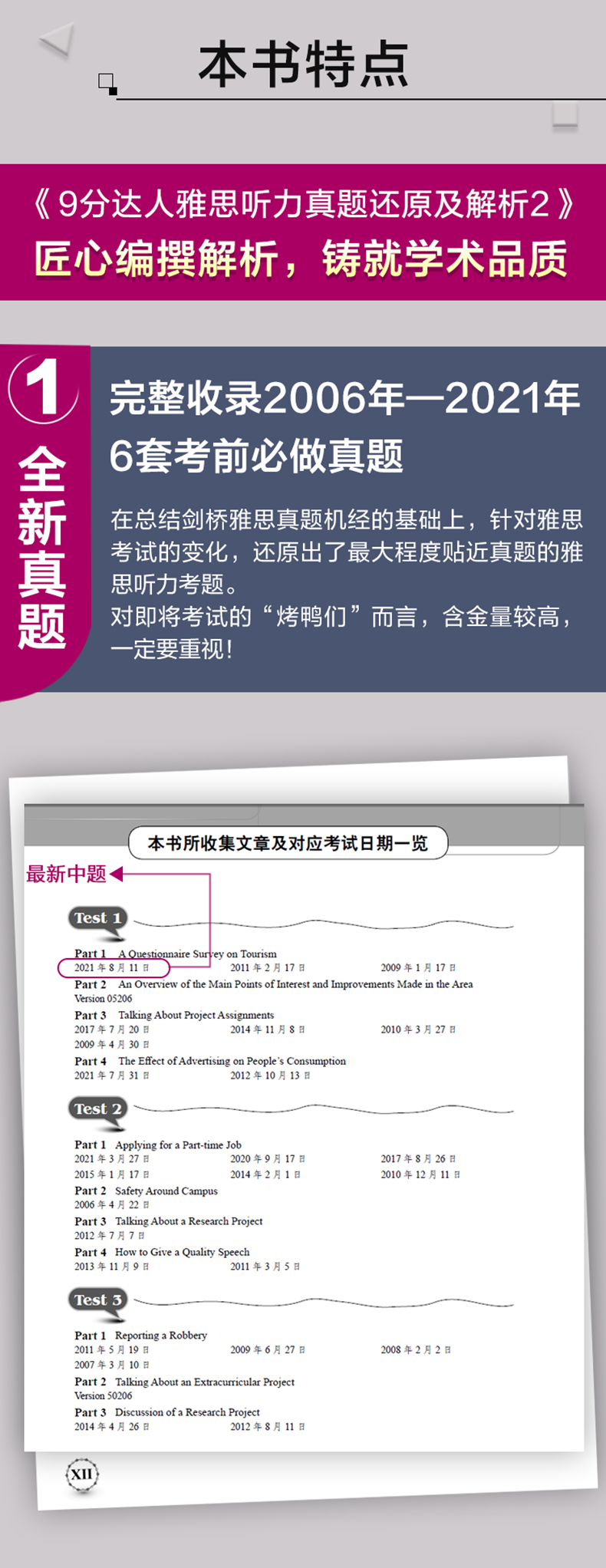 本书在总结剑桥雅思真题机经回忆的基础上,针对雅思考试的变化,还原了贴近真题的雅思听力考题。本书特色如下:一、收录6套真题。每套题的题目设置都经过了编者的悉心考量,并配有听力原文、详细解析、词汇拓展、参考答案。二、题型全面,选取高频场景。在题型分配上,本书涵盖了有可能出现在雅思听力考试中的常见题型,如填空题、选择题、地图题、配对题等;在场景选取上,书中主要选择了雅思考试的高频场景,如租房购物、旅游咨询、课程讨论等。三、附赠音频。所有音频均由外籍专业配音员进行录制,力求与雅思听力考试的语速保持一致,准确还原雅思听力考试的每一个细节。