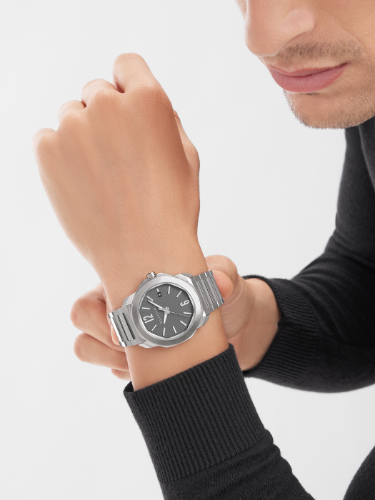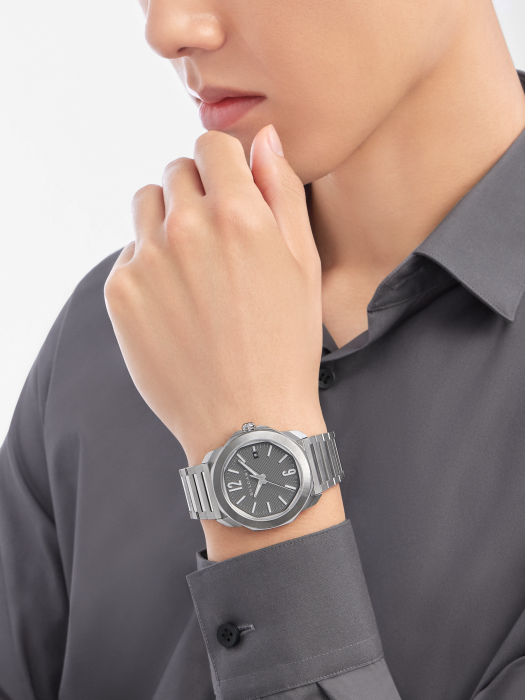 镜面 材质 | 蓝宝石水晶玻璃 | 表盘 | 缎面磨砂和抛光精钢表壳,深灰色“巴黎钉纹”(Clous de Paris)表盘,金属质感夜光时标与指针,3时位置设日期视窗 精钢旋入式表冠 |