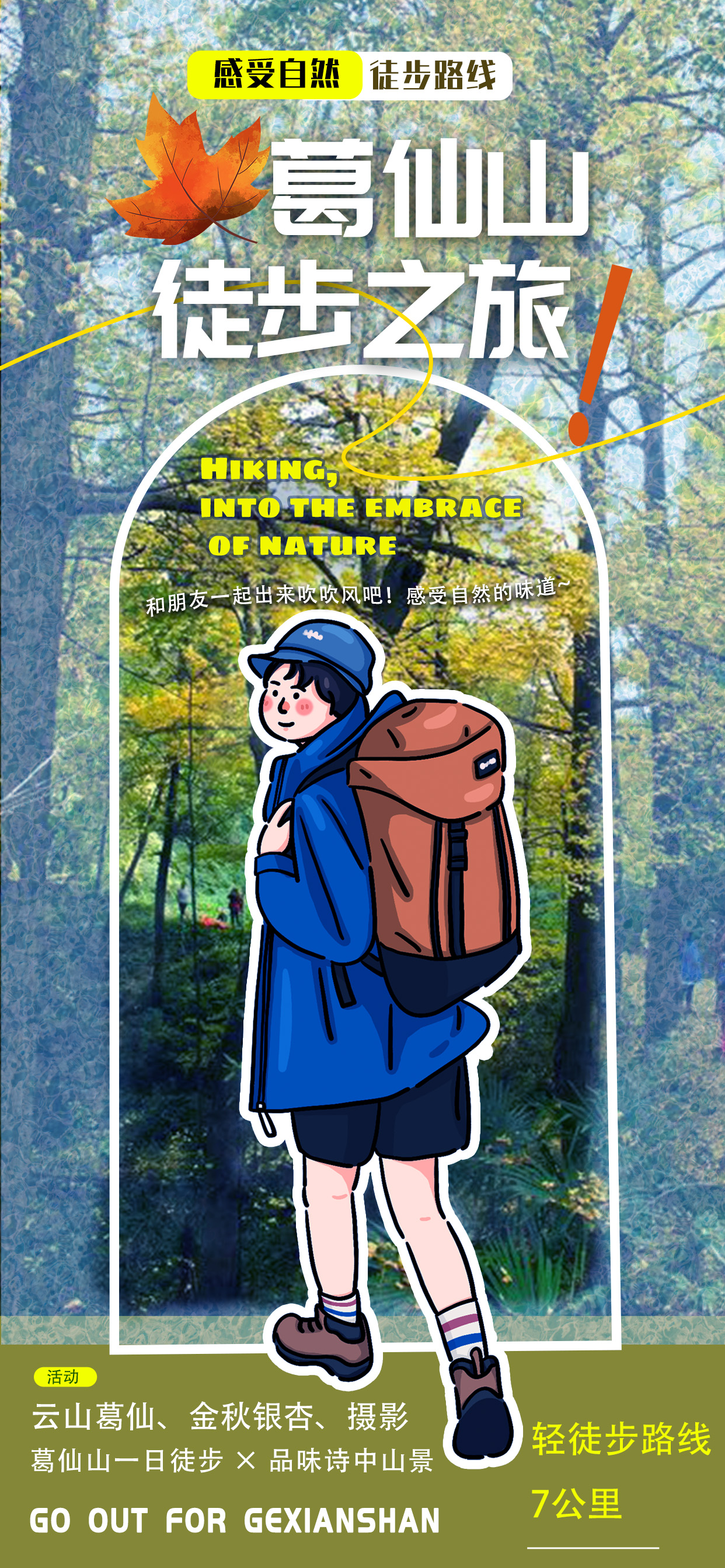 早上在指定地点集合出发,车上领队讲解行程,注意事项,一路欢声笑语。预计10:30到达葛仙山脚下,开始徒步上山,全程徒步7公里左右,土公路+小路,阳光通过枝叶投射下来,光斑点点,举目四望,银杏叶晶莹剔透,光彩夺目,令人叶迷金醉。预计12点左右进入景区,大家可自行午餐,餐后自由活动拍照,银杏摄影创作。16:00大巴车上集合,乘车返回绵阳