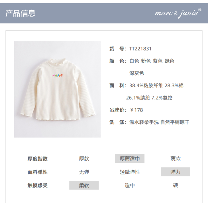 【德绒发热】马克珍妮秋装新款 女童半高领打底衫221831