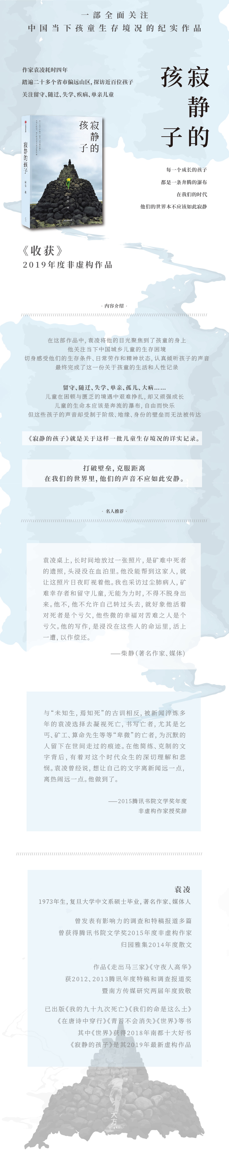 《寂静的孩子》是作家袁凌历时四年走访、探察、记录、沉淀,全新写就的一部非虚构作品。在这部作品中,袁凌将他的目光聚焦到了孩童的身上,他关注当下中国城乡儿童的生存困境,切身感受他们的生存条件、日常劳作和精神状态,认真倾听孩子的声音,终完成了这一份关于孩童的生活和人性记录。