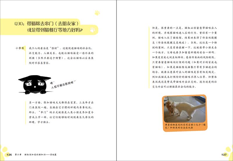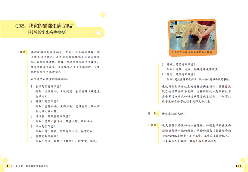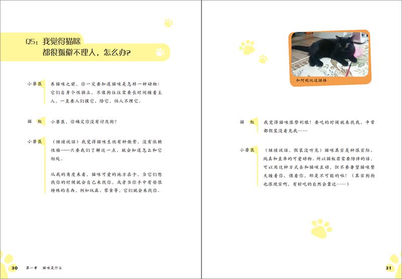 与市面上的多数书籍不同,这是一本猫奴提出问题,然后小兽医负责回答的书,坦白说有一两个问题我本来心想:“啊,这也是问题?”但最后发现,这些问题很有趣也很实用。