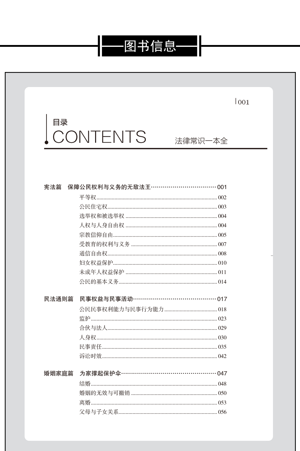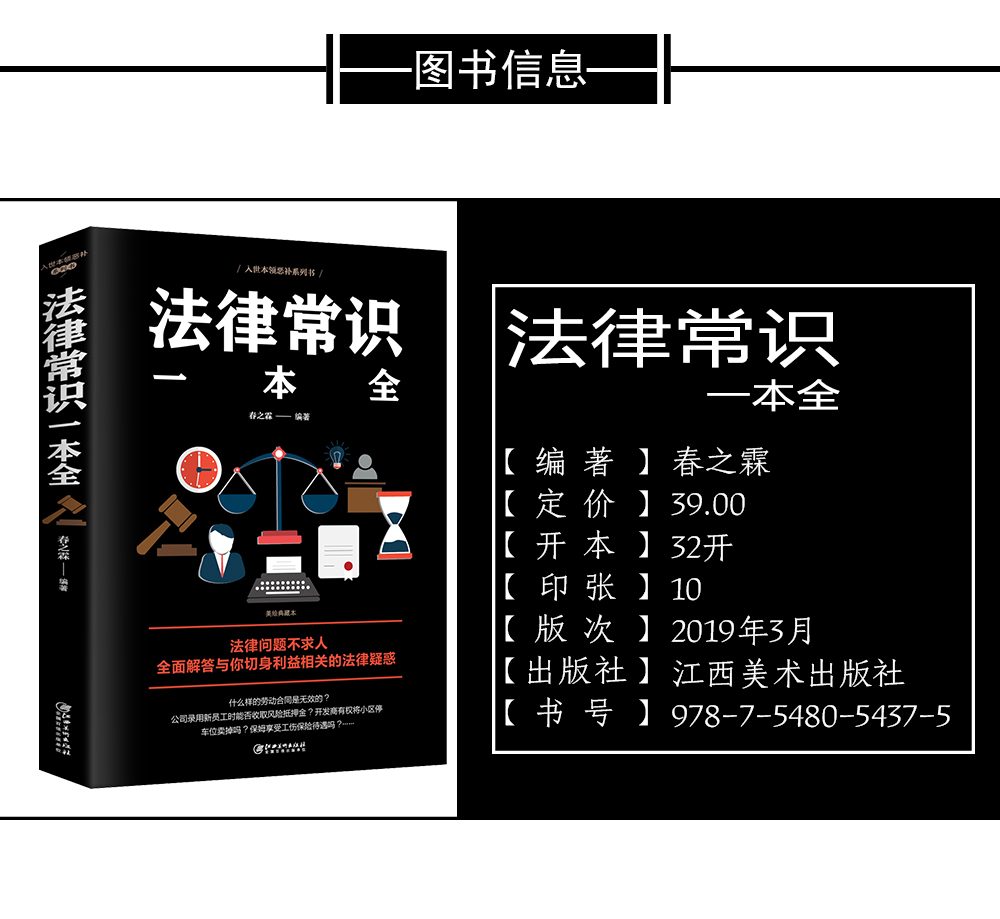 《法律常识一本全》汇总了与我们的生活息息相关的2000个左右的法律常识,通过案例、法律解析、法条链接3个板块,对我们在婚姻家庭、遗产继承、合同纠纷、物业纠纷、房屋买卖租赁、交通事故、医疗事故、工伤赔偿、消费理财、著作发明、刑事犯罪、诉讼程序等方面经常遇到的法律问题进行解答,使我们快速、便捷地找到法律上的解决办法,是个人、企业、家庭实用的法律工具书。