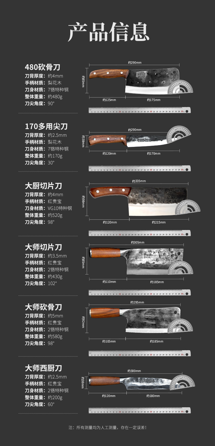 5、大师斩骨刀,刀不太锋利钢性较硬不易折断,适合砍排骨、棒子骨、鸡鸭等较硬食品,不适合切菜切肉等较软食品。
