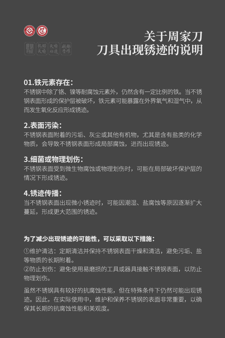 4、新刀具表面有锈斑和污渍,首次使用请用清水多次冲洗、刷洗、擦拭干净后使用。