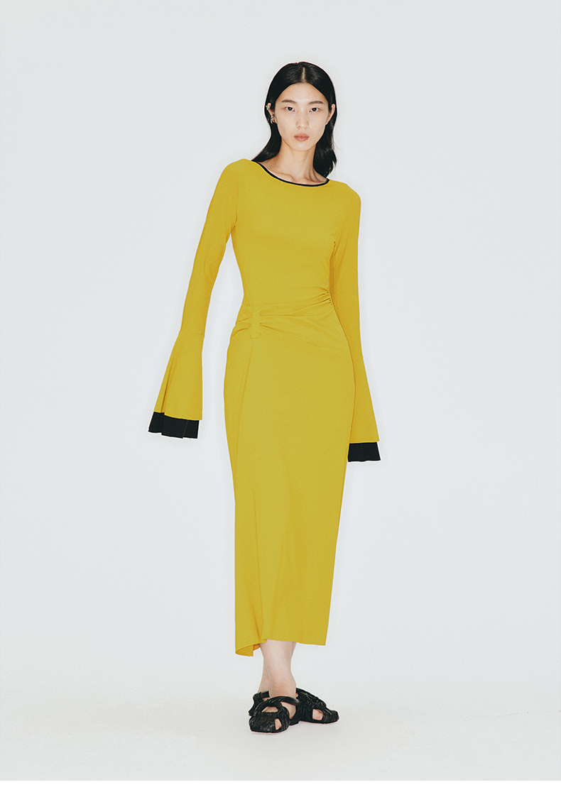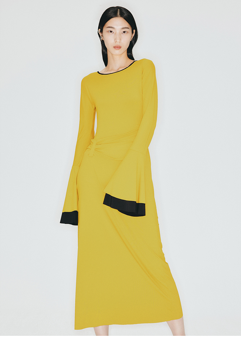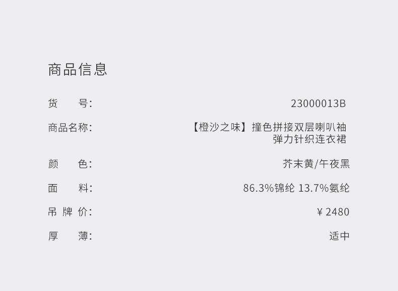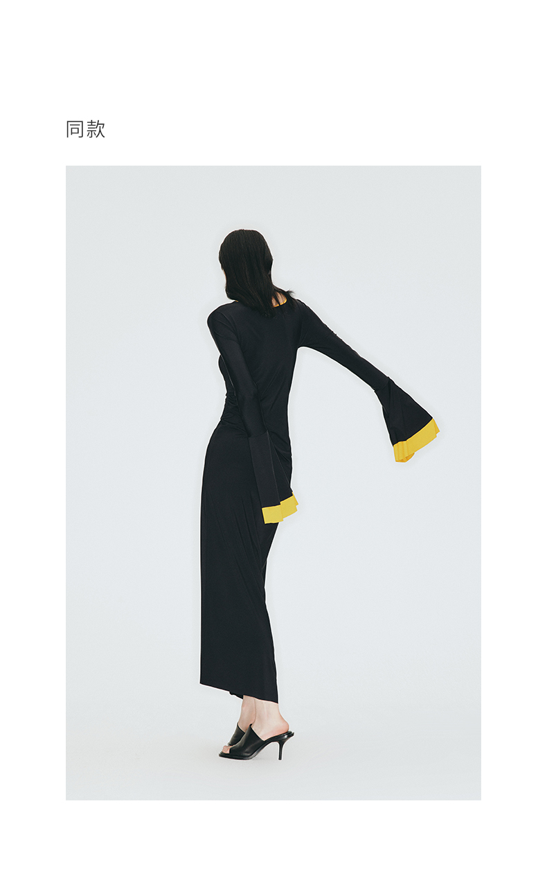 【橙沙之味】撞色拼接双层喇叭袖弹力针织连衣裙/23000013B