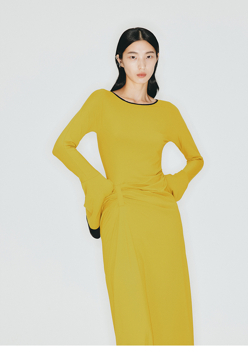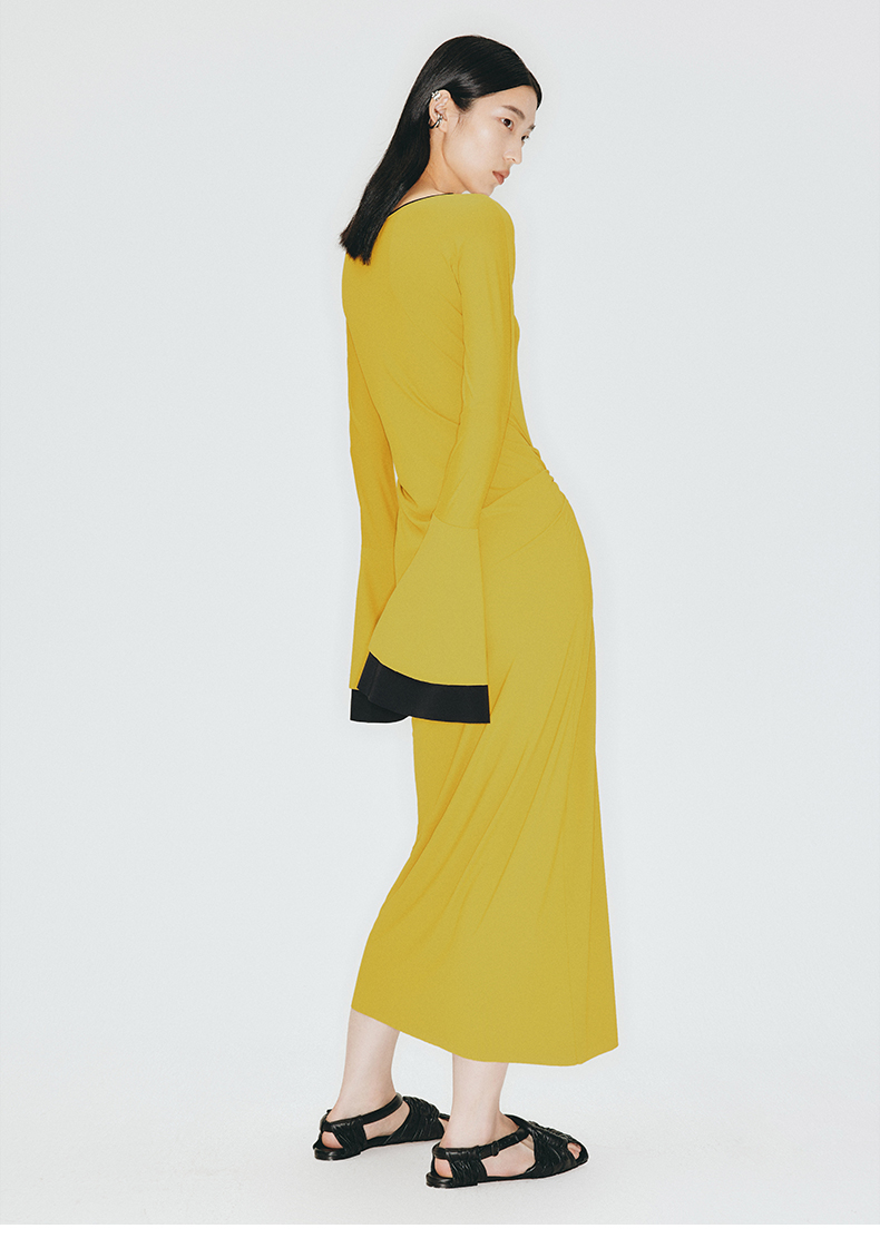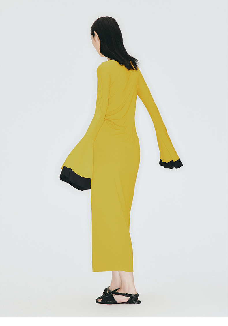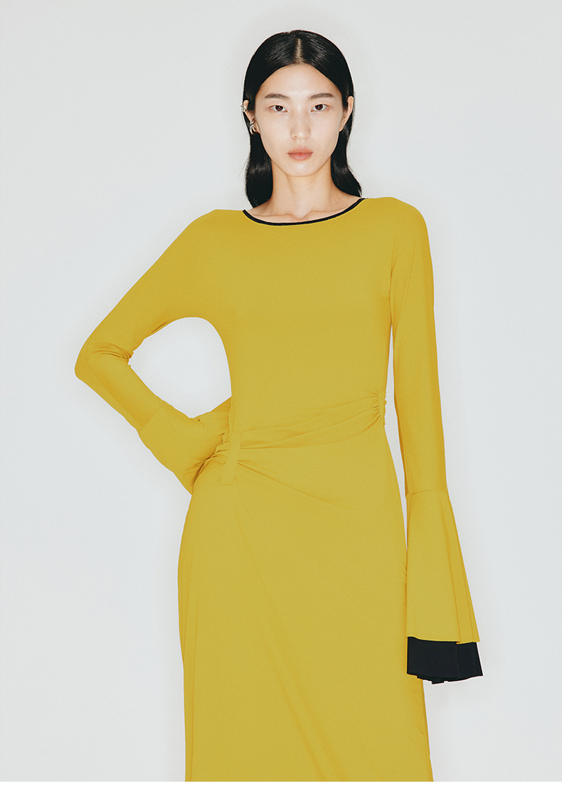【橙沙之味】撞色拼接双层喇叭袖弹力针织连衣裙/23000013B