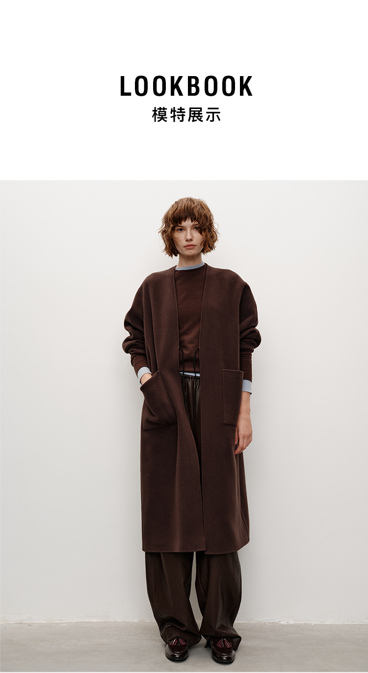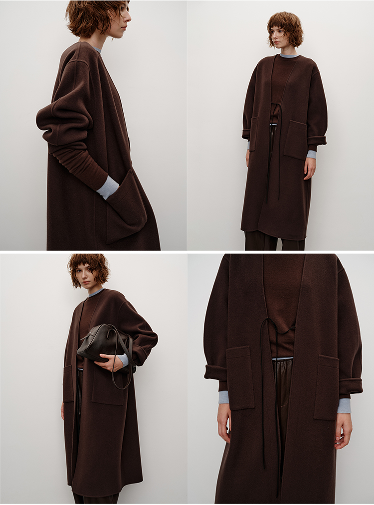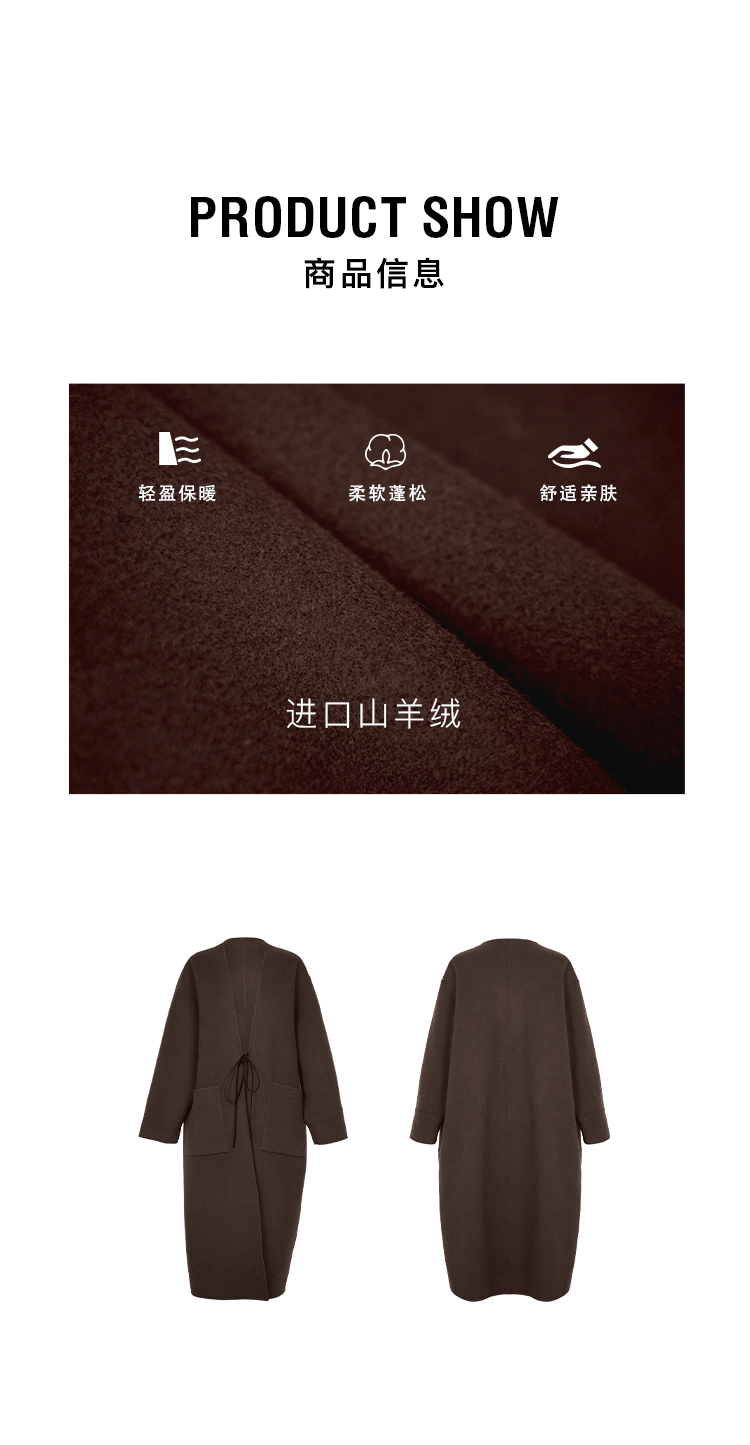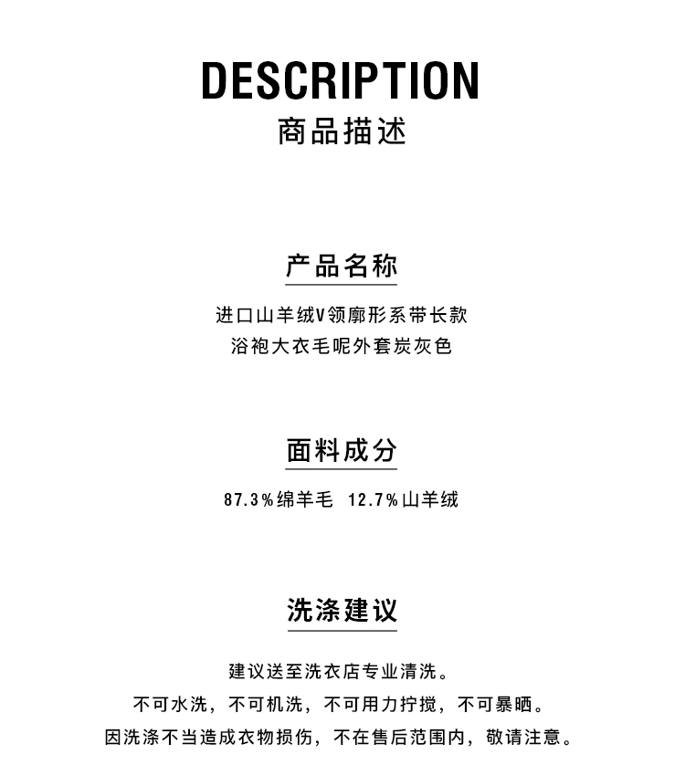 HIDEMI 进口山羊绒v领廓形系带长款浴袍大衣毛呢外套 炭灰色