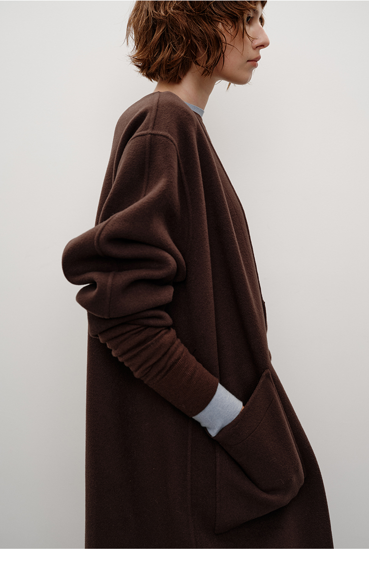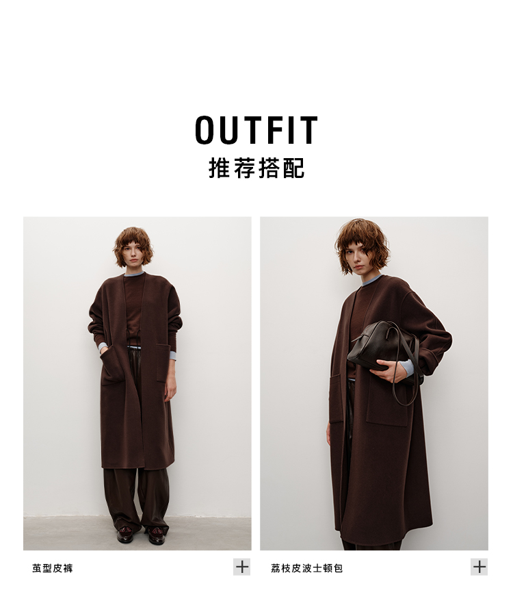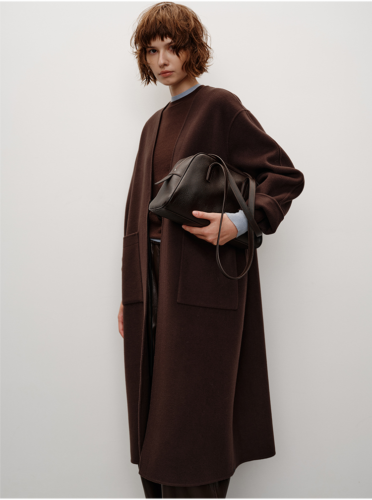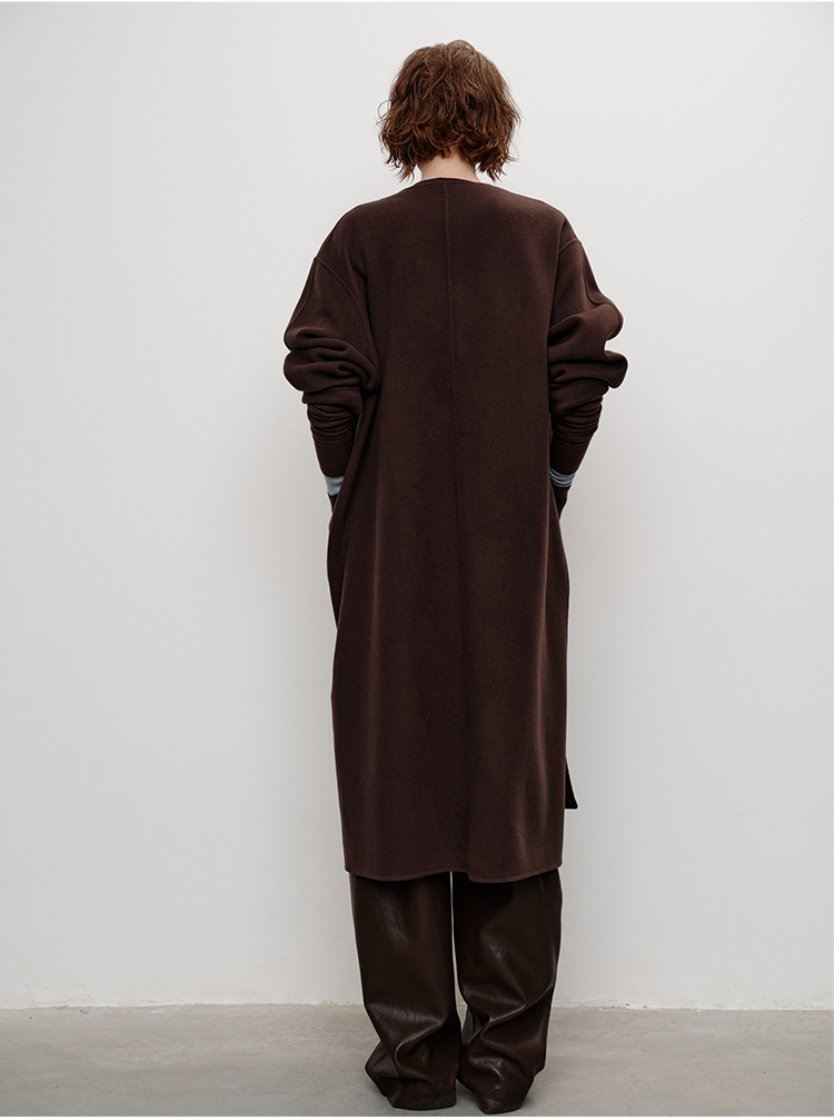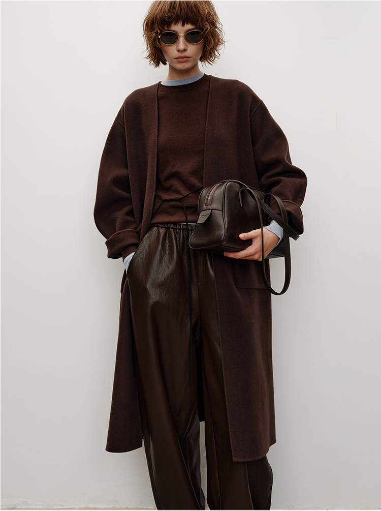 HIDEMI 进口山羊绒v领廓形系带长款浴袍大衣毛呢外套 炭灰色
