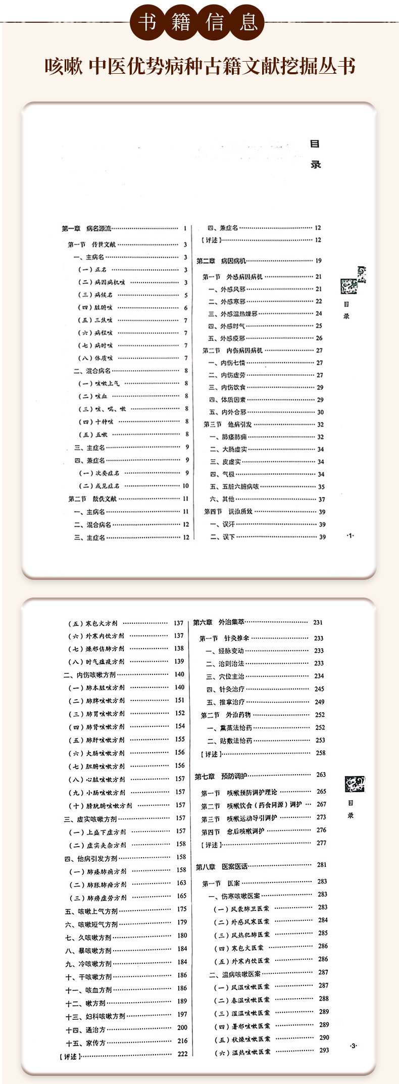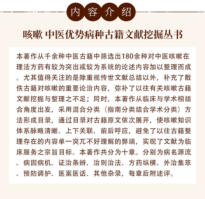 本著作从千余种中医古籍中筛选出180余种对中医咳嗽在理法方药有较为突出或较为系统的论述内容加以整理而成。尤其值得关注的是除重视传世文献总结以外,补充了散佚古籍对咳嗽的重要论治内容,弥补了以往有关咳嗽古籍文献挖掘与整理之不足;同时,本著作从临床与学术相结合角度出发,采用混合分类(指南分类结合学术分类)方法形成目录,通过目录对古籍原文依次展开,使咳嗽知识体系脉略清晰、上下关联、前后呼应,避免了以往古籍整理存在的内容单一突兀不好理解的弊端,实现了文献为临床服务之宗旨目标。本著作共分为十章。分别为病名源流、病因病机、证治条辨、治则治法、方药纵横、外治集萃、预防调护、医案医话、其他杂录,每章后附述评。