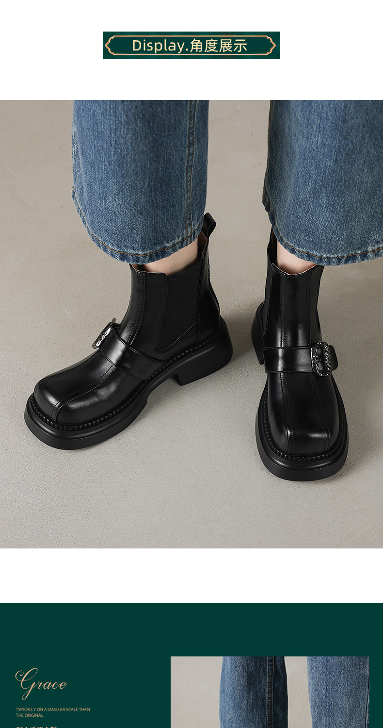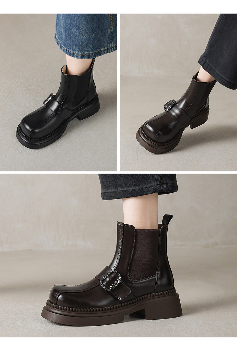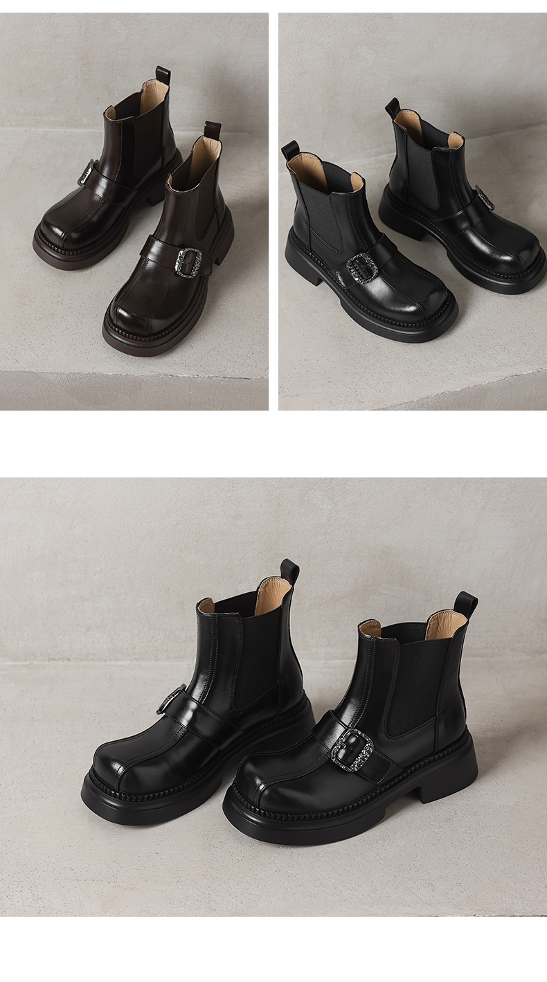 阿么手工女鞋复古烟筒靴女真皮秋冬新款厚底短筒皮带扣短靴5.5CM