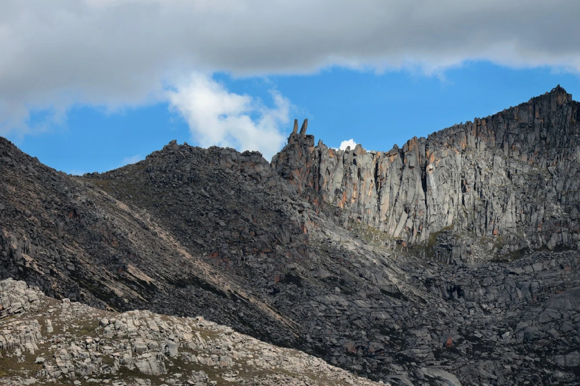 穿亮色外套站在石林间 身后是雪线与蓝天