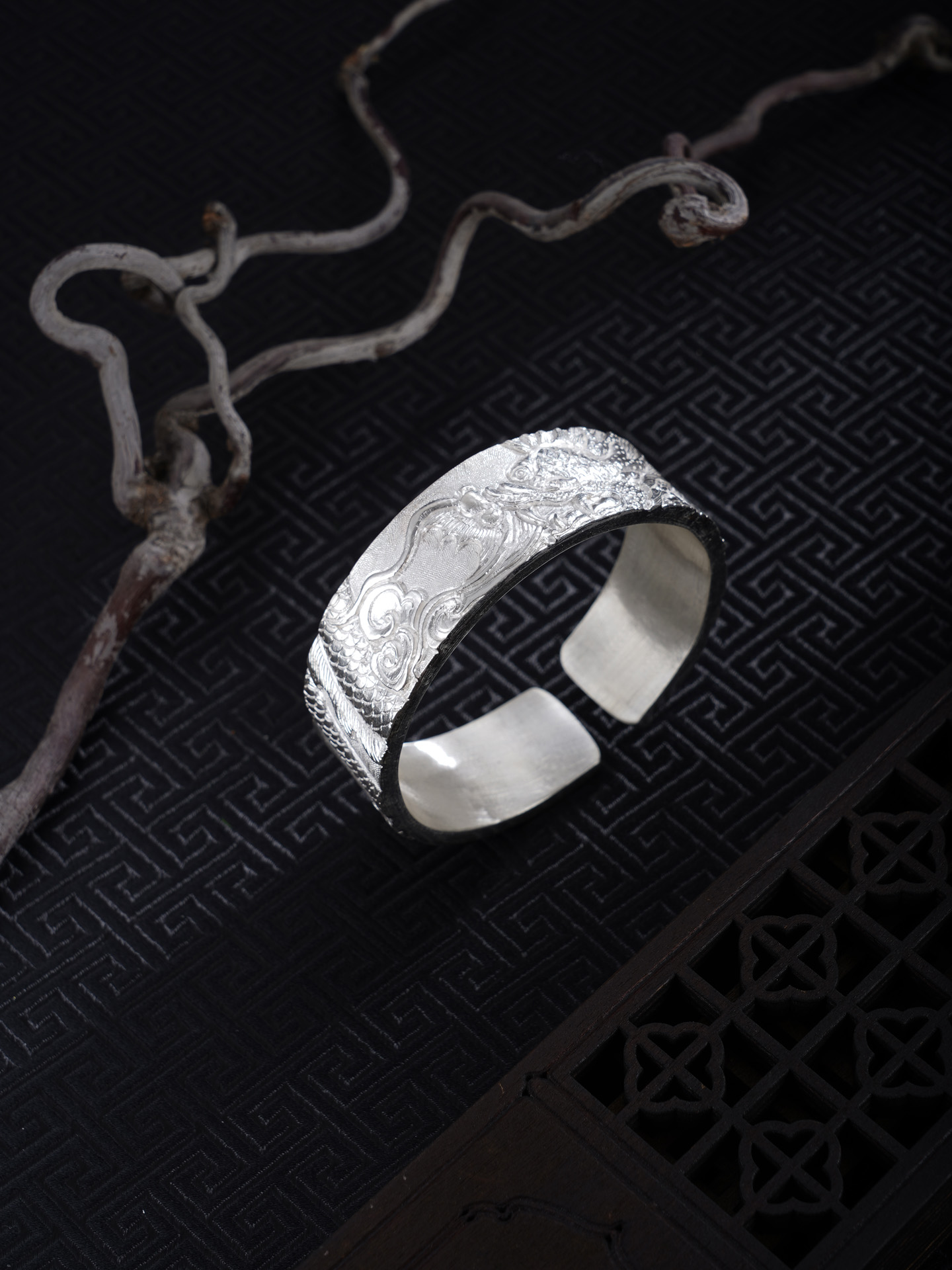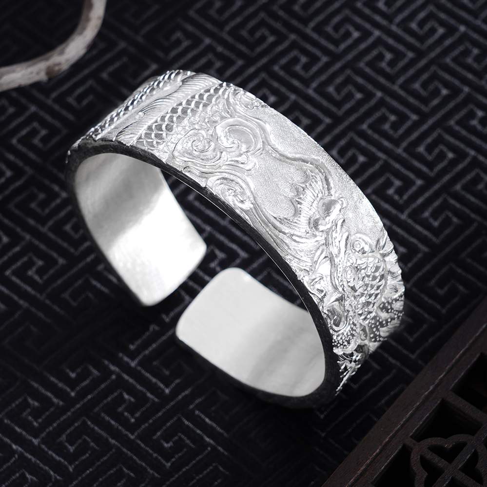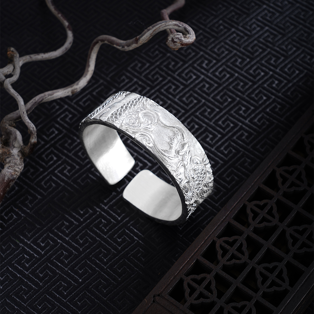 【寓意】:龙居九五之尊,乃四灵之首,象征无上权威与尊贵地位。作品以足银精铸,融合深浅浮雕与抛光工艺,塑造龙腾祥云纹样,礼赞光明盛世,寄寓祖国繁荣富强,蒸蒸日上。