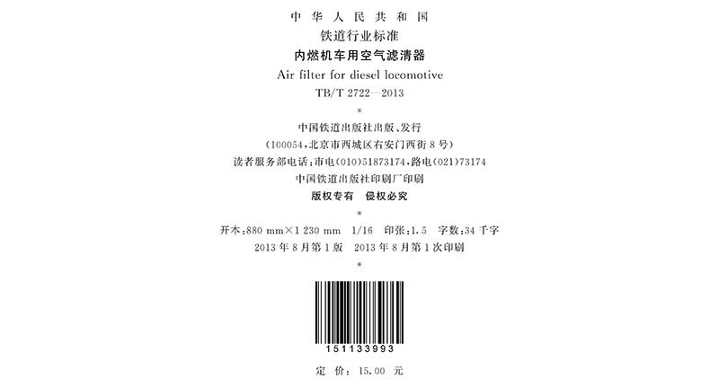 15113.3993 内燃机车用空气滤清器 TB/T 2722—2013