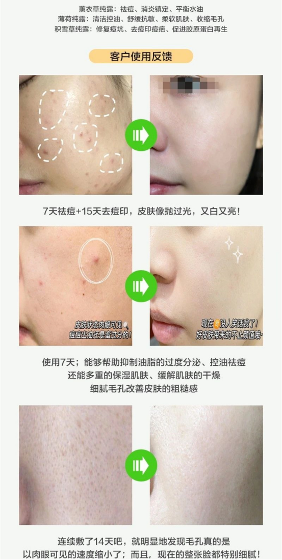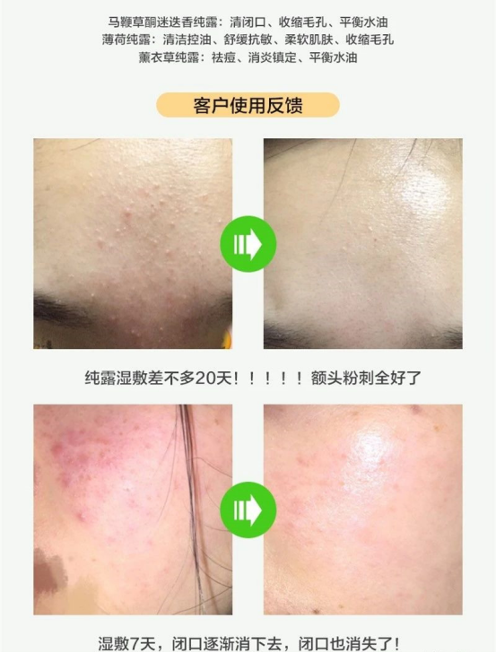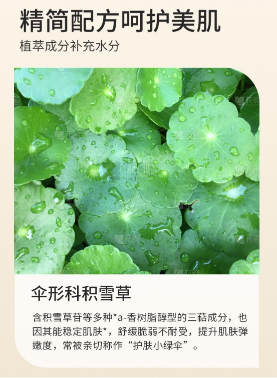 积雪草纯露:补水保湿、修复痘坑、淡化痘印、促进胶原蛋白再生
