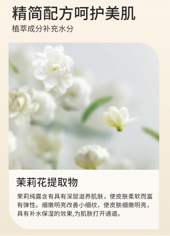 茉莉纯露:舒缓镇定、补水提亮、淡化细纹、细致毛孔、抗初老