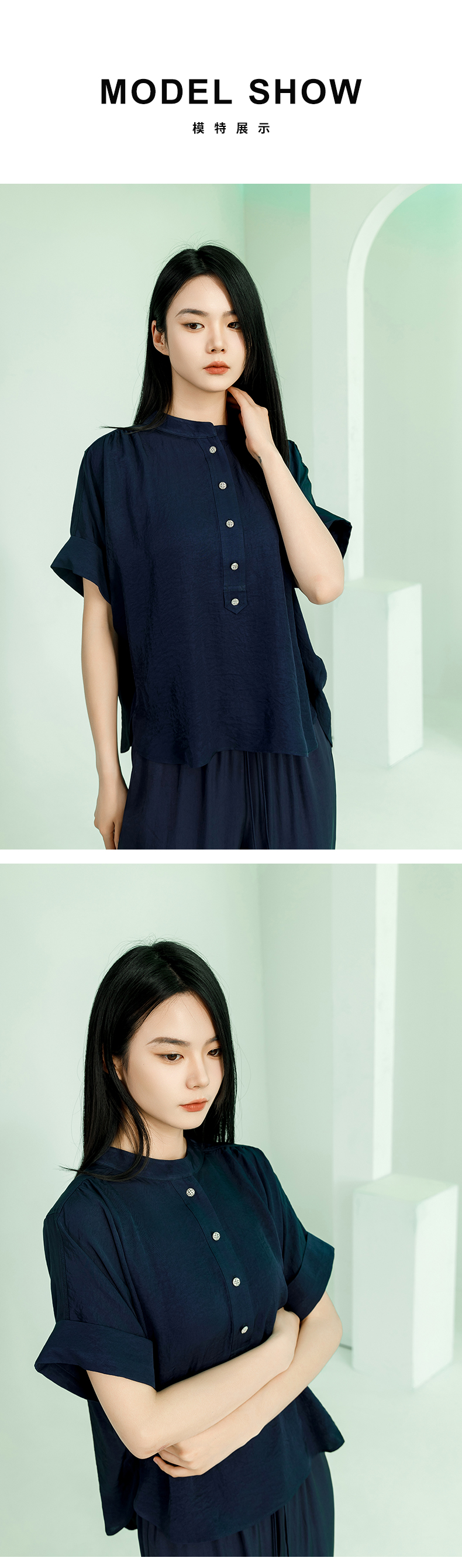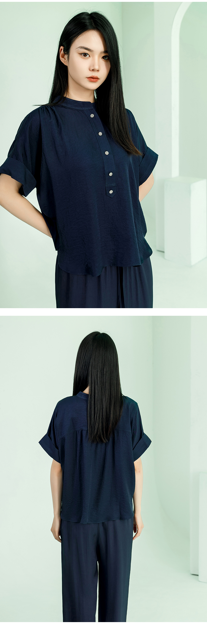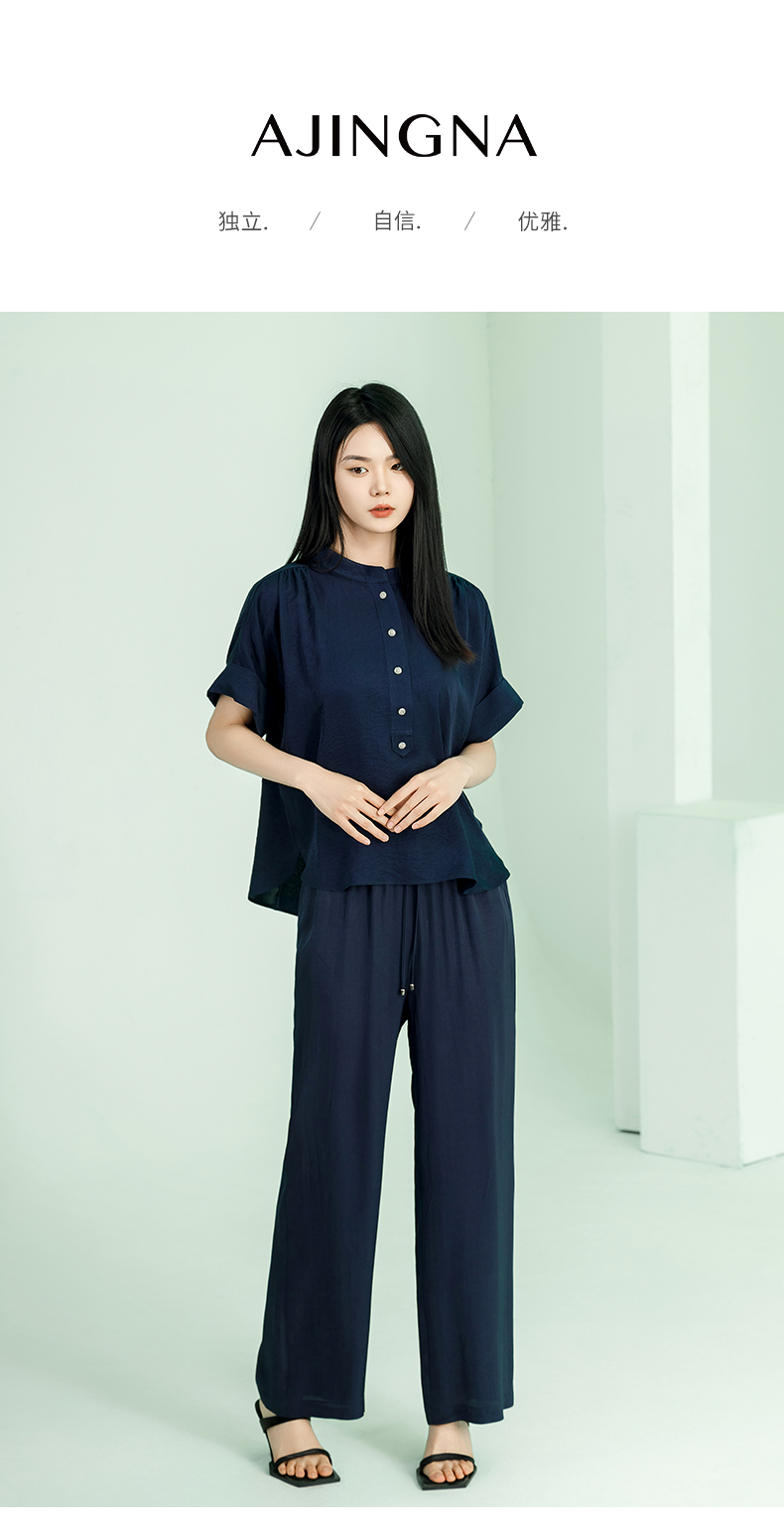 【商场同款】阿菁娜2024夏季新款宽松开叉翻袖扣上衣A30X102029