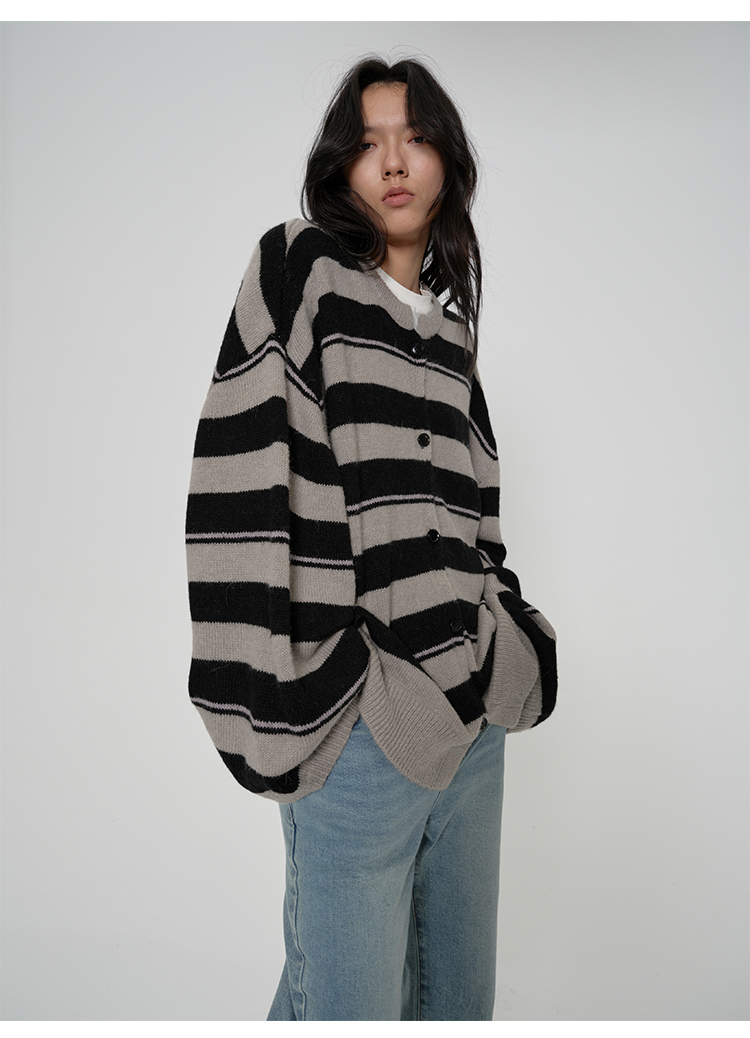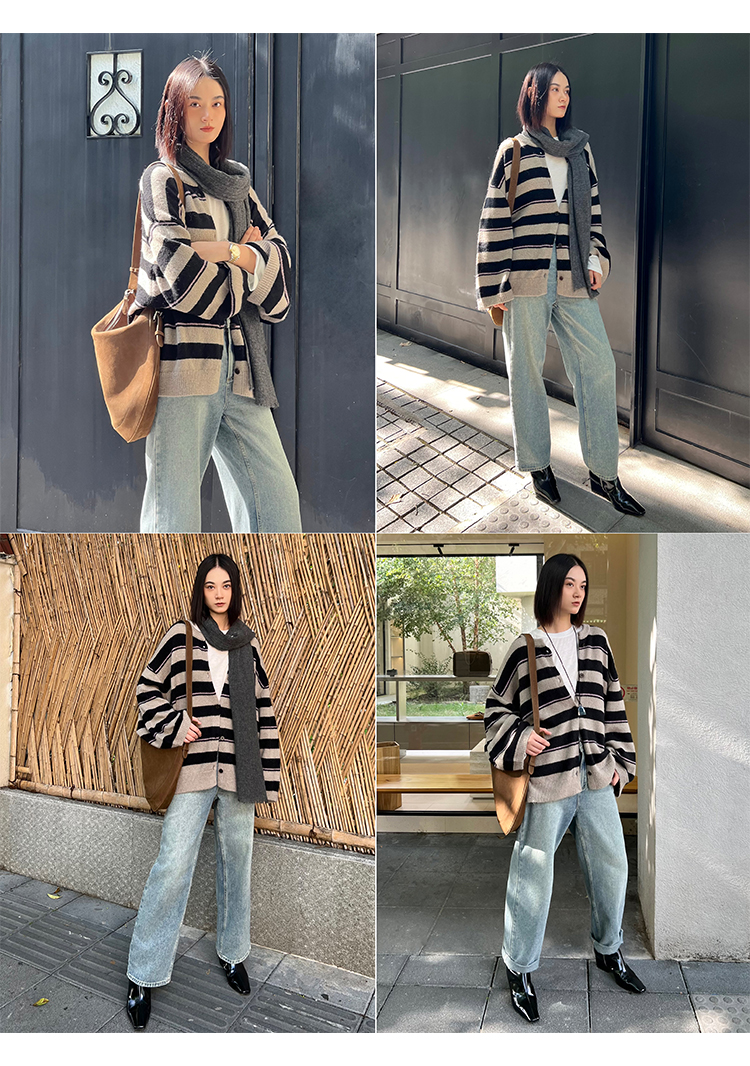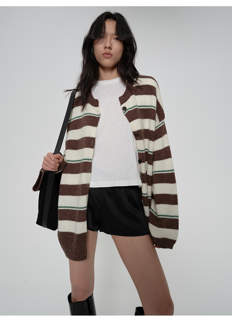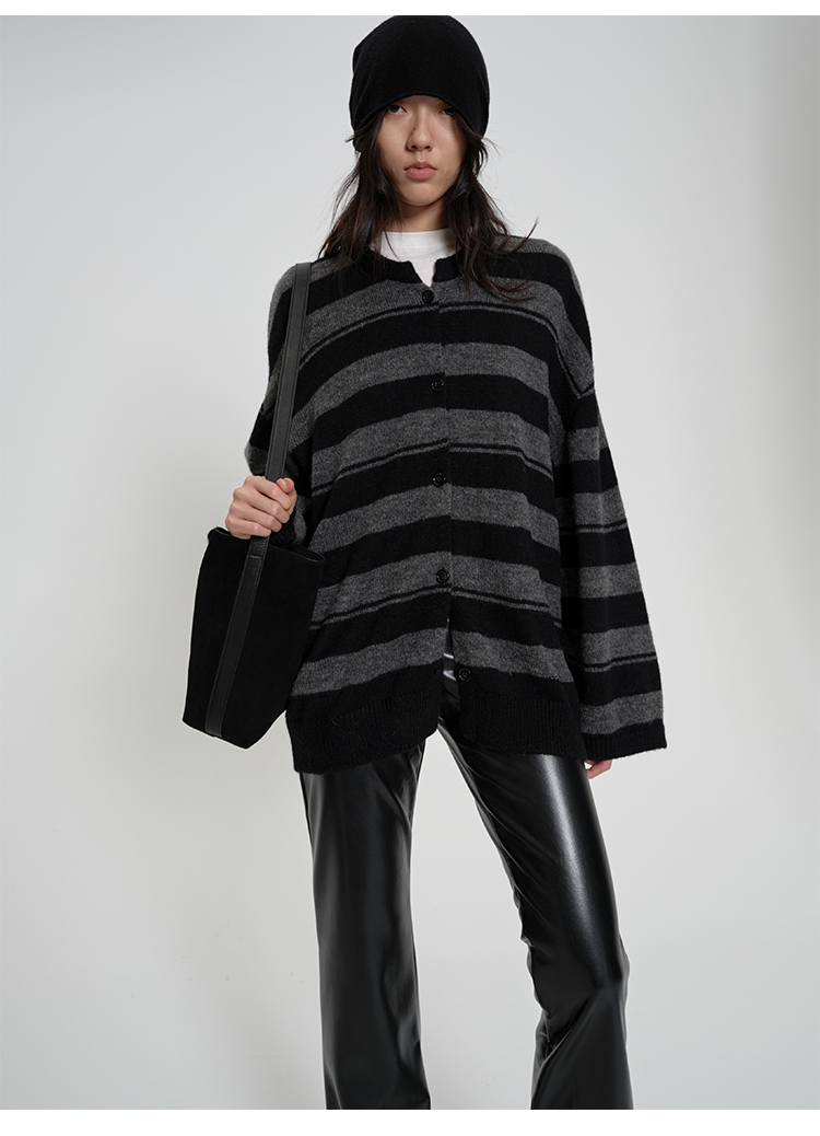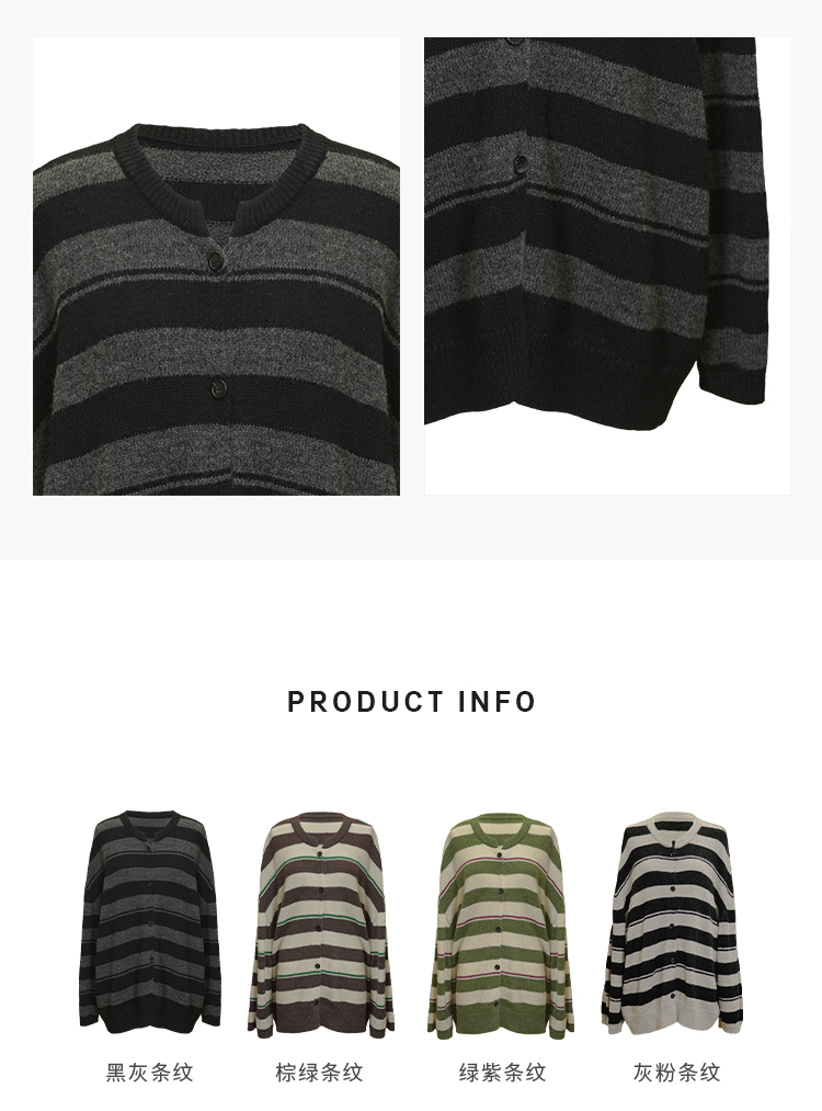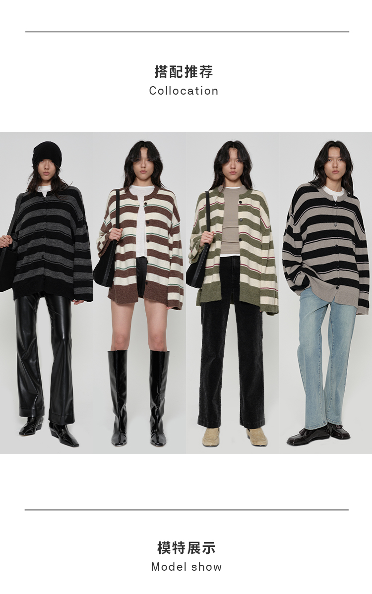 HIDEMI 【当当同款】进口羊驼毛混纺多股纱线条纹松弛感大廓形圆领纽扣开衫外套 黑灰条纹/绿紫条纹/棕绿条纹/灰粉条纹