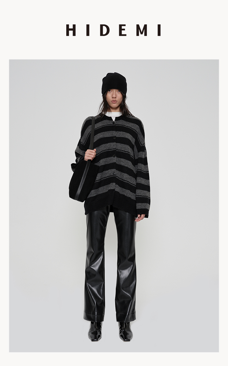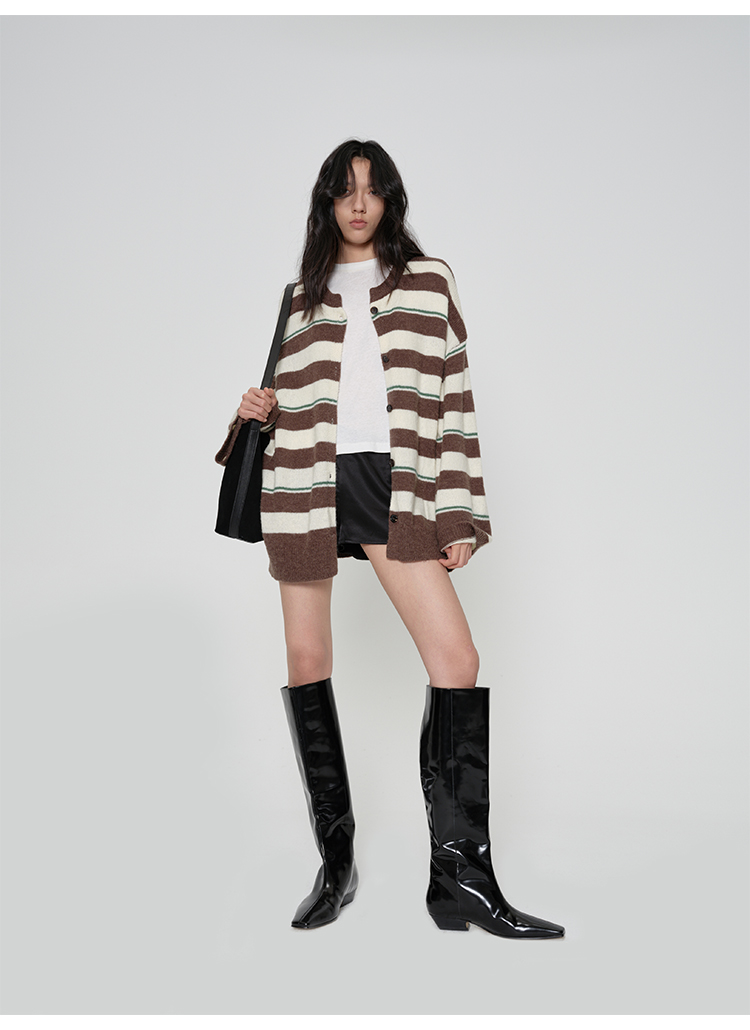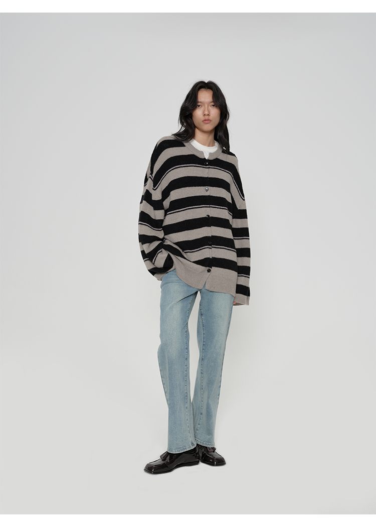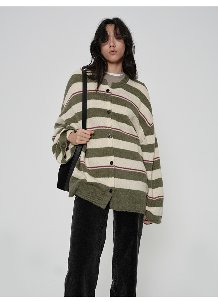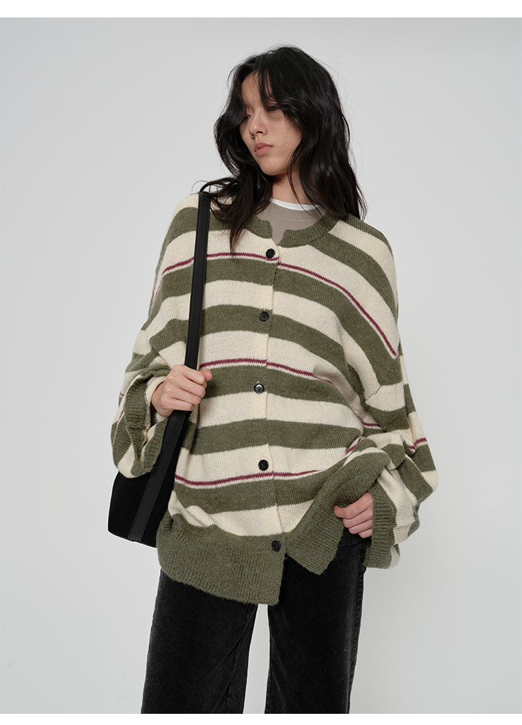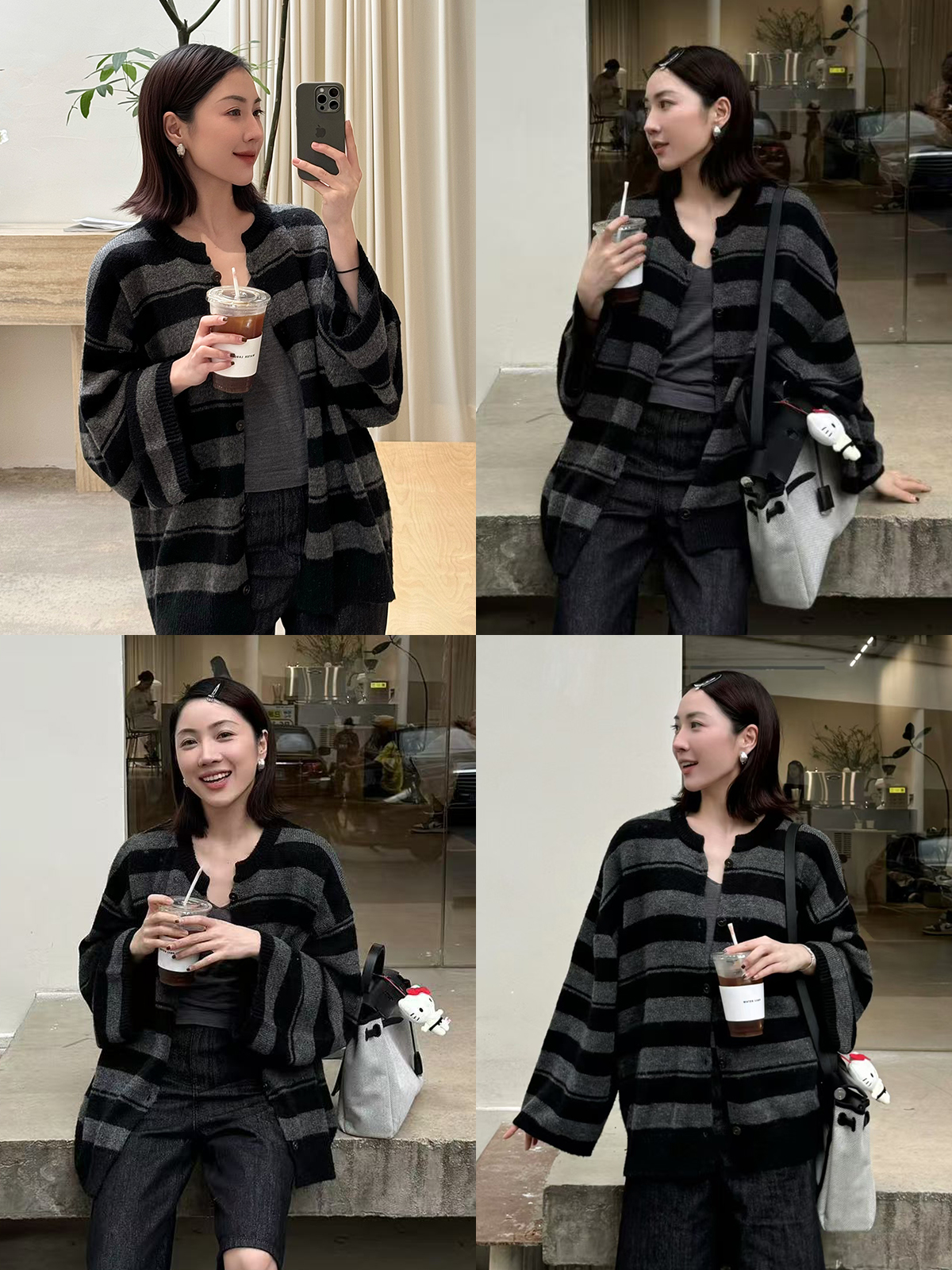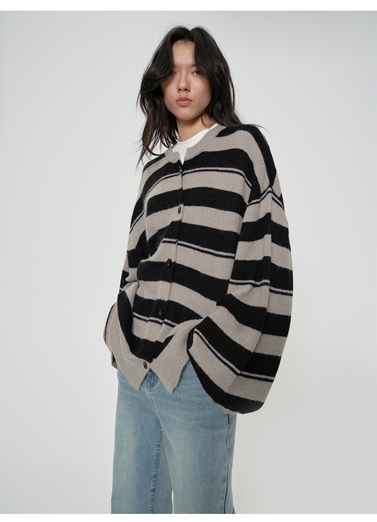 HIDEMI 【当当同款】进口羊驼毛混纺多股纱线条纹松弛感大廓形圆领纽扣开衫外套 黑灰条纹/绿紫条纹/棕绿条纹/灰粉条纹