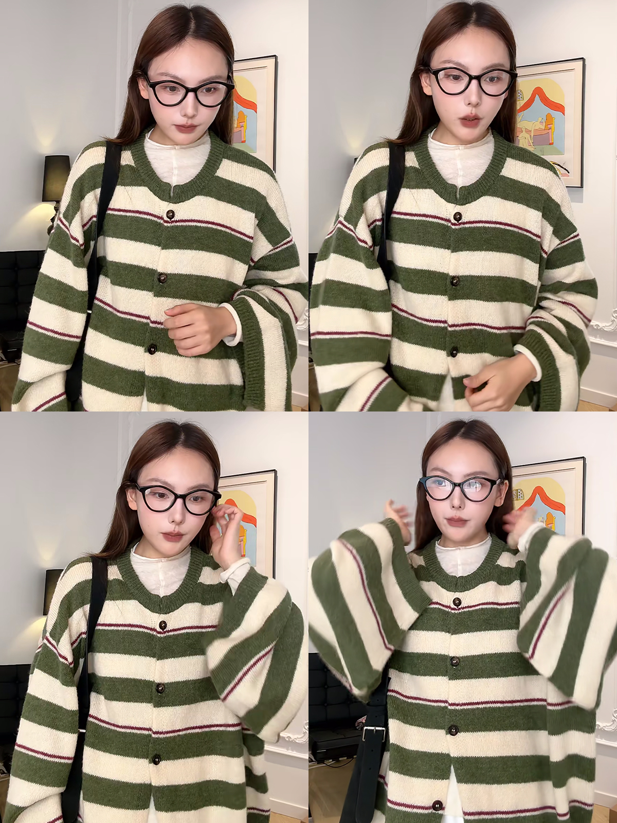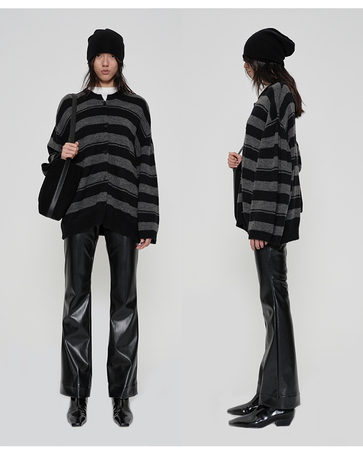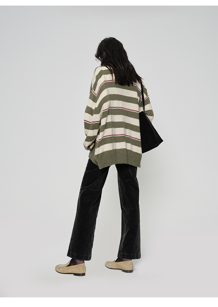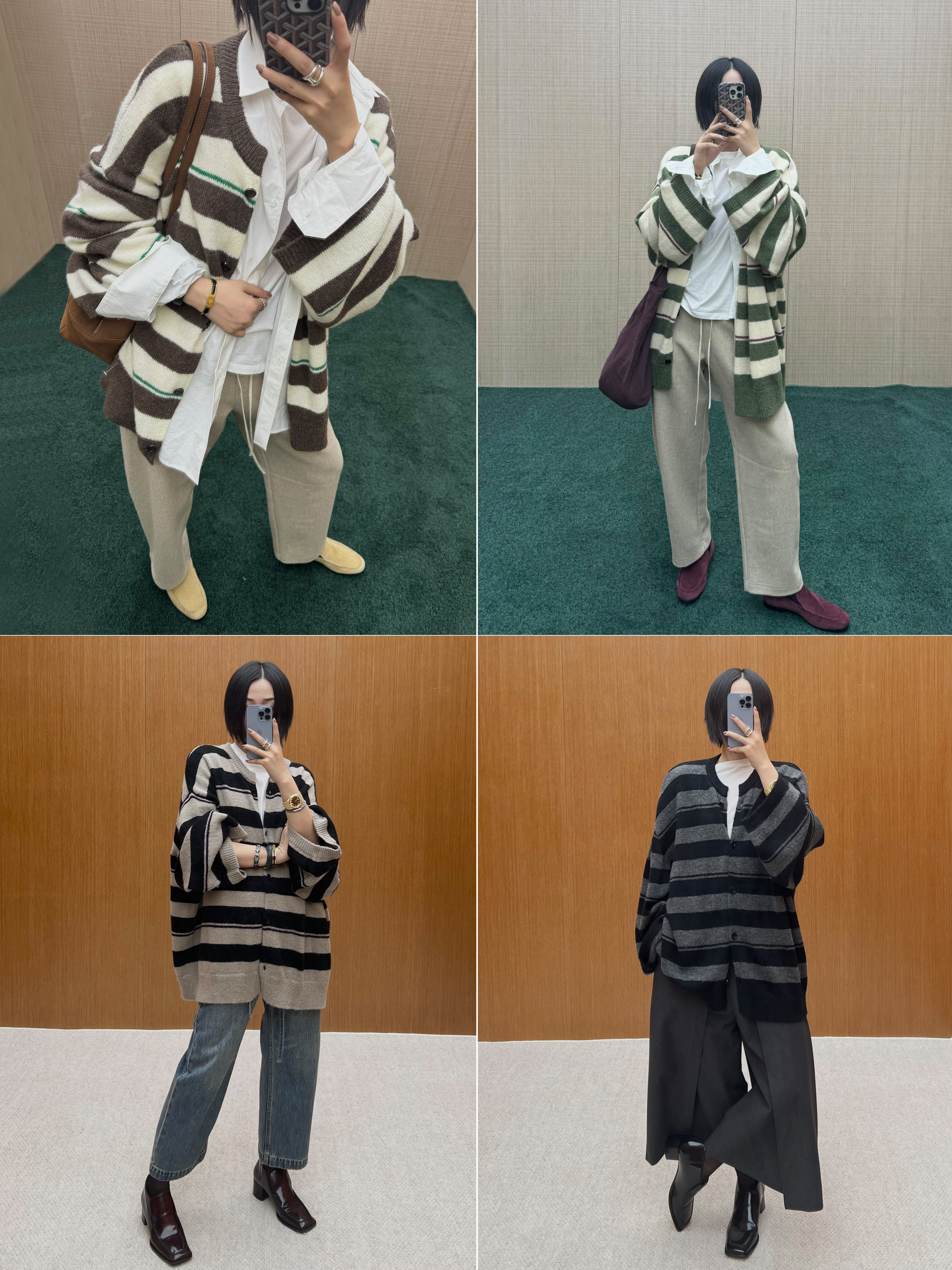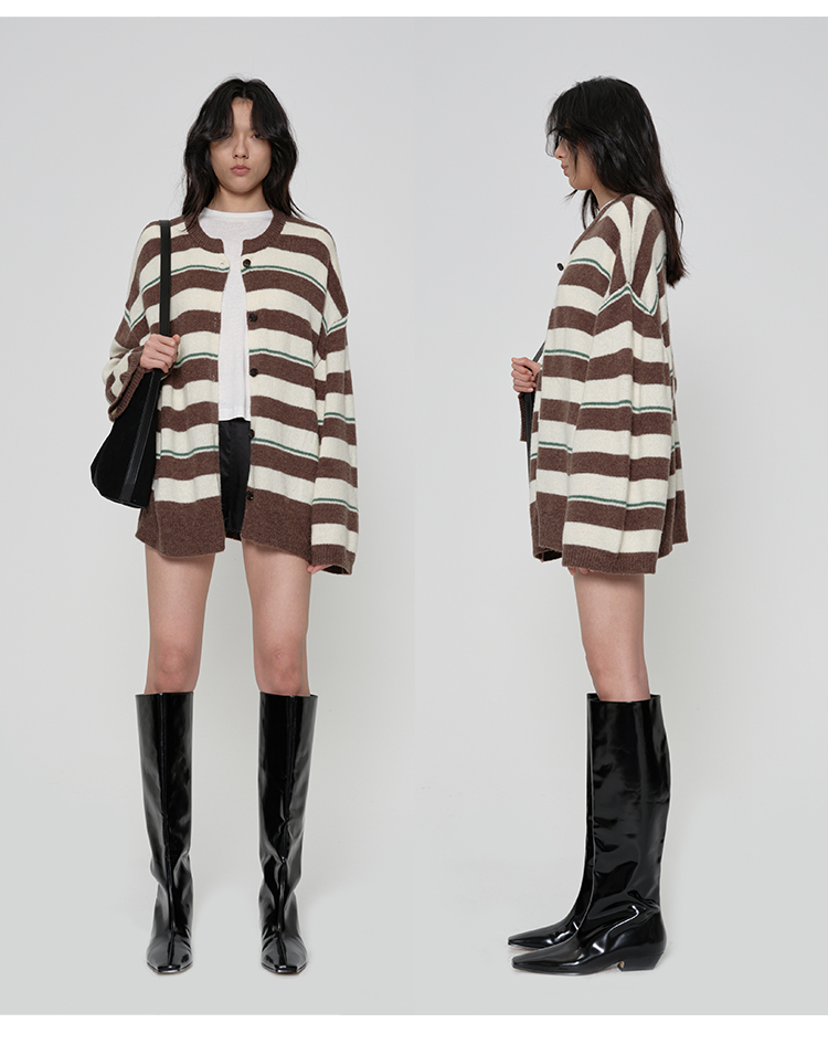 HIDEMI 【当当同款】进口羊驼毛混纺多股纱线条纹松弛感大廓形圆领纽扣开衫外套 黑灰条纹/绿紫条纹/棕绿条纹/灰粉条纹