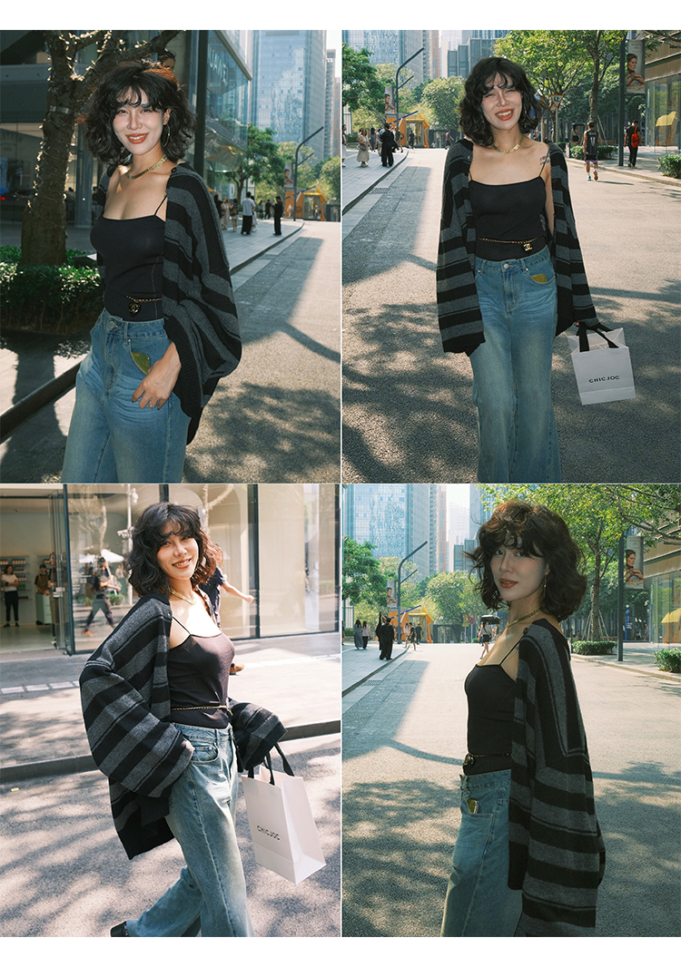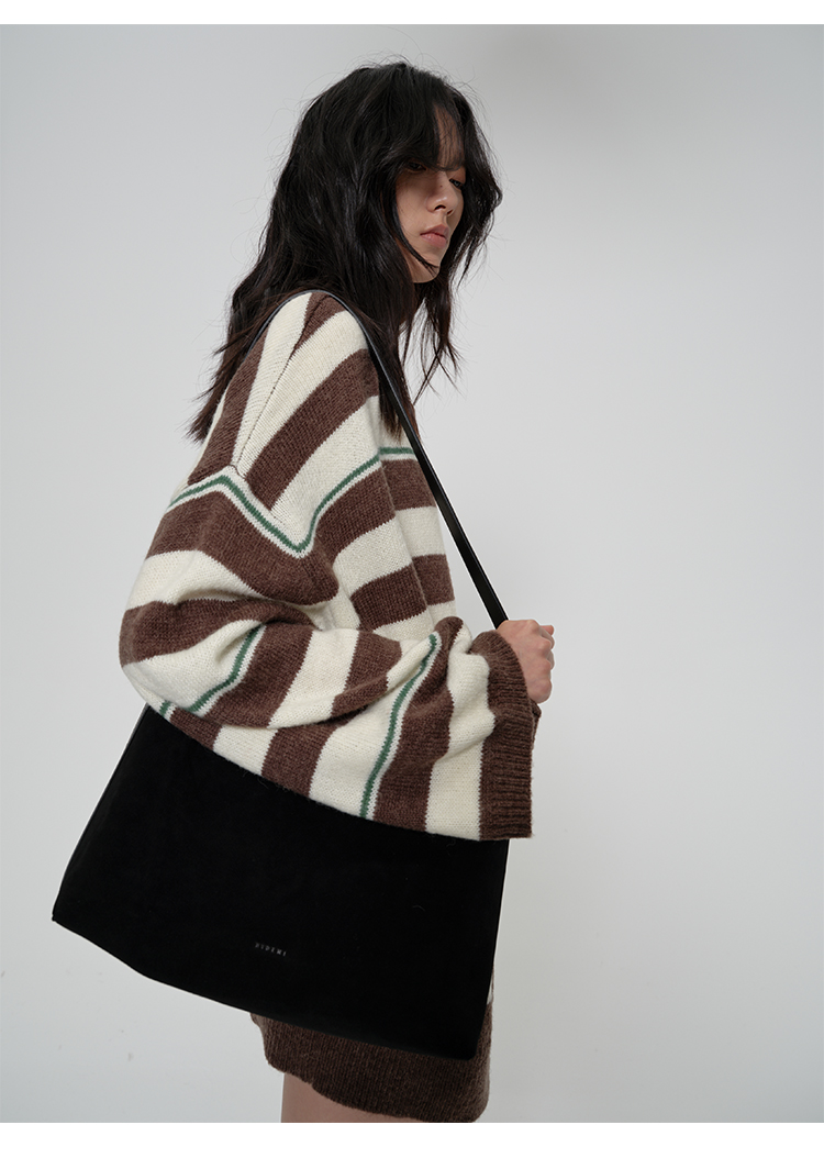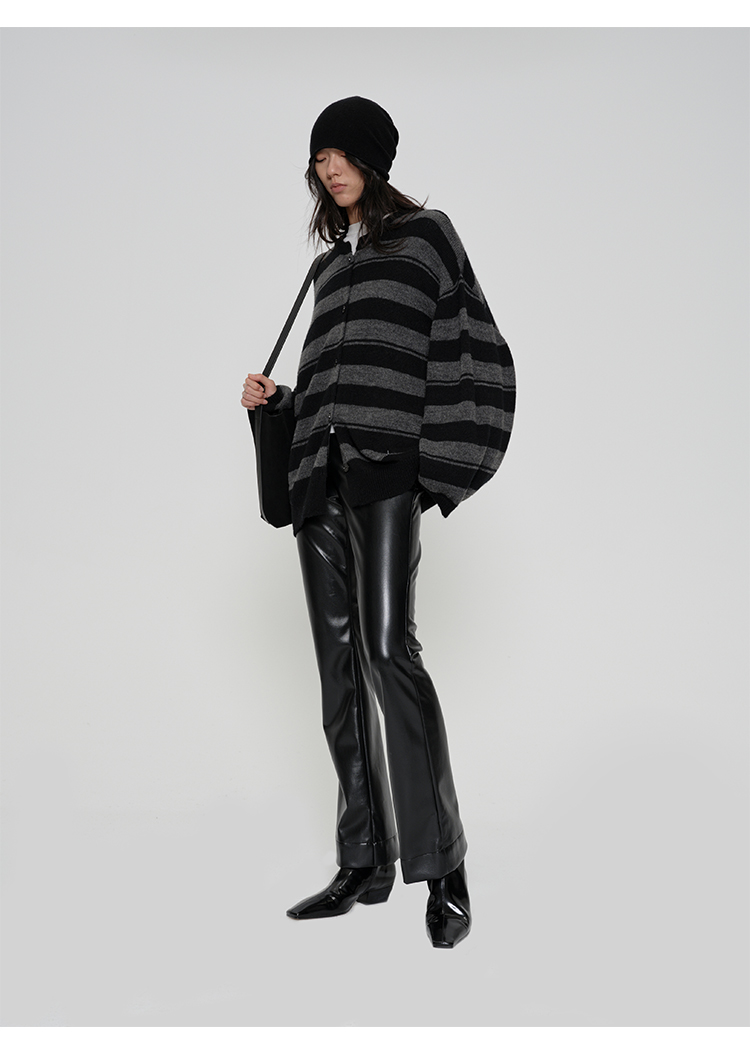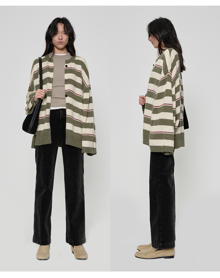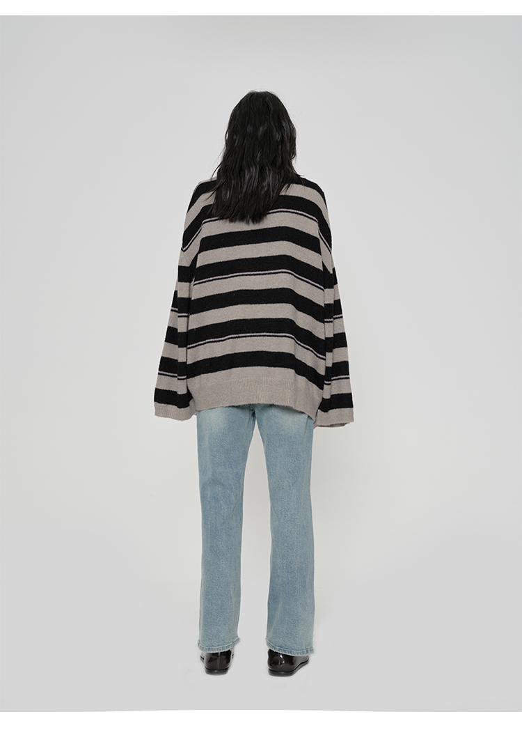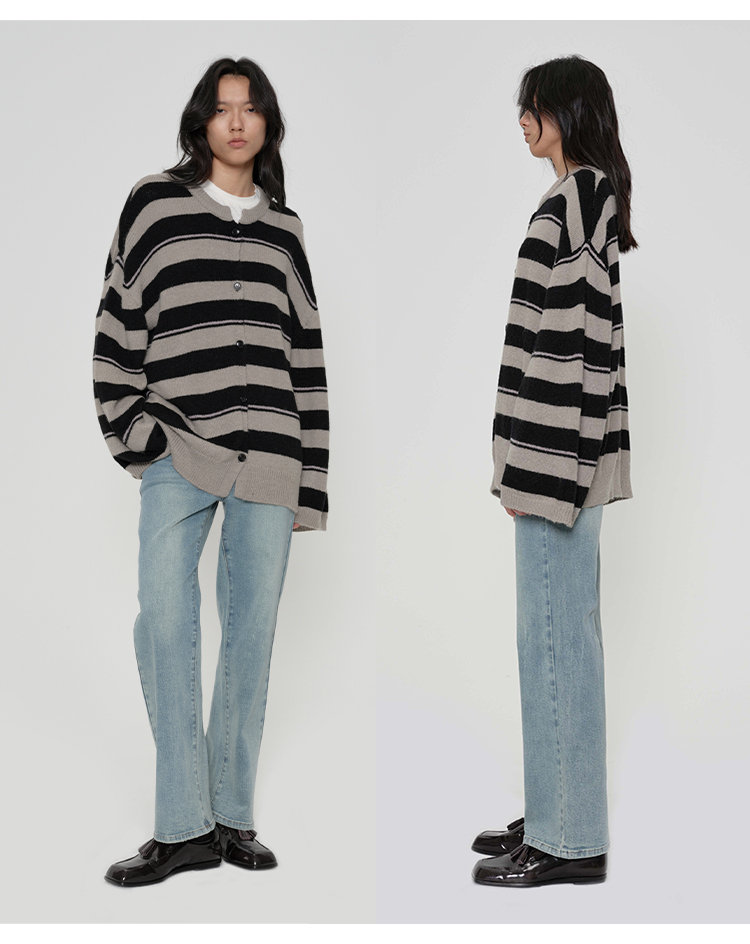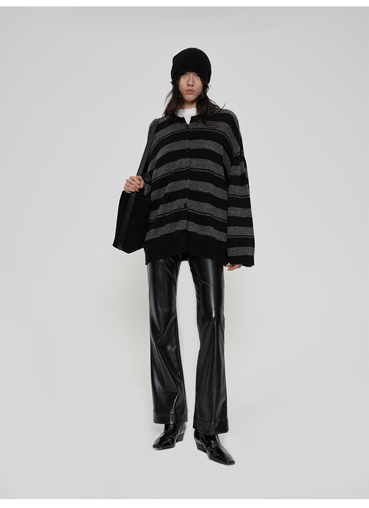 HIDEMI 【当当同款】进口羊驼毛混纺多股纱线条纹松弛感大廓形圆领纽扣开衫外套 黑灰条纹/绿紫条纹/棕绿条纹/灰粉条纹