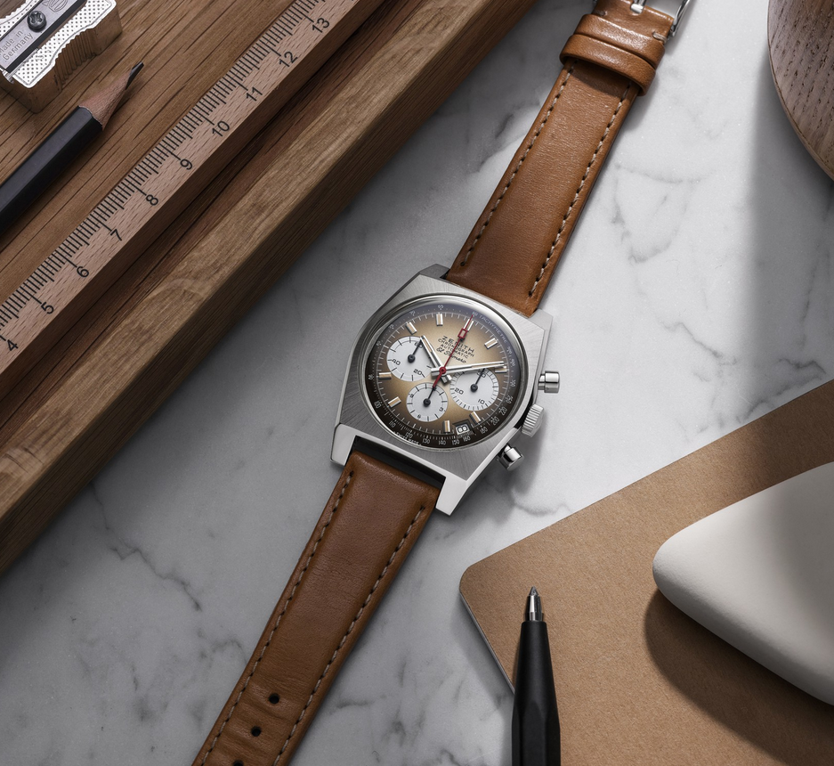 镜面 材质 | 蓝宝石水晶玻璃 | 表盘 | 精钢表壳 烟棕色渐变表盘,搭配白色计时盘;时标:镀铑刻面,涂覆米色Super-LumiNova®SLN夜光物料;指针:镀铑刻面,涂覆米色Super-LumiNova®SLN夜光物料 计时 日期显示 背透 |