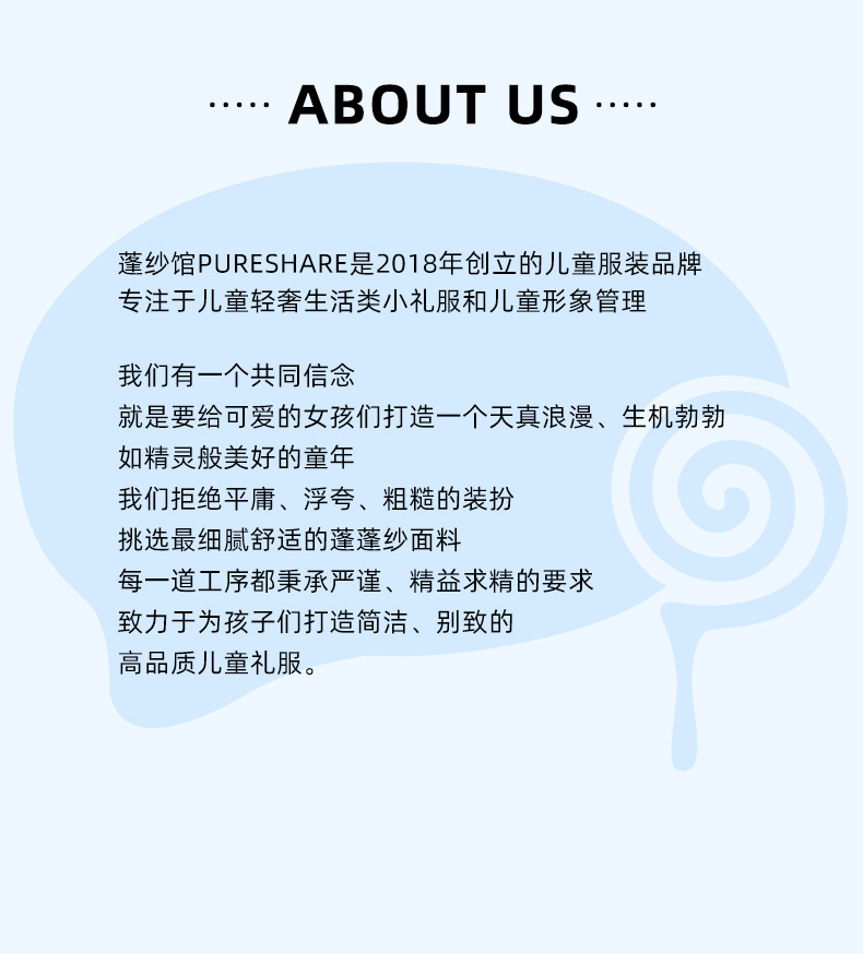 PureShare蓬纱馆,2018年创立的儿童服装品牌,专注于儿童轻奢生活类小礼服,主张“让孩子做最独特的自己”的品牌理念,为孩子们提供时尚简洁、优雅而又不失童真的生活类礼服。