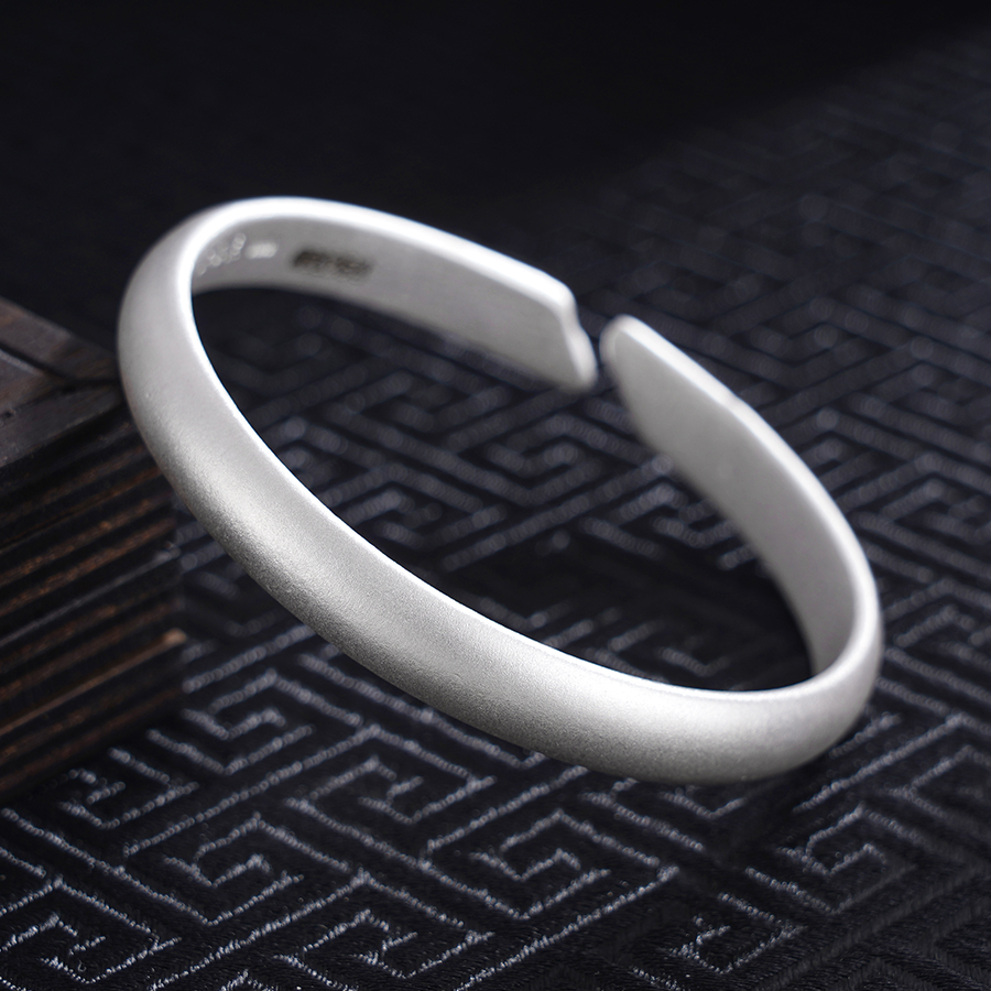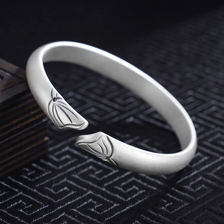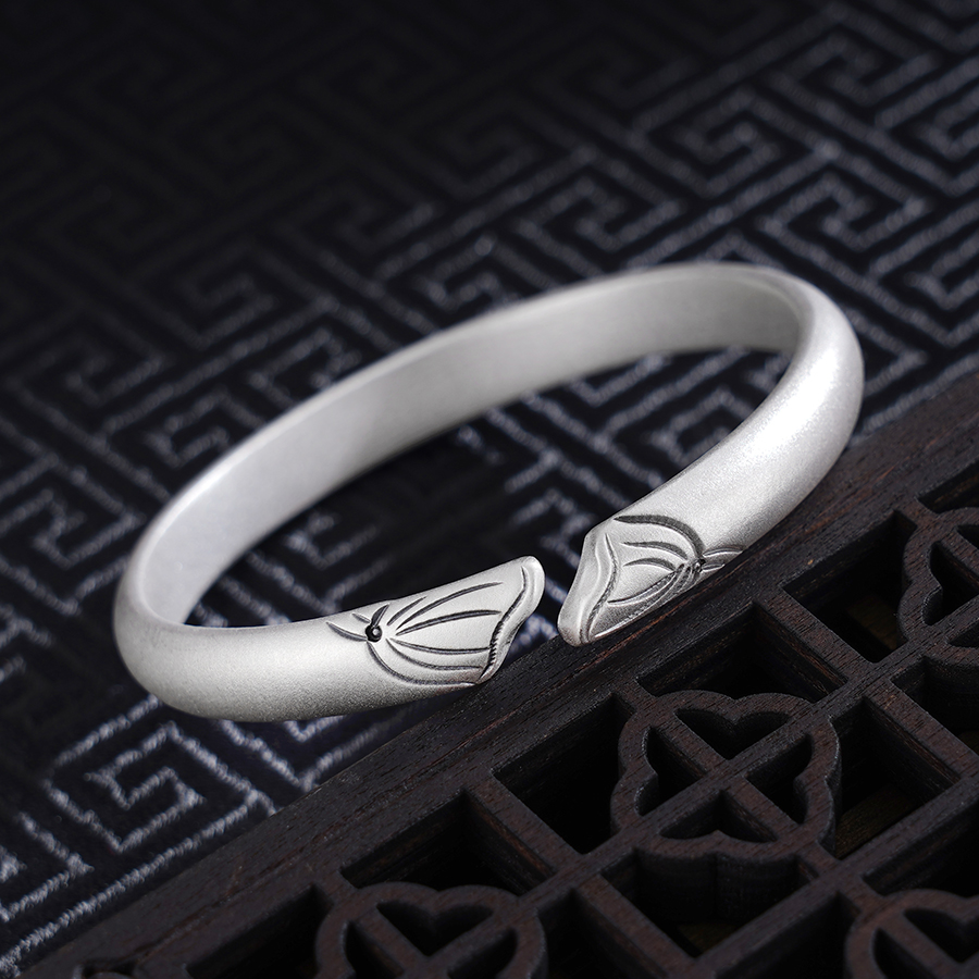 【寓意】:纯银开口手镯,开口之处錾刻两颗莲蓬,既含连生贵子之吉兆,亦喻夫妻和合、福禄双至。
