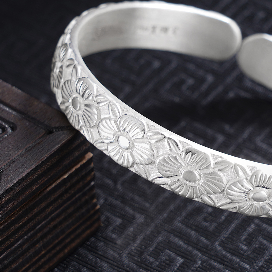 【寓意】:子佩集匠心手作银镯,采用成都金银器制作技艺,于镯体之上錾刻繁花纹样。繁花绕腕,寓意花开年年,美丽绵延。