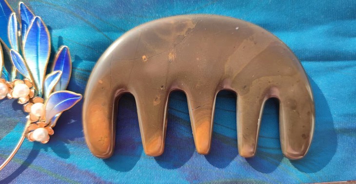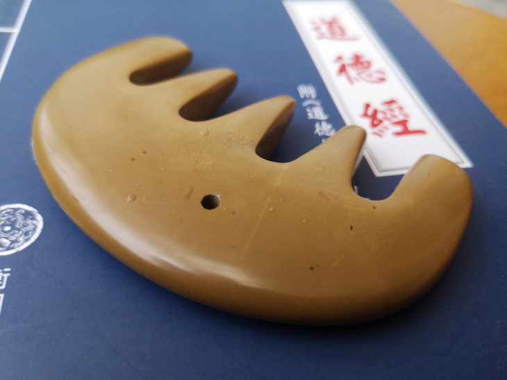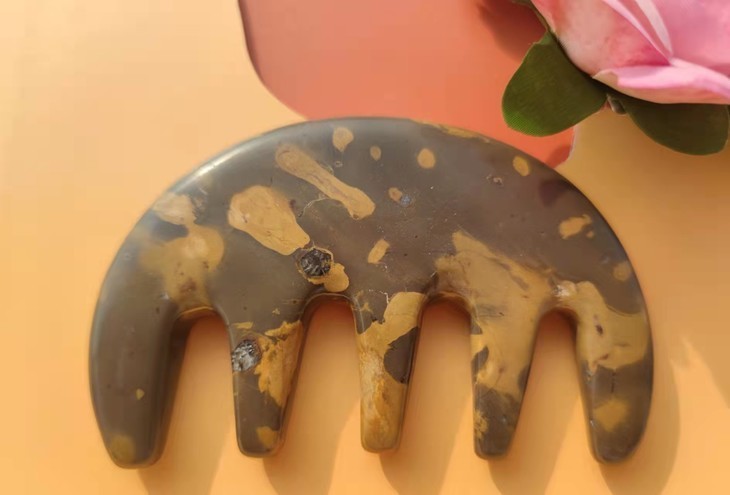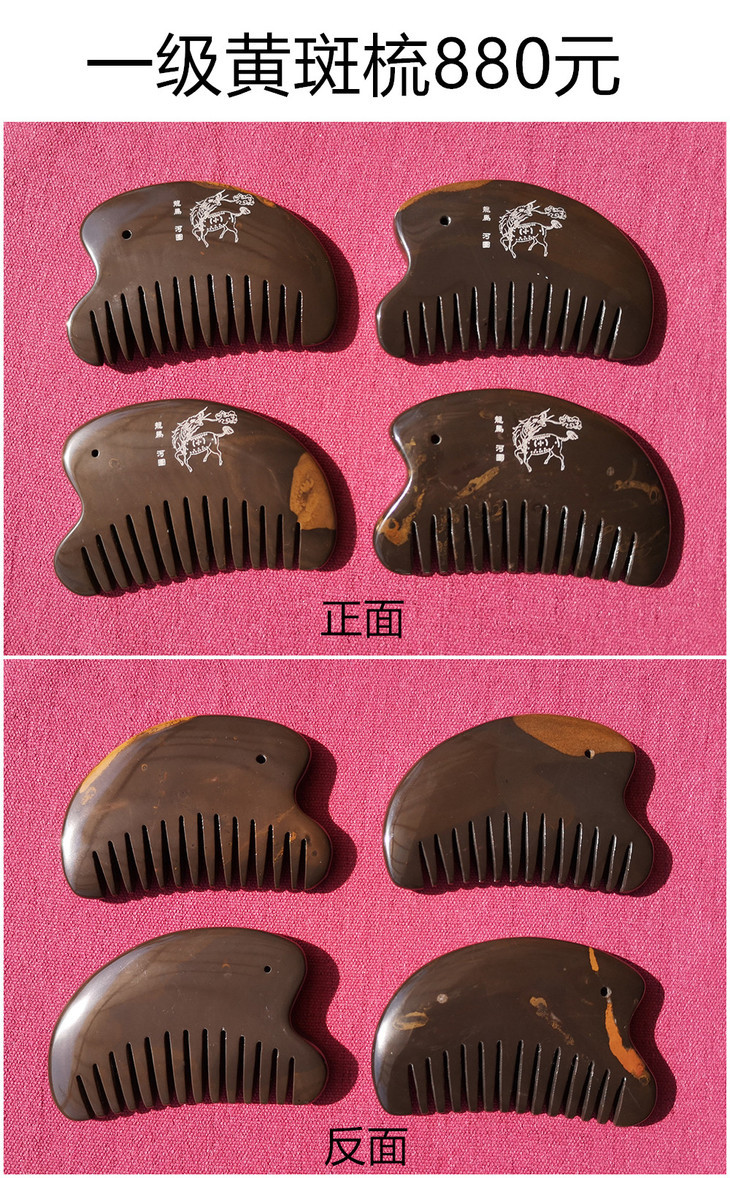和玉一样,每块花纹都是独一无二。黄斑越多的砭石,能量场更大,价格就越贵
